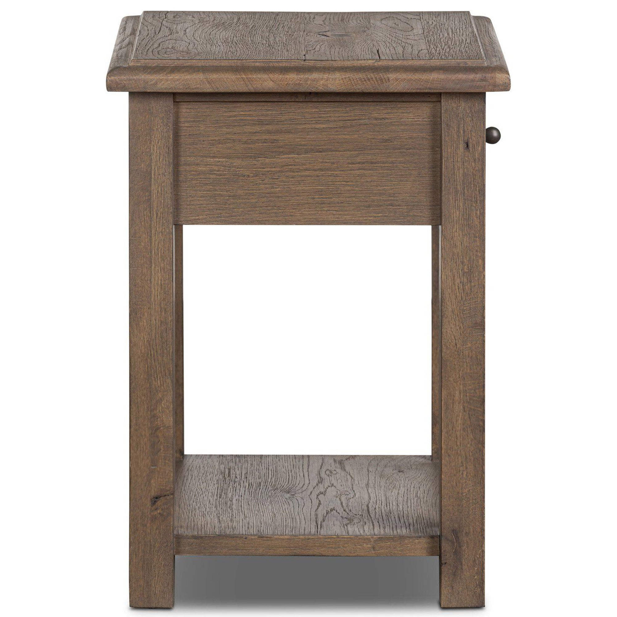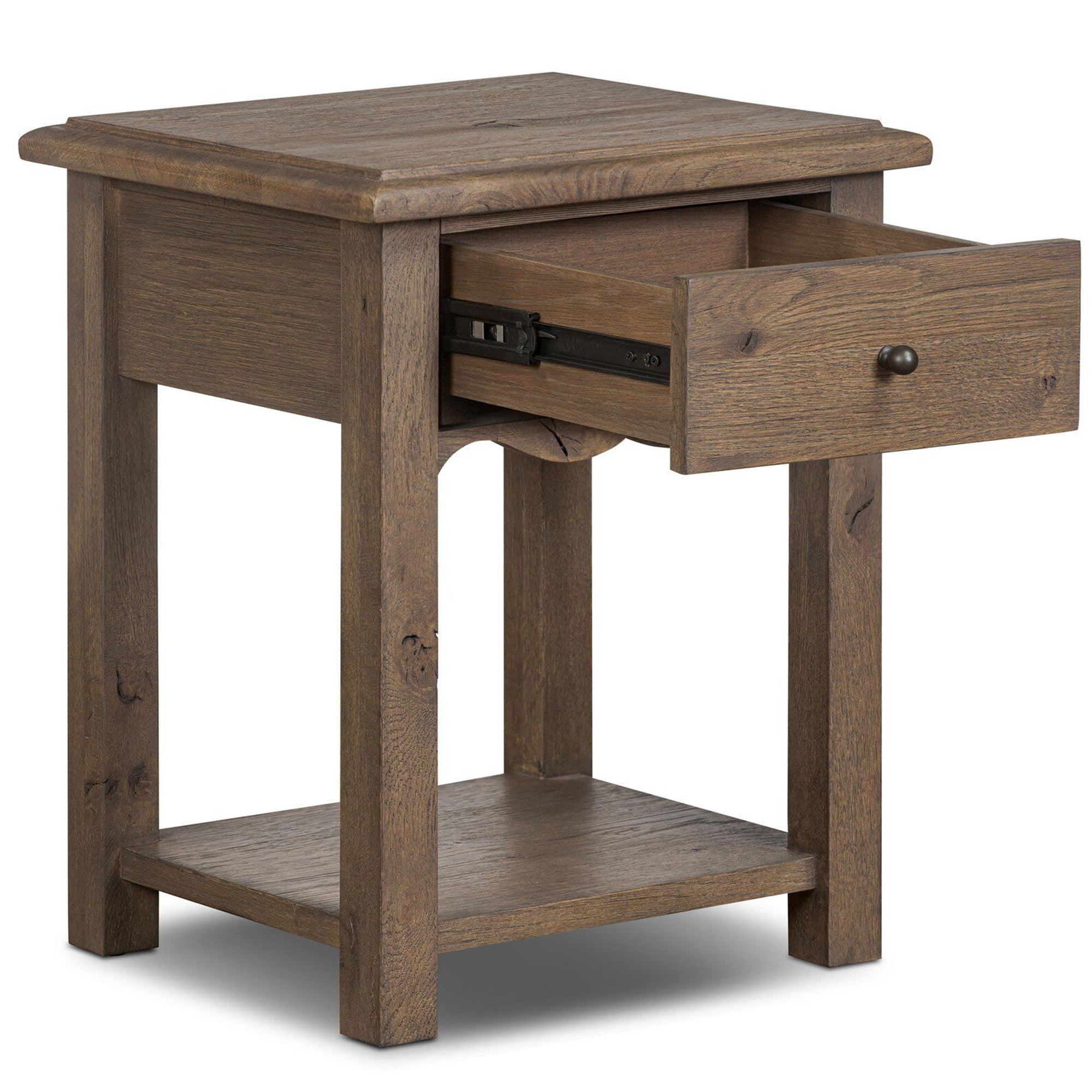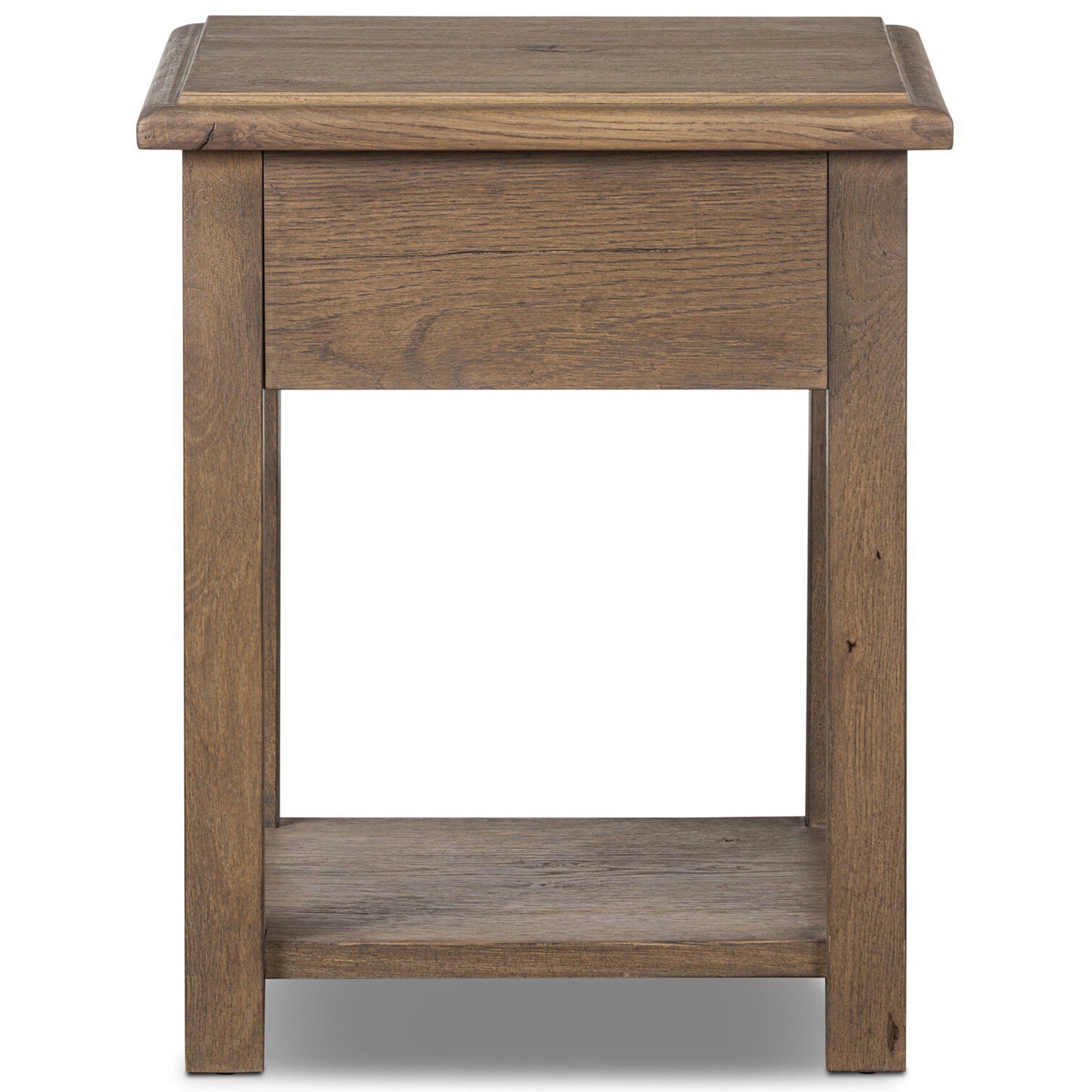The Bayla End Table brings timeless character to smaller spaces. Crafted from solid and veneered oak in a weathered finish, it features an overhang top, a decorative apron, and a single drawer with metal glides for smooth operation. A lower shelf provides additional storage or display space, blending functionality with refined, classic style.