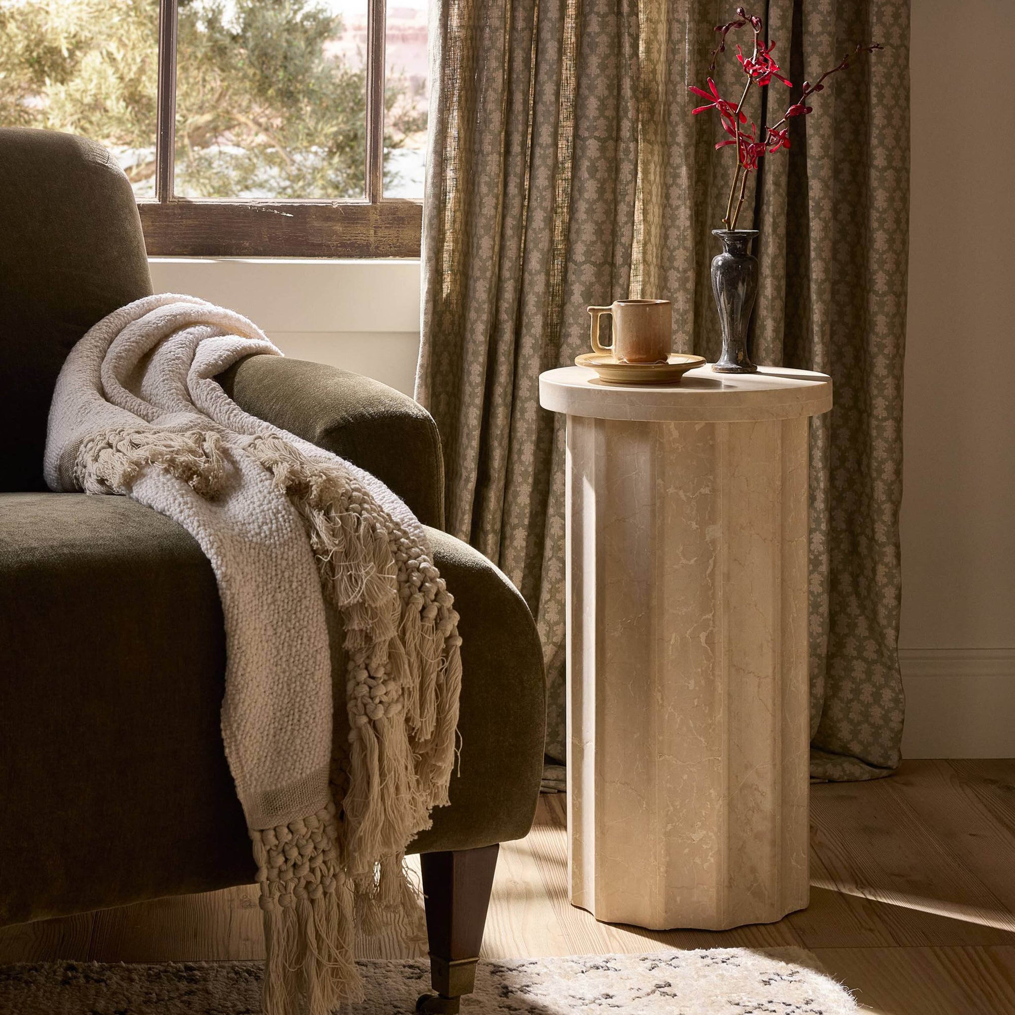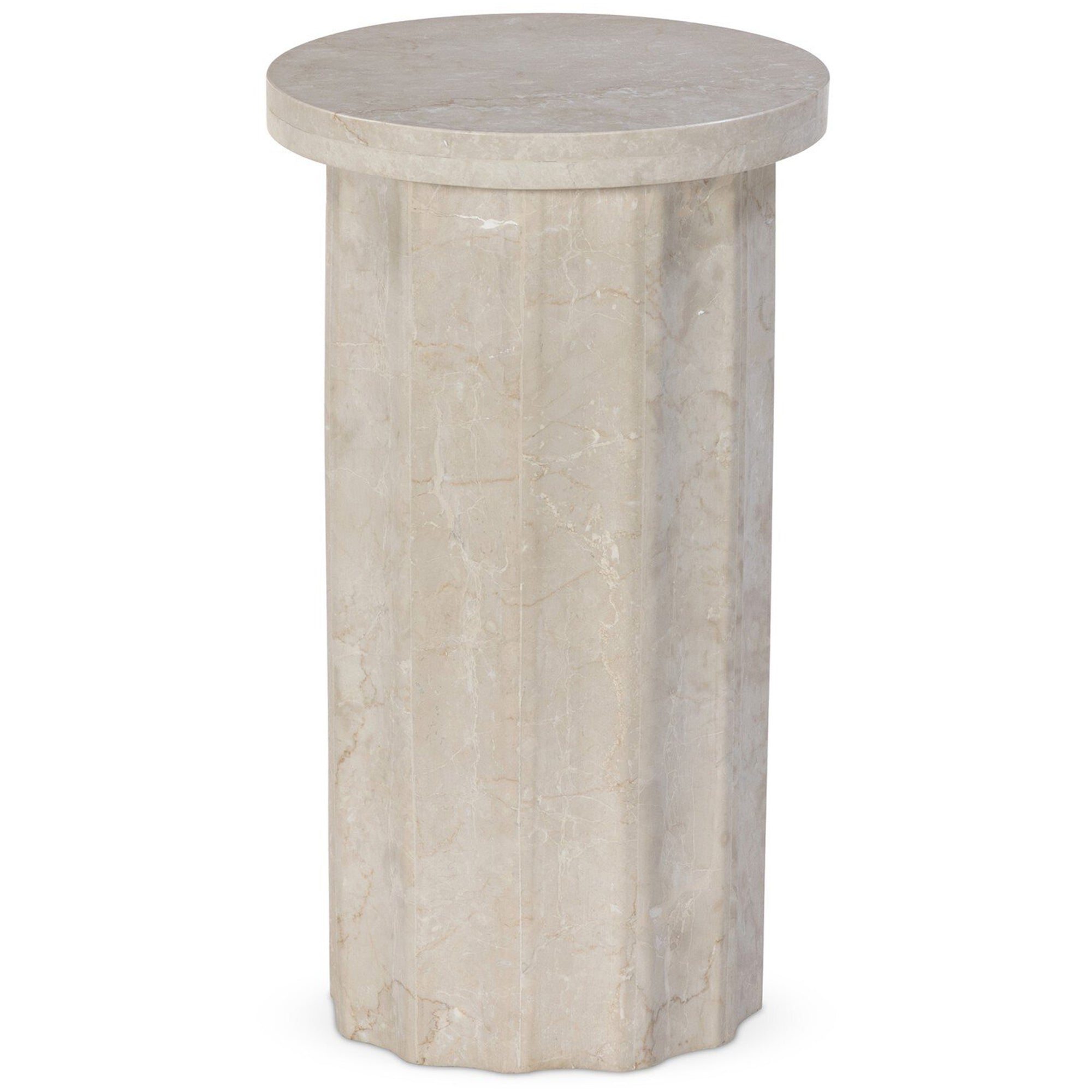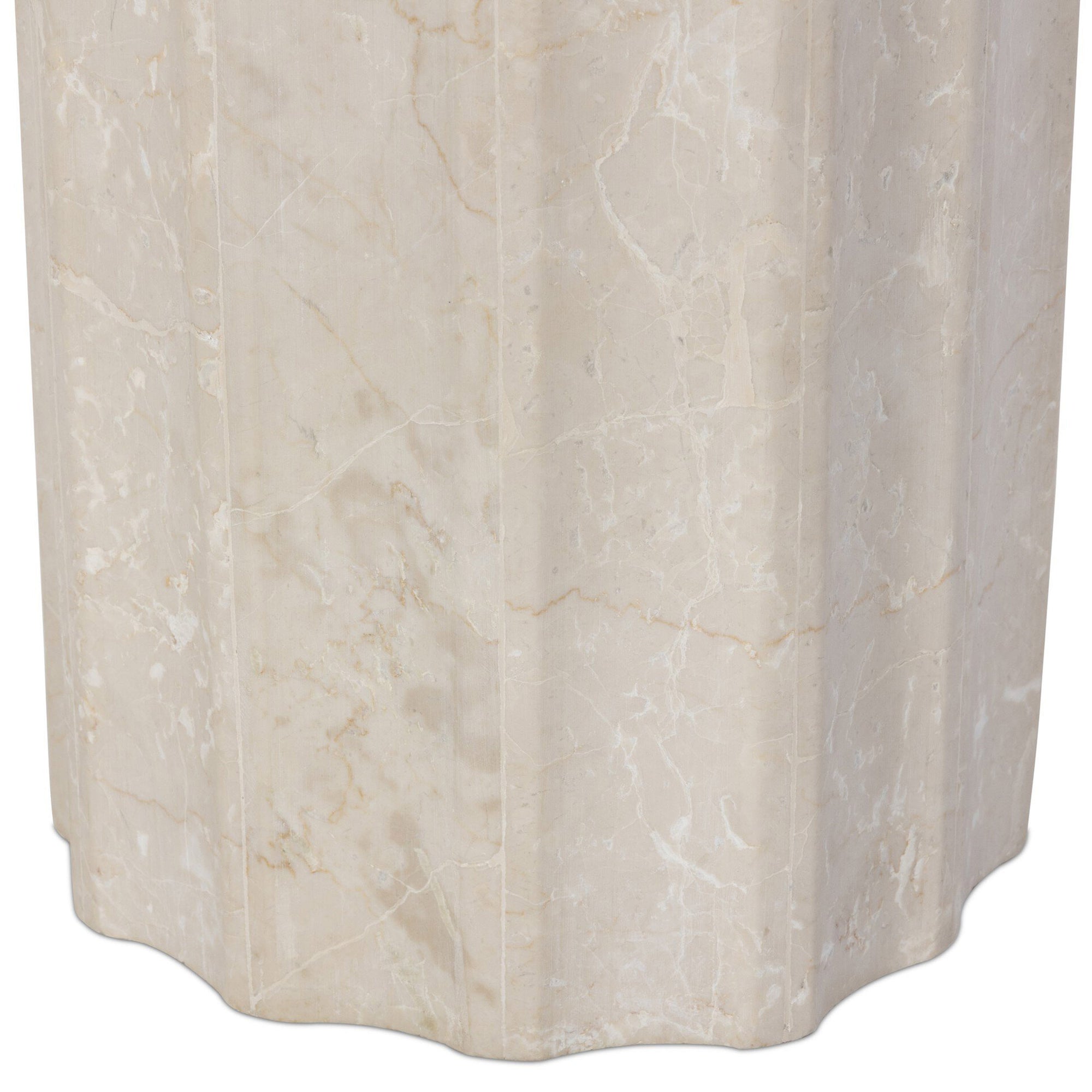 The Bibi Drink Table will elevate any space with its column shape crafted from luxurious cream marble. The table features subtle scalloping for a touch of refined texture. Smaller in scale, this piece is perfectly sized to serve as an accent table, keeping your favorite drink within easy reach.