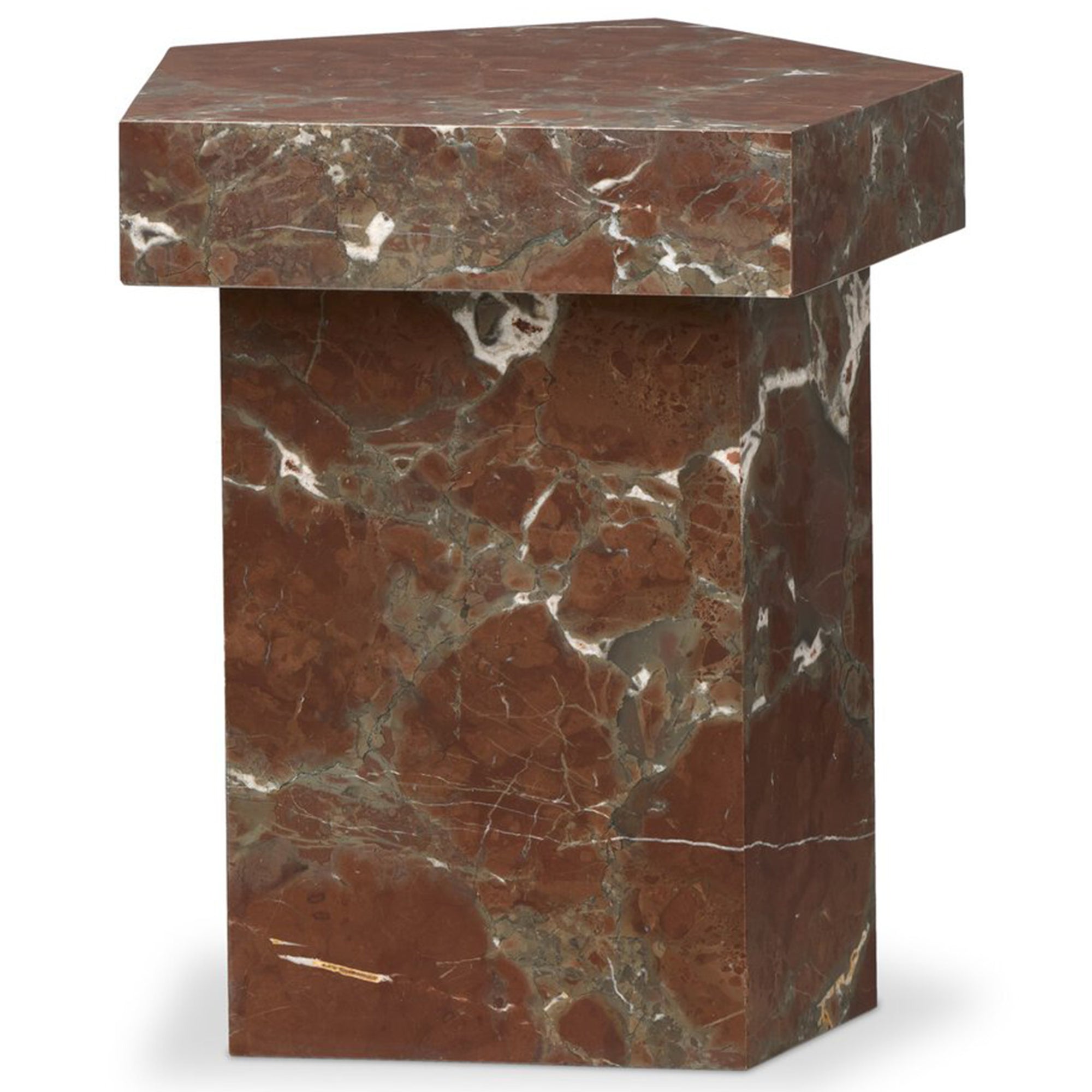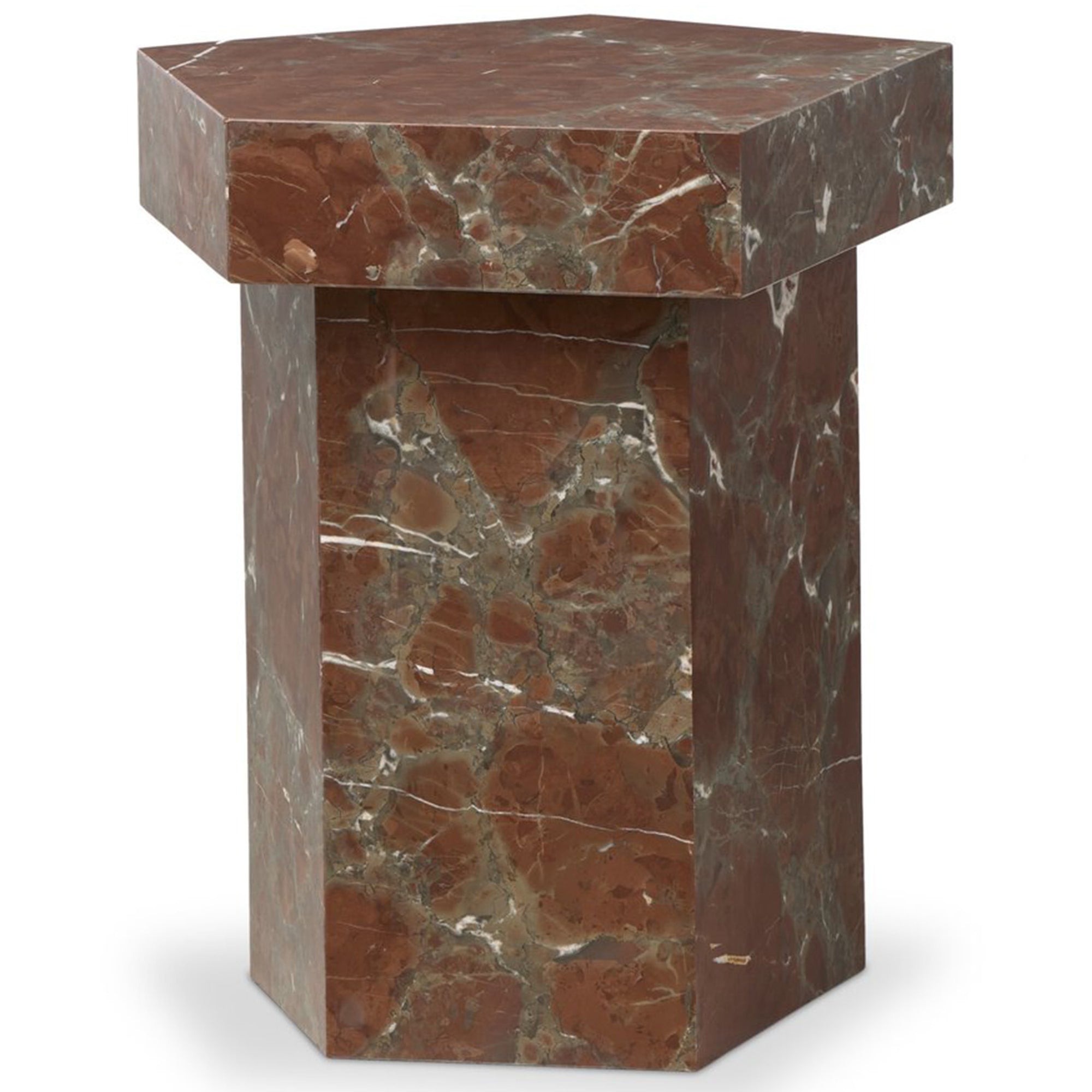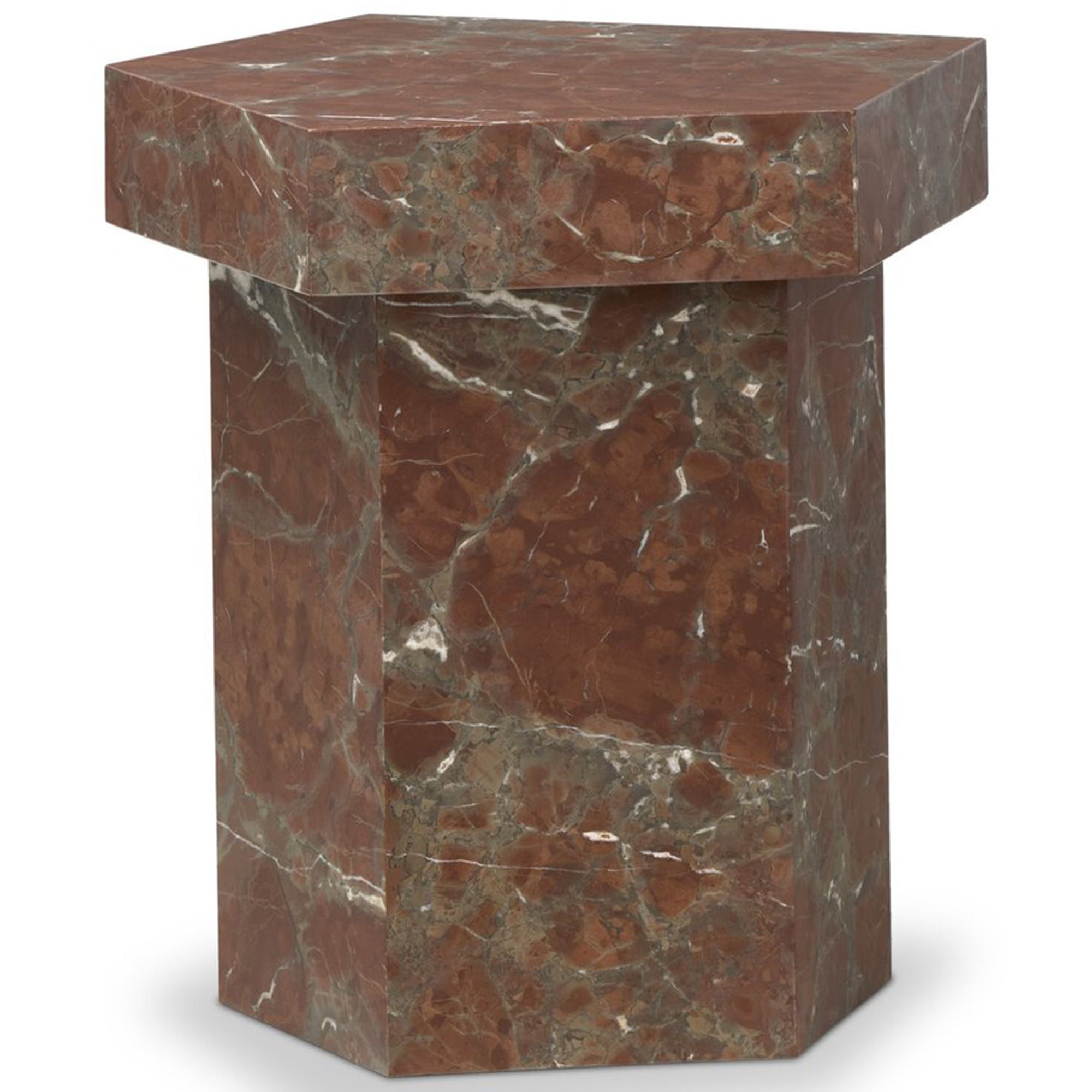 The Brando End Table brings sculptural elegance to any space with its irregular pentagon shape and rich natural veining in smoke and russet marble. Crafted entirely from solid marble, each piece is one of a kind in pattern and tone.