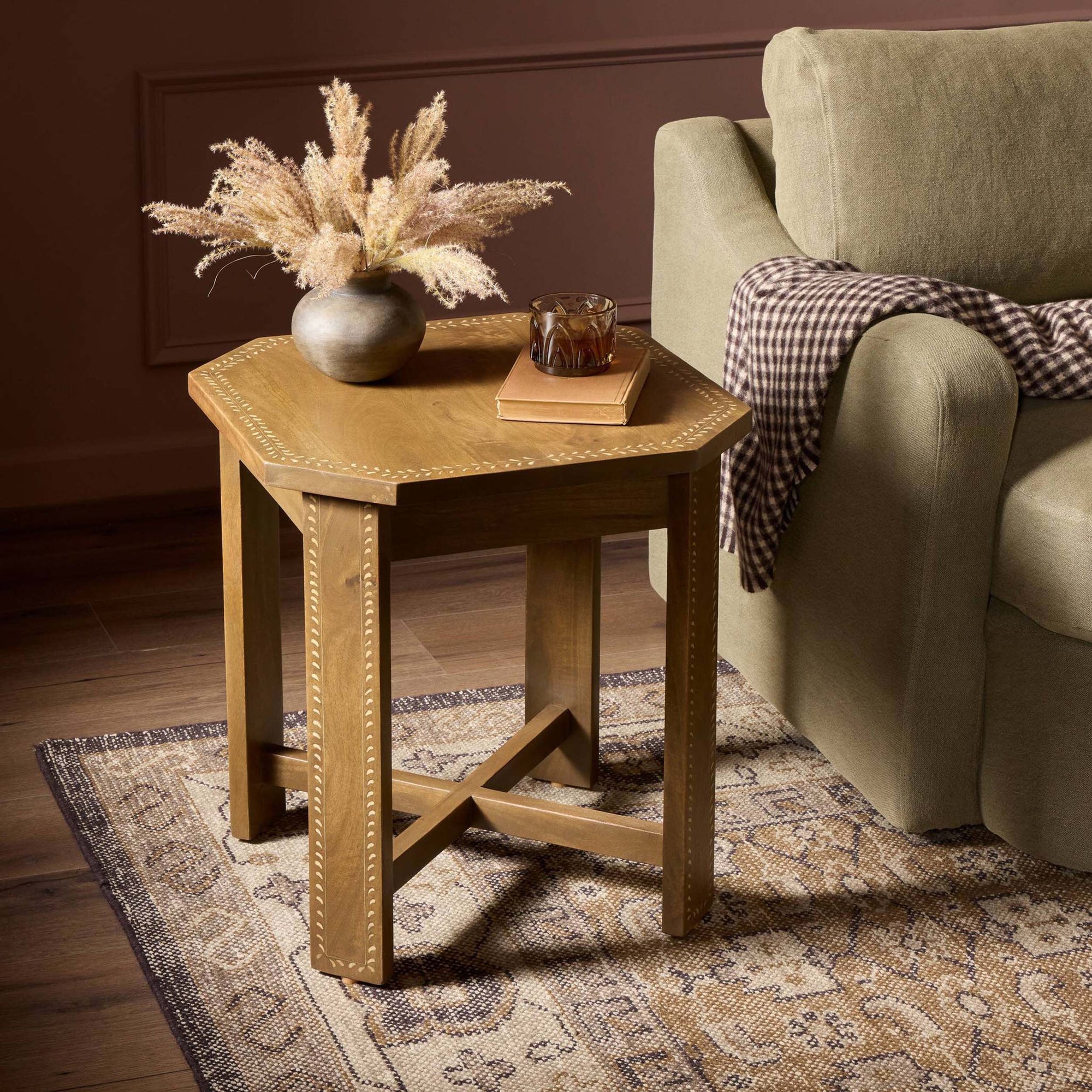 The Cantu End Table brings a modern twist to classic bone-inlaid design. Featuring chamfered corners, paddle legs, and a stretcher base, it provides a stylish and functional surface to keep books, drinks, or decor within easy reach.