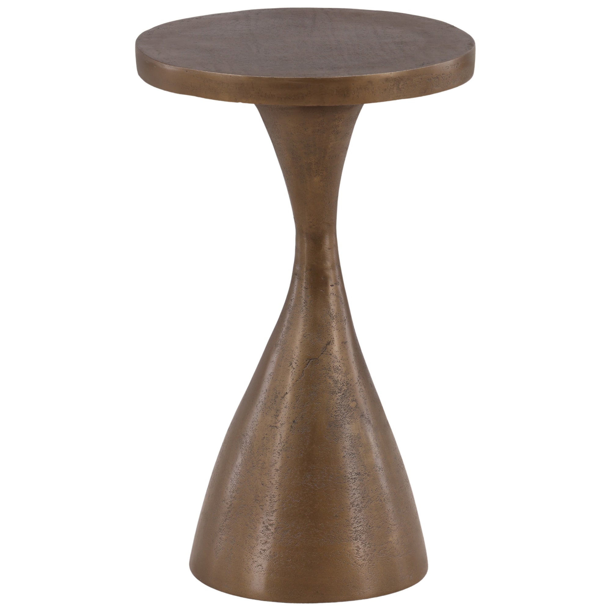 The Nara Side Table is a uniquely shaped accent piece that adds a touch of sculptural elegance to any room. Crafted from durable aluminum and coated in a warm antique brass finish, this table has a distinctive, modern presence. Its compact size makes it a perfect companion to an armchair or sofa, providing a stylish spot for a lamp or decorative object. The Nara Side Table's artistic form and metallic sheen make it a functional yet eye-catching addition to your decor.