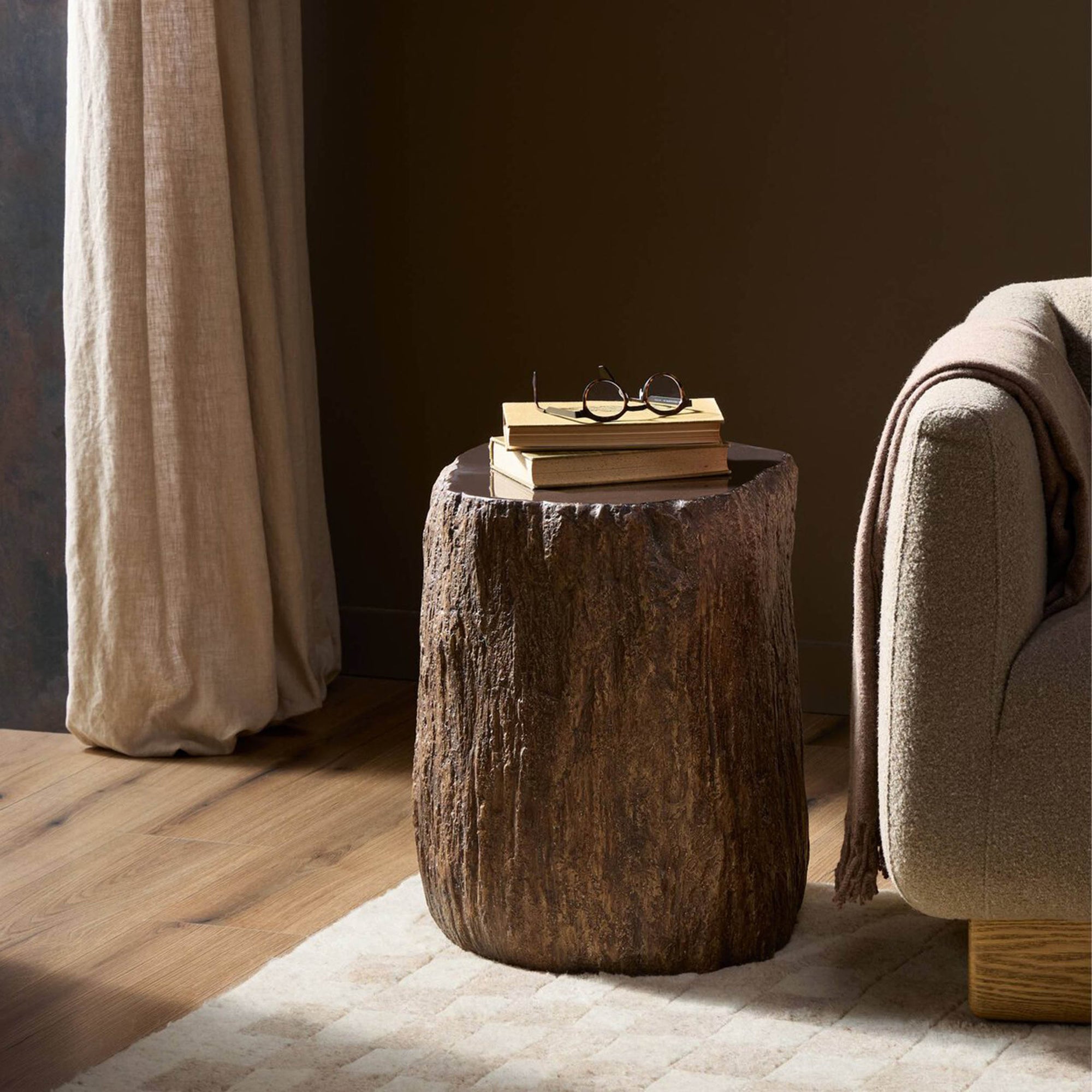 The Nemo End Table brings natural inspiration indoors with a drum-style silhouette crafted from solid concrete. A smooth, high-polish top contrasts a deeply textured base that mimics the feel of tree bark, creating both function and sculptural appeal.