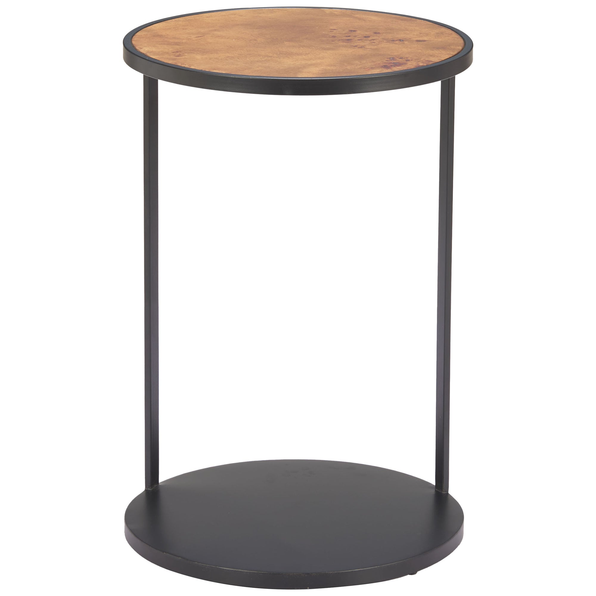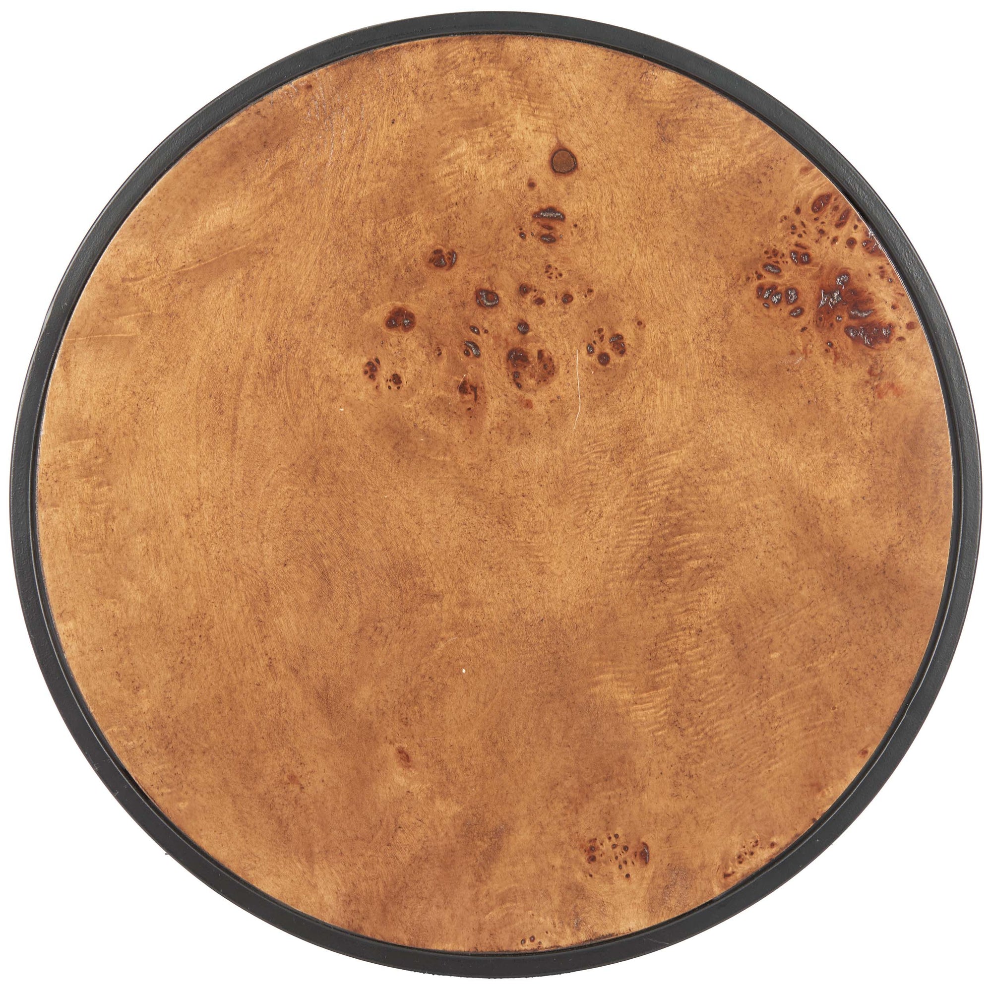 The Nodo Side Table combines modern charm with organic beauty, creating a refined look for any space. This elegant accent table features a rich burl veneer MDF top, showcasing unique and intricate wood grain patterns. The top is supported by a sleek, minimalist iron base in a contrasting black finish. Ideal for hospitality use or as a sophisticated addition to a living room or bedroom, the Nodo Side Table offers a perfect surface for a lamp, books, or a decorative object.