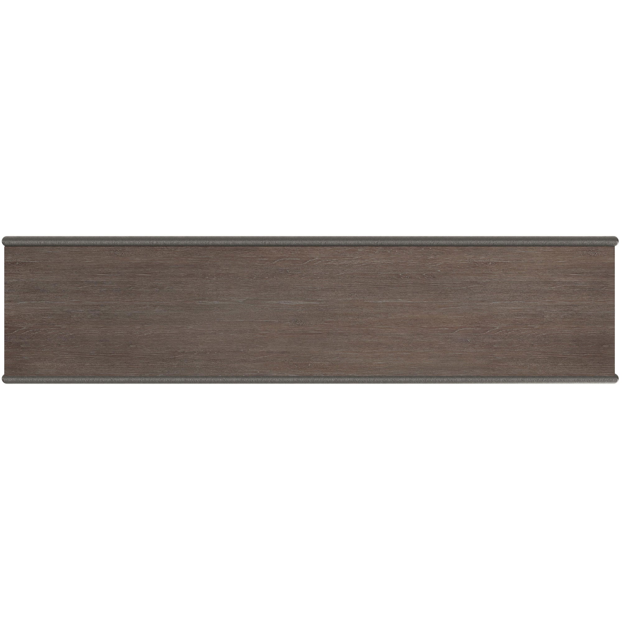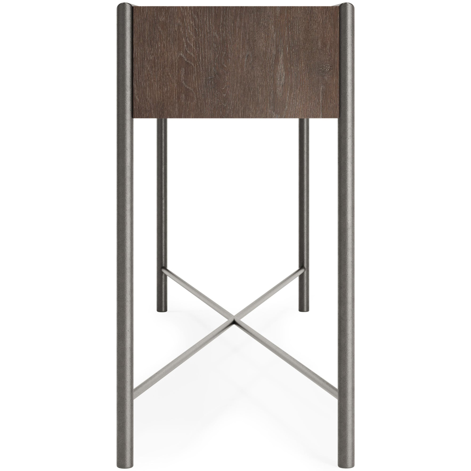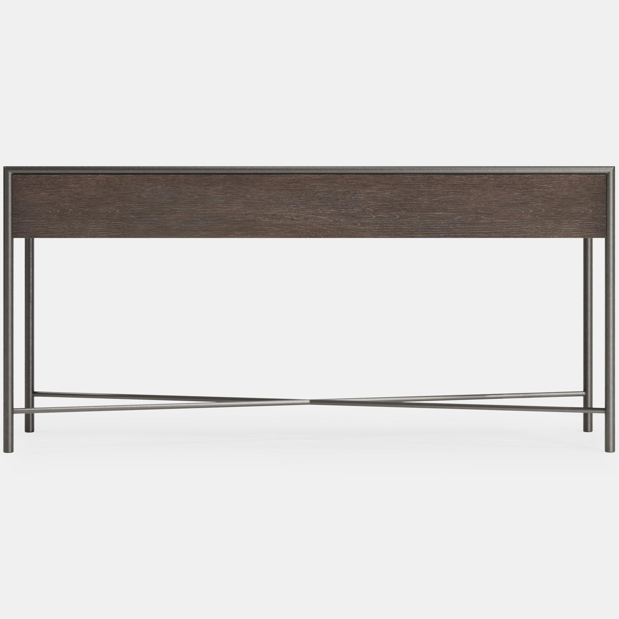The Outline Console Table features a distinctive metal frame that wraps around the wooden tabletop. The metal finished in Atra extends to the floor and crosses to form a sleek stretcher. The look is casual yet refined, showcasing minimalist style and expert craftsmanship.