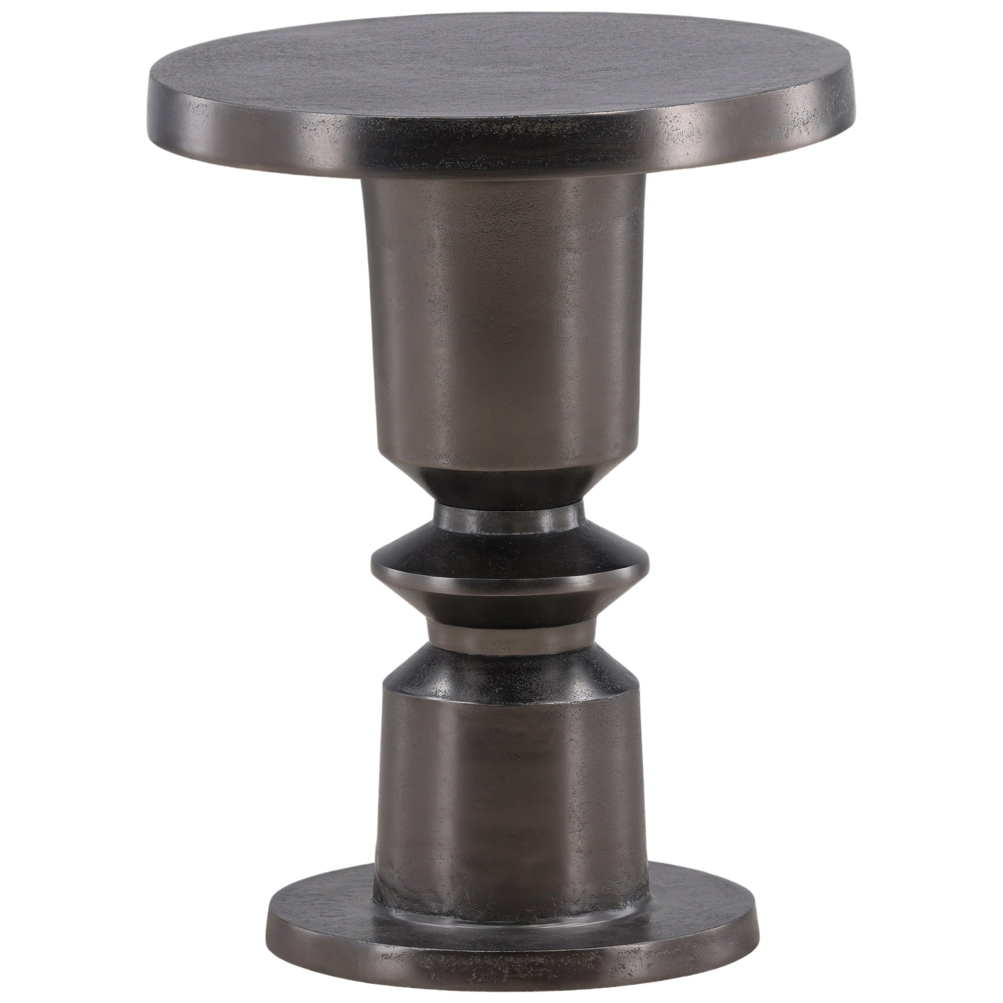 The Samira Side Table features a sleek aluminum design finished in antique black. Its round shape and compact form make it a versatile accent for any living area, offering both style and functional surface space.