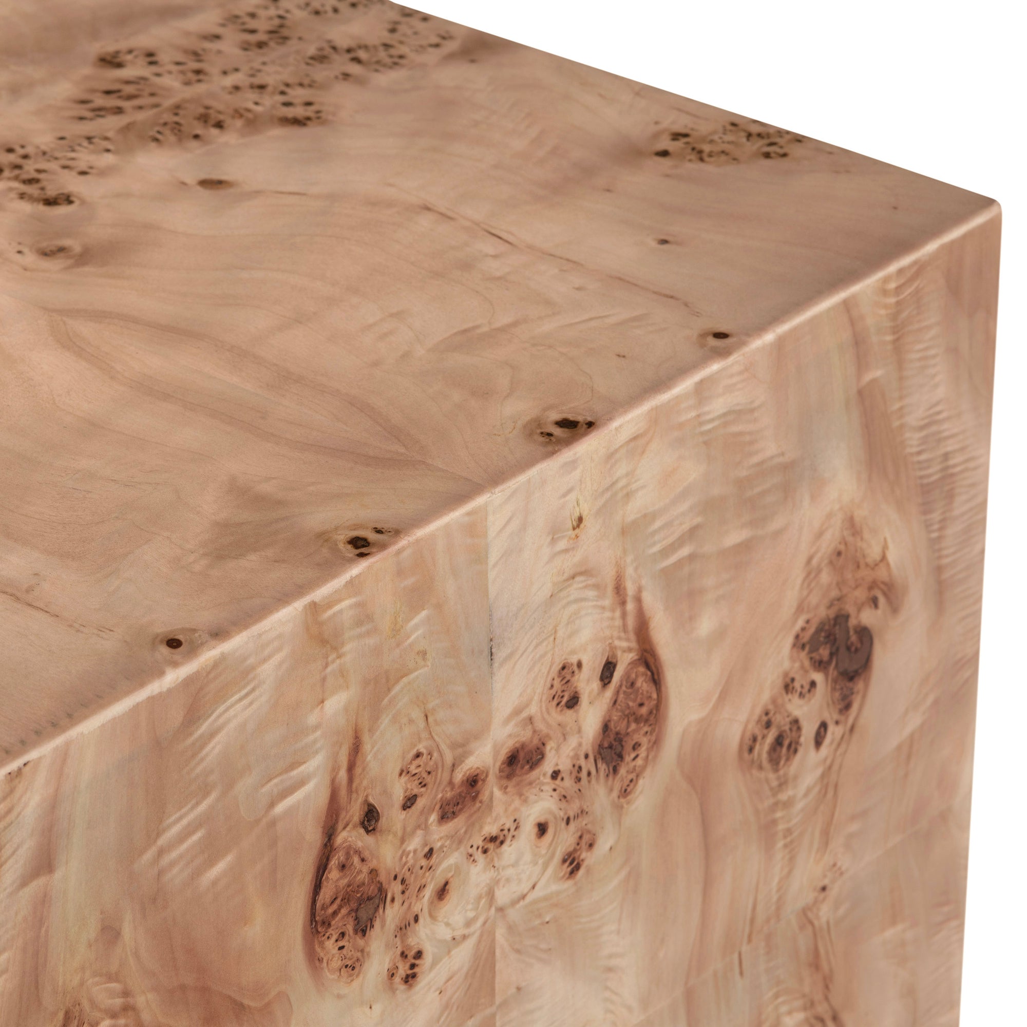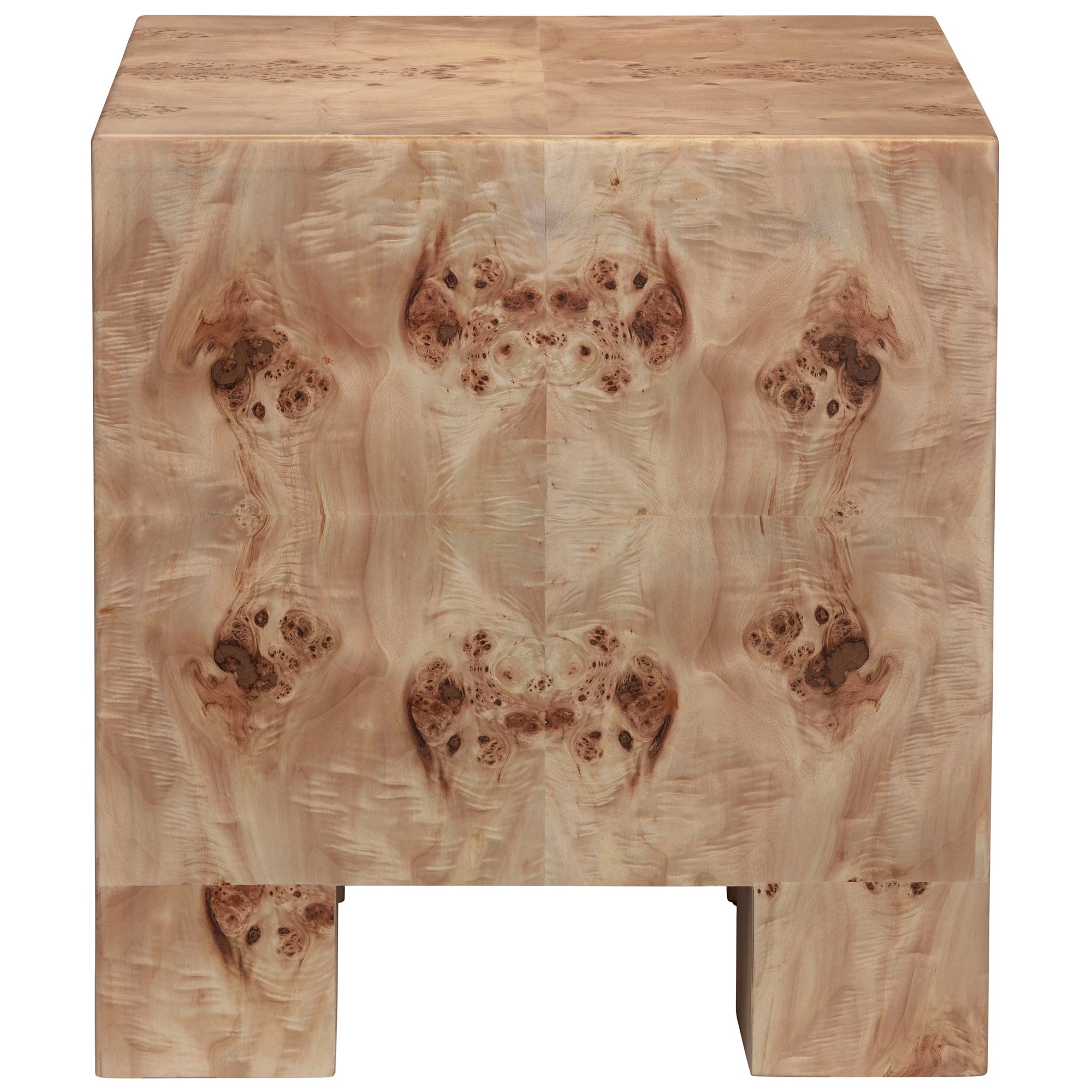 The Sutherland End Table showcases clean lines and a lacquered natural finish, offering a versatile accent for living spaces. Its compact square shape makes it perfect beside sofas or chairs.
