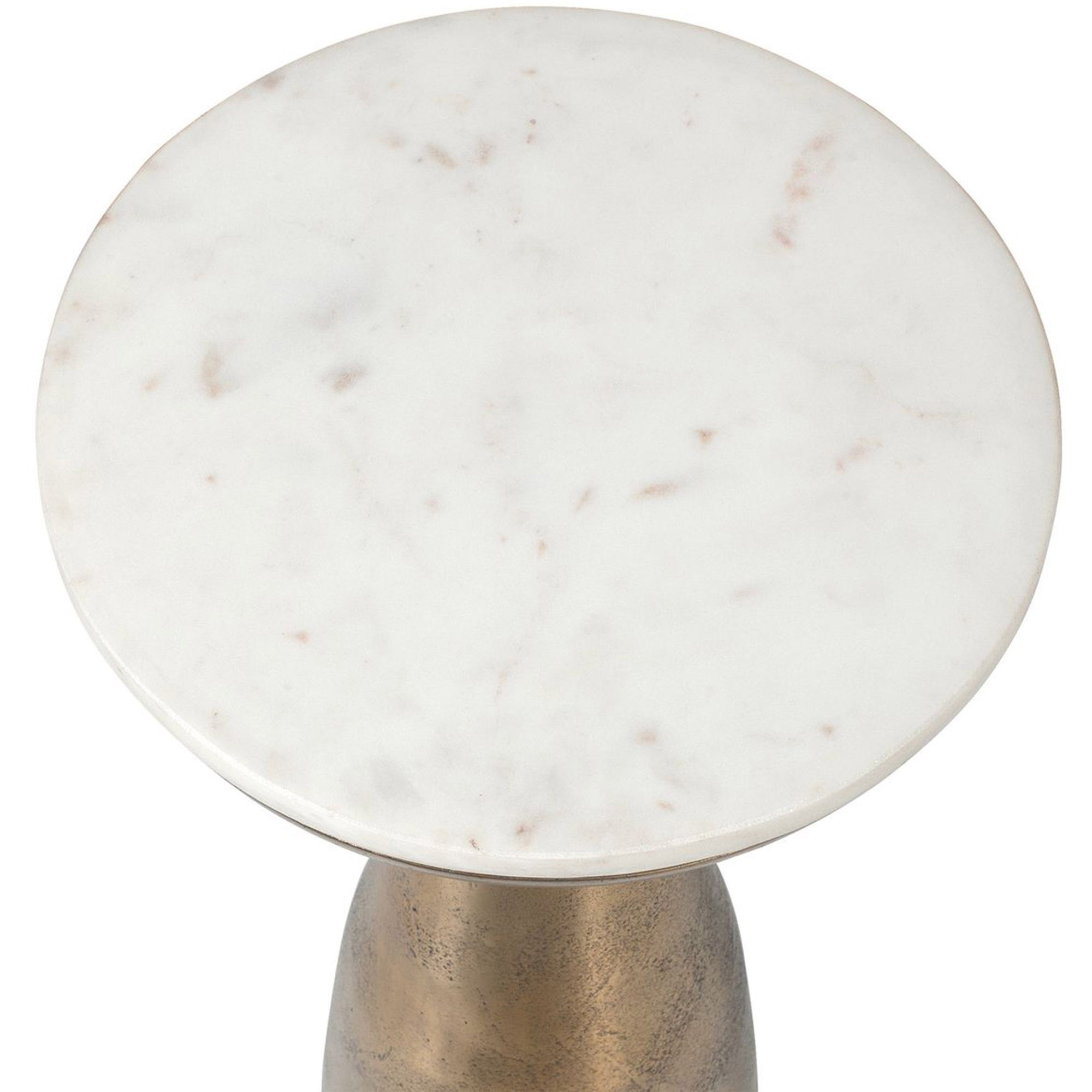 The Torin Drink Table is a study in sophisticated simplicity, designed to elevate your living space. Its sleek silhouette features a gracefully tapered base, expertly cast from aluminum and finished in a warm antique brass. This elegant stand is topped with a solid white marble slab, whose natural veining ensures that each piece is entirely unique.