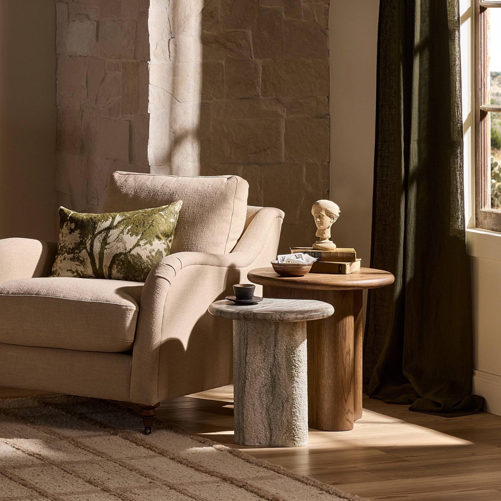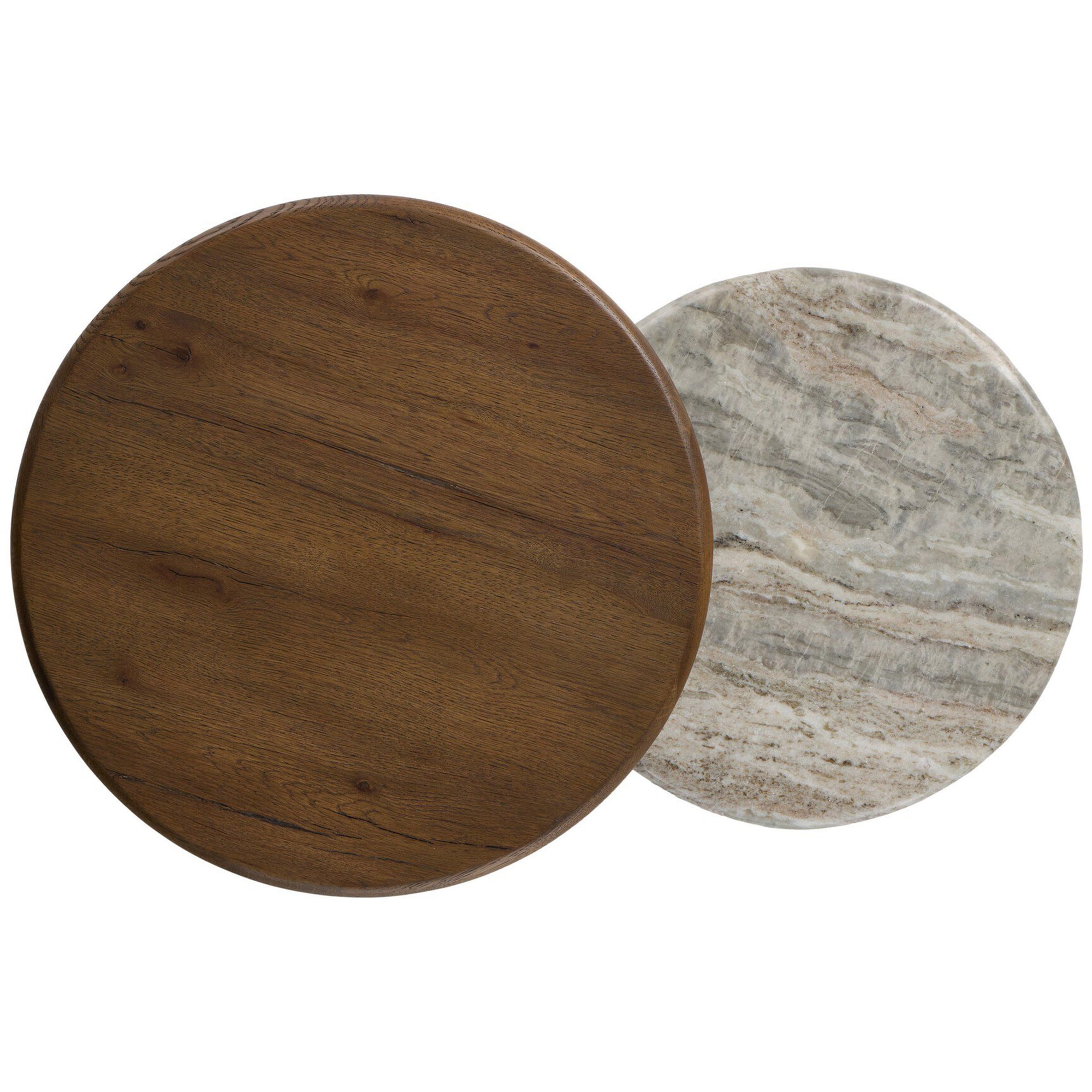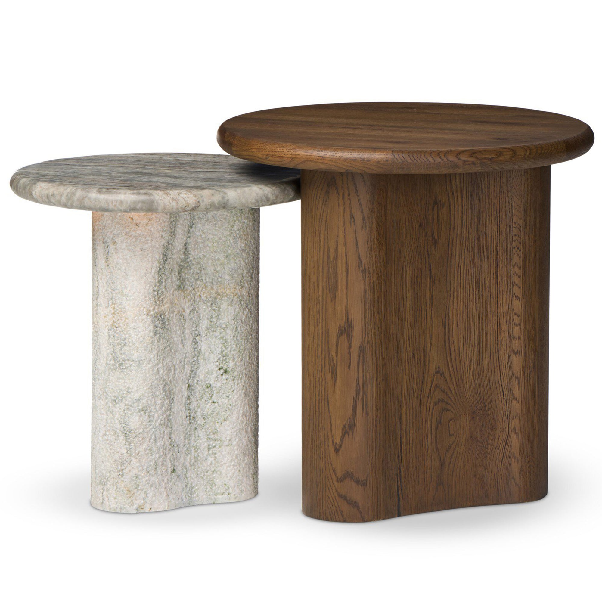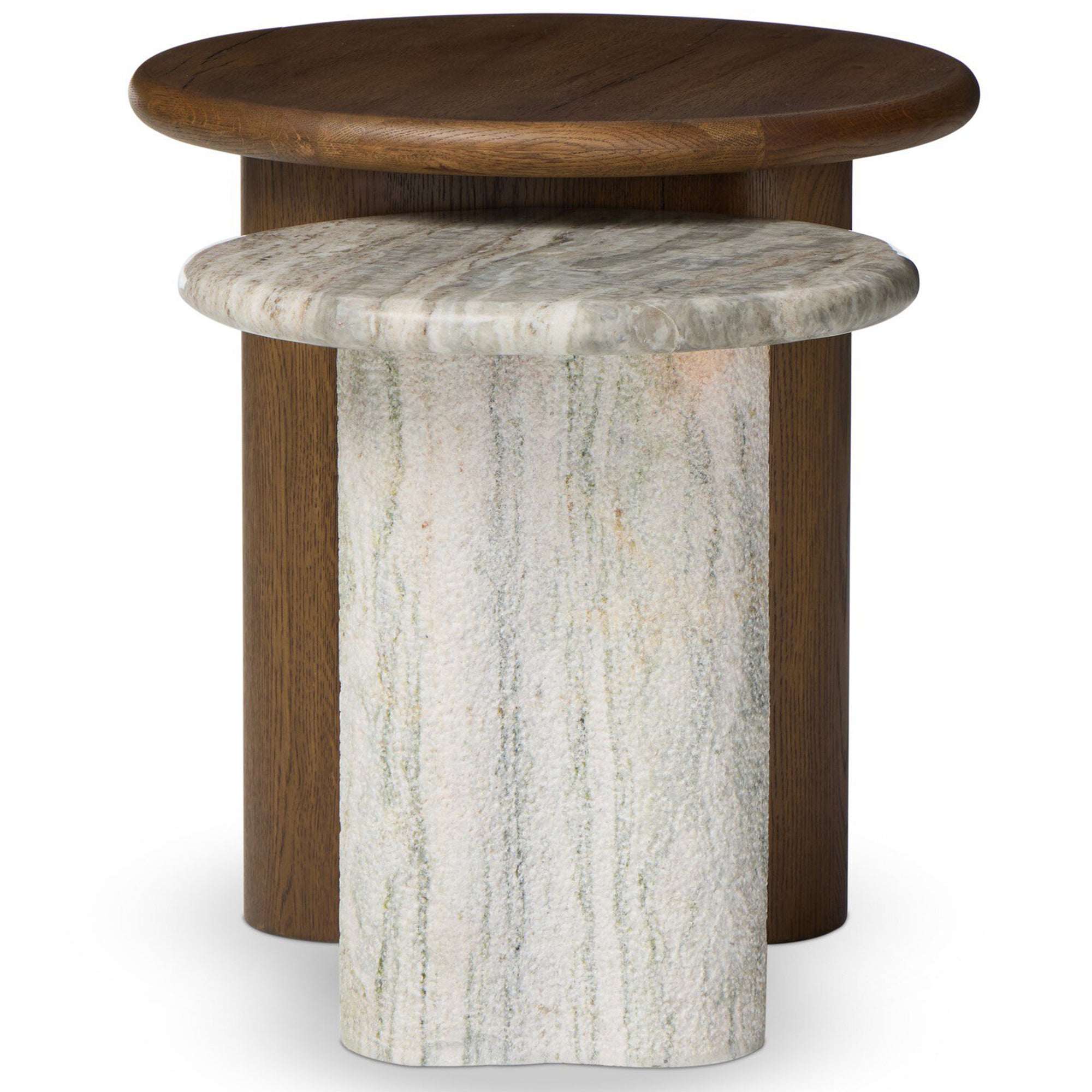 The Waylie Nesting End Tables combine refined craftsmanship with practical versatility. Featuring solid marble tops and thick oak veneer frames, these round nesting tables provide elegant surface space for décor, lighting, or everyday essentials. Their compact design allows them to nest together when not in use, making them ideal for living rooms or seating areas where flexibility and style are equally important.