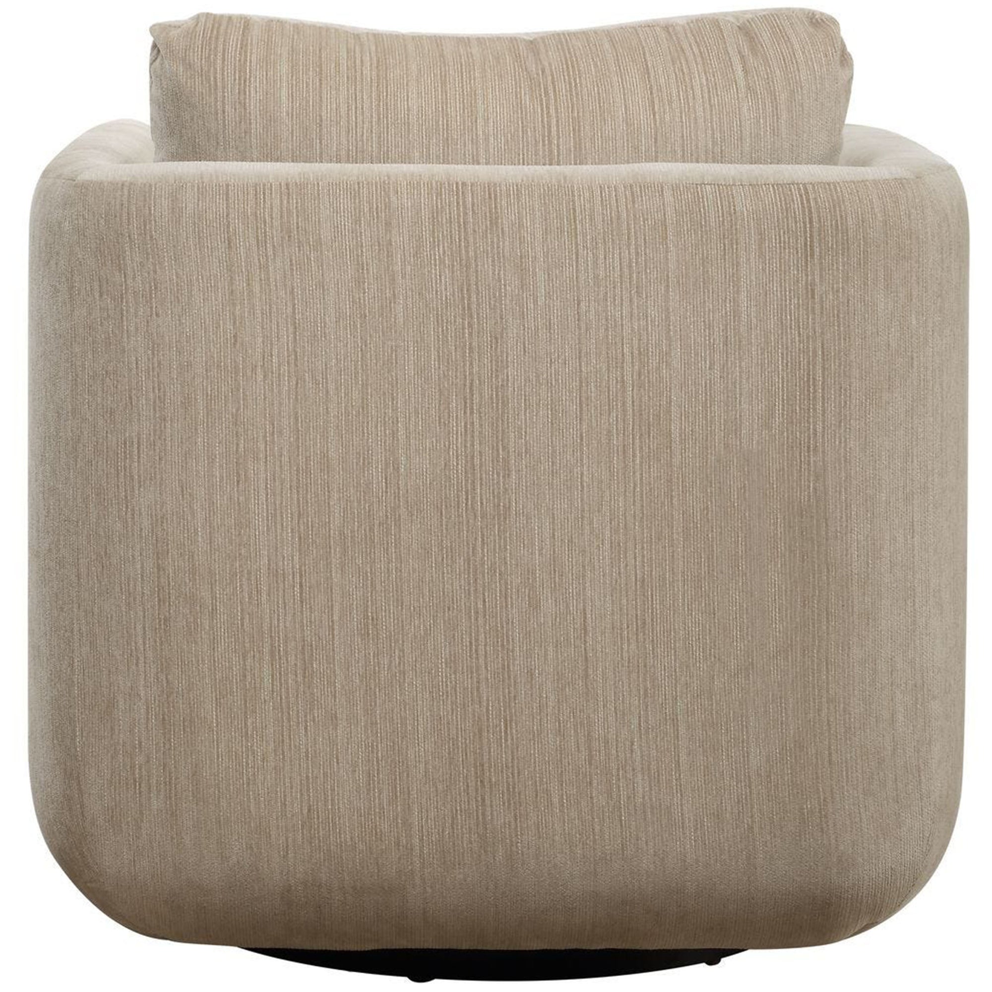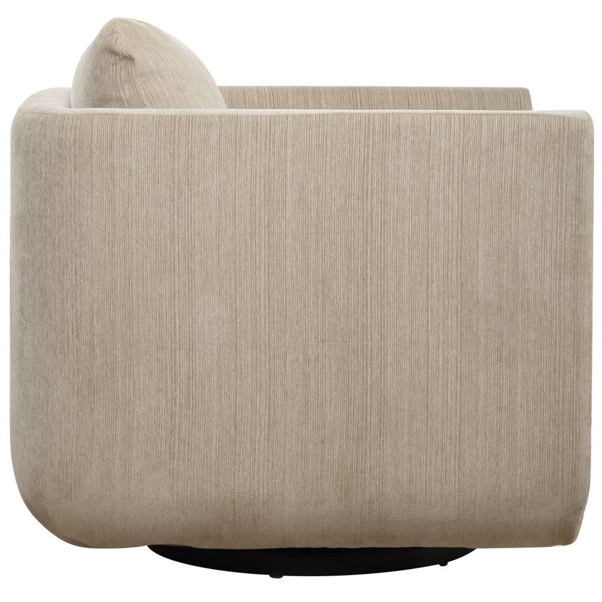 The Abound Swivel Chair features a rounded club chair silhouette that brings a clean architectural presence to any living space or study. It showcases a deep plush seat and backrest, providing a generous and functional area for relaxation. The integrated framework is defined by a unique rounded base that cradles the seating structure. A hidden 360 degree swivel mechanism allows for effortless rotation and versatile placement within a room. The fully upholstered exterior maintains a streamlined minimalist profile while ensuring a secure and functional focal point. This well proportioned design effortlessly merges organic forms with practical comfort to anchor a contemporary interior.