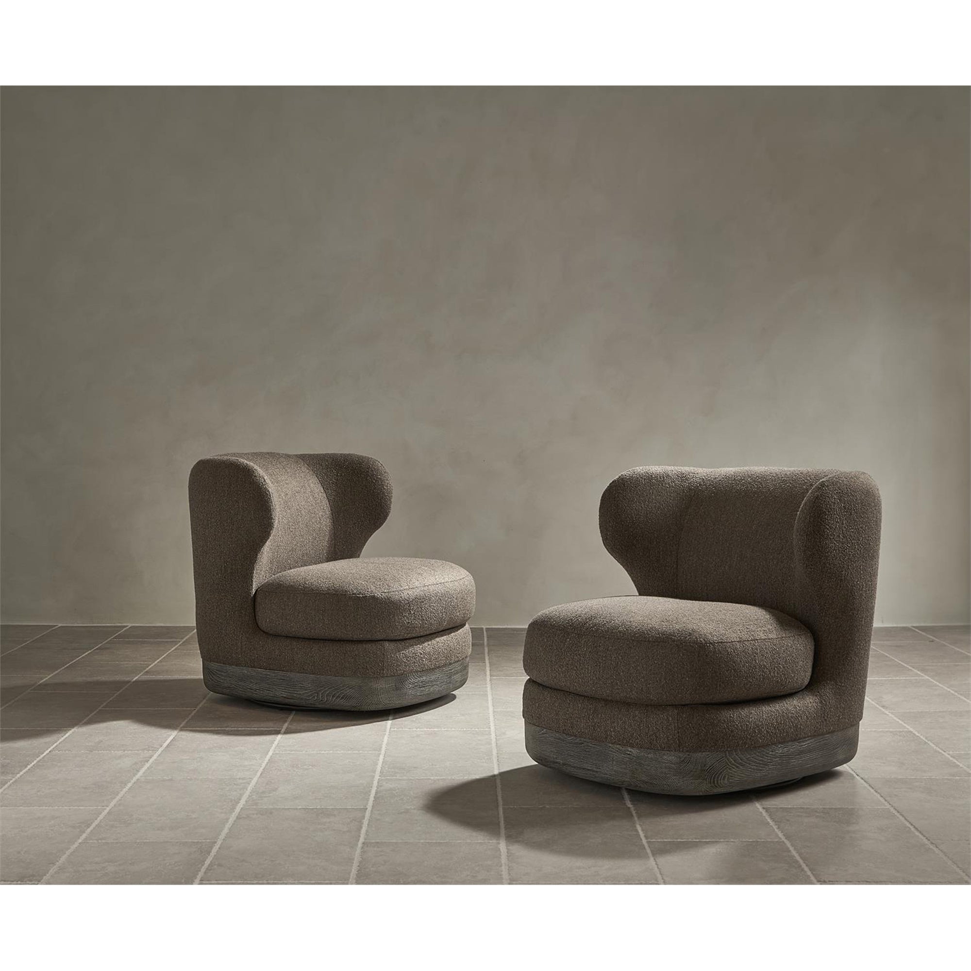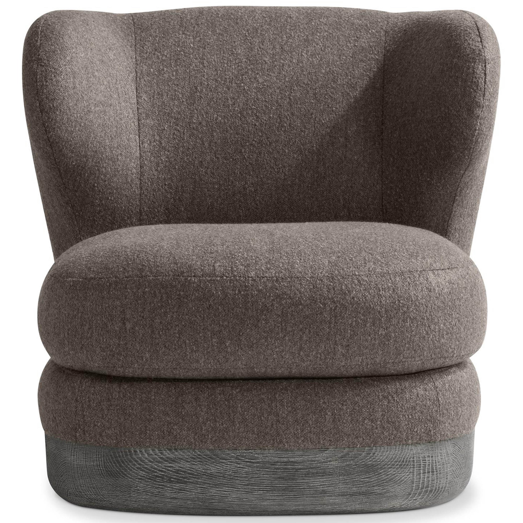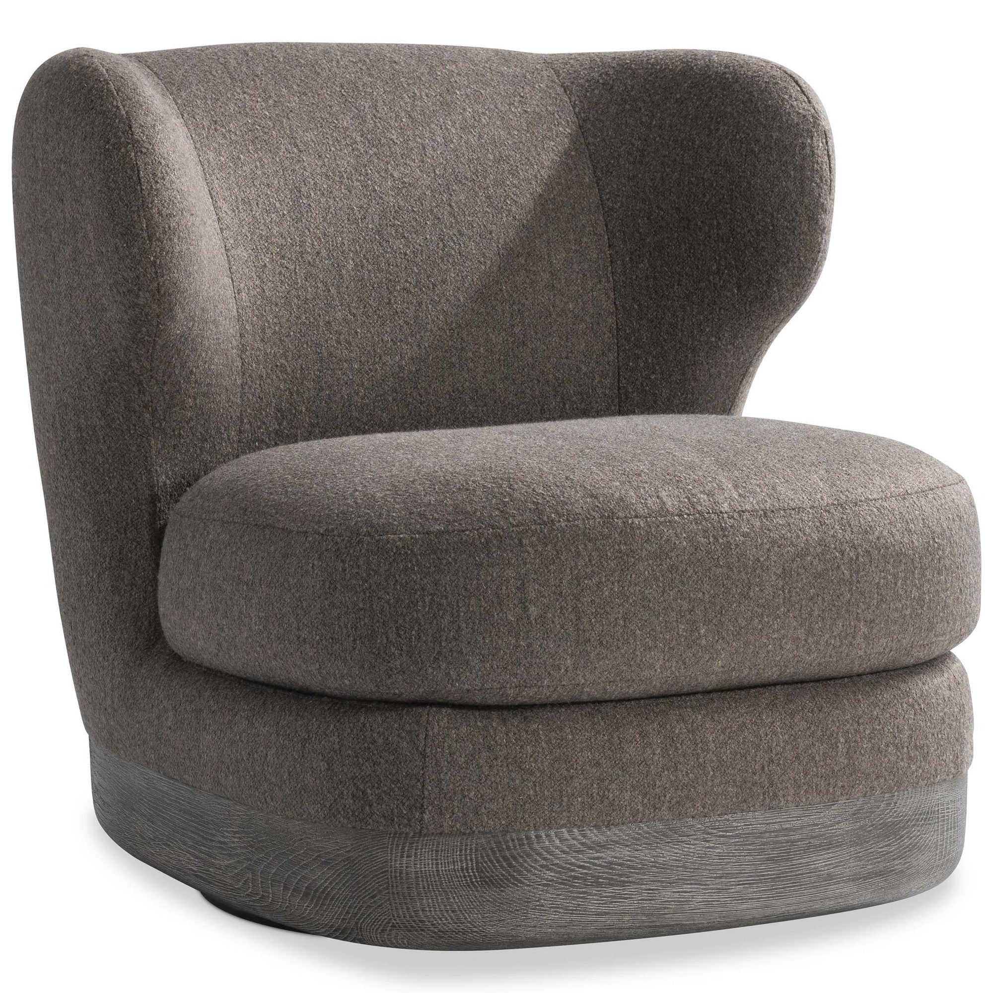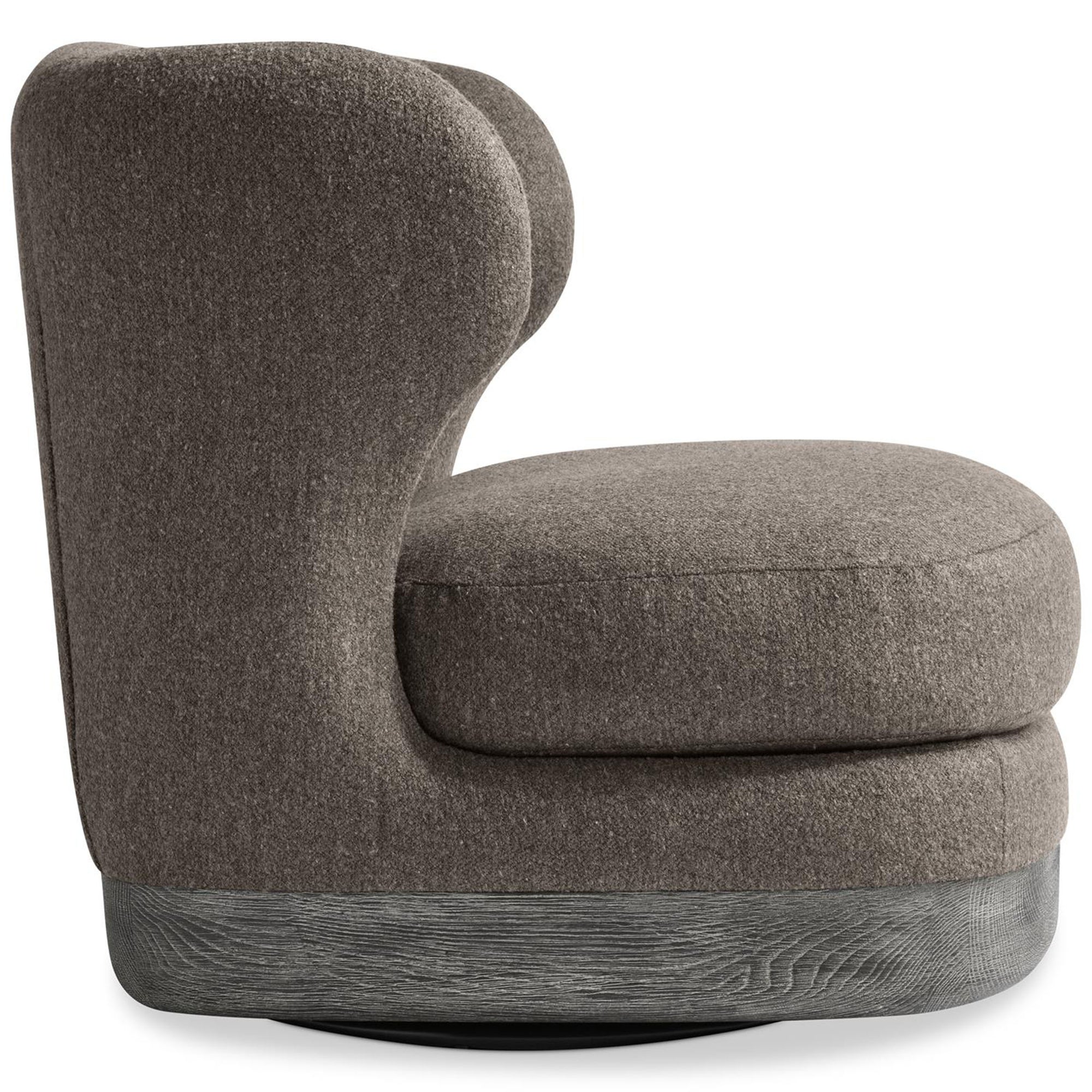 The Beck Swivel Chair reimagines the traditional wingback with a soft, curved profile and deep seating comfort. A tight back and smooth swivel base offer modern function, while the textured wood plinth adds refined detail to this updated classic.