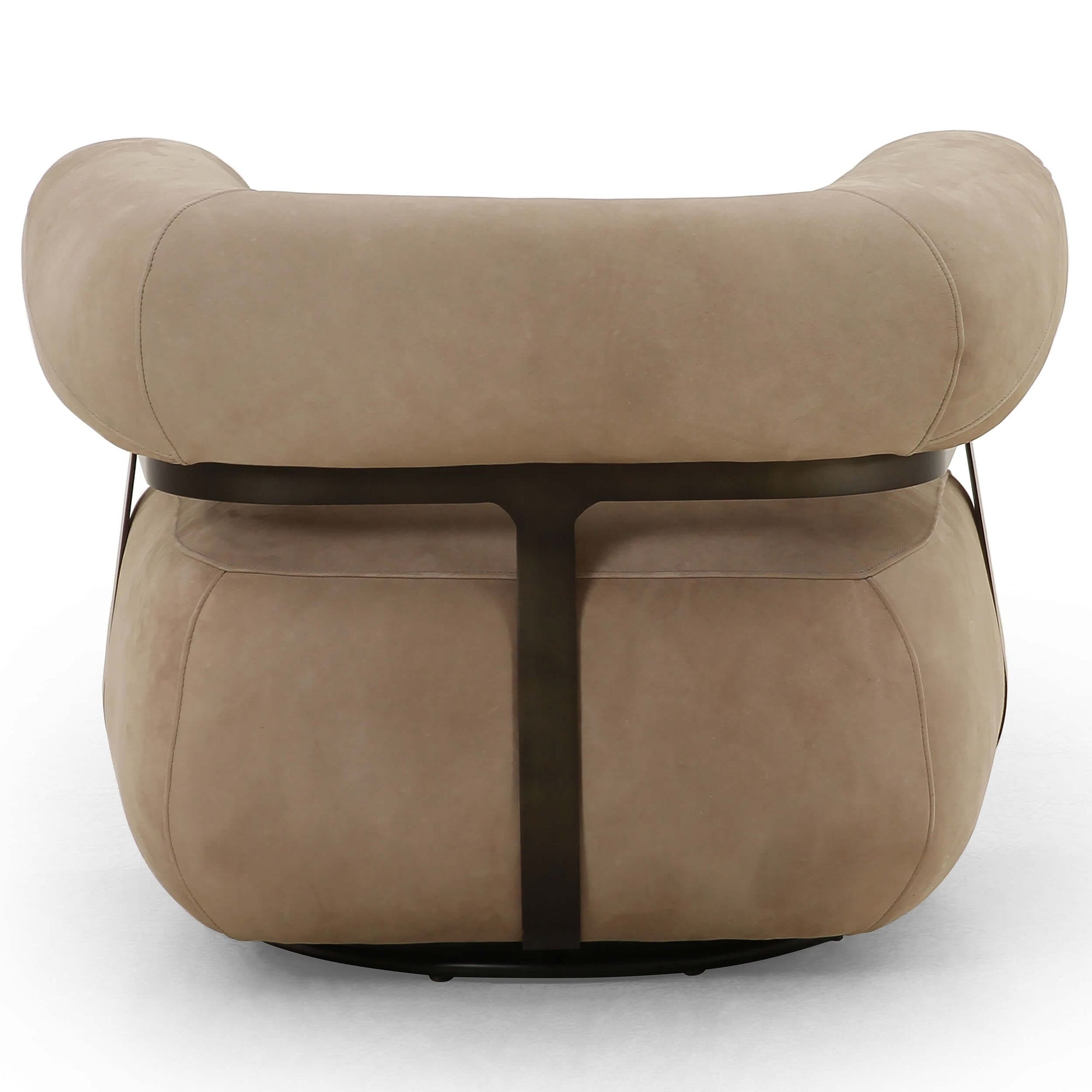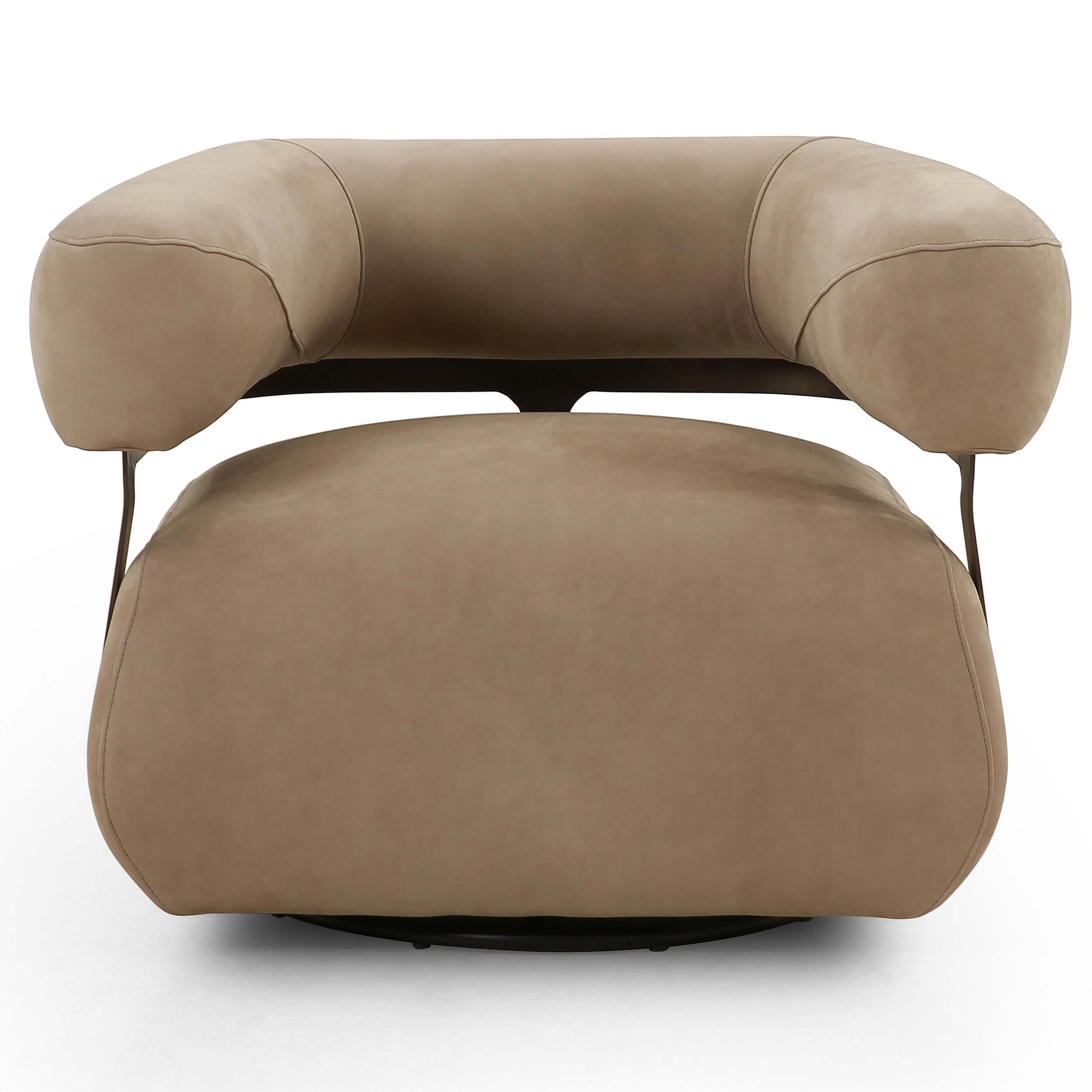 Eighties inspiration brought to modern speed. With a 360-degree swivel, an inflated silhouette speaks to the Brazilian influence behind this curvy seating style made from top-grain leather that's supple to the touch. The iron frame gives shape and contrast with its matte gunmetal finish.