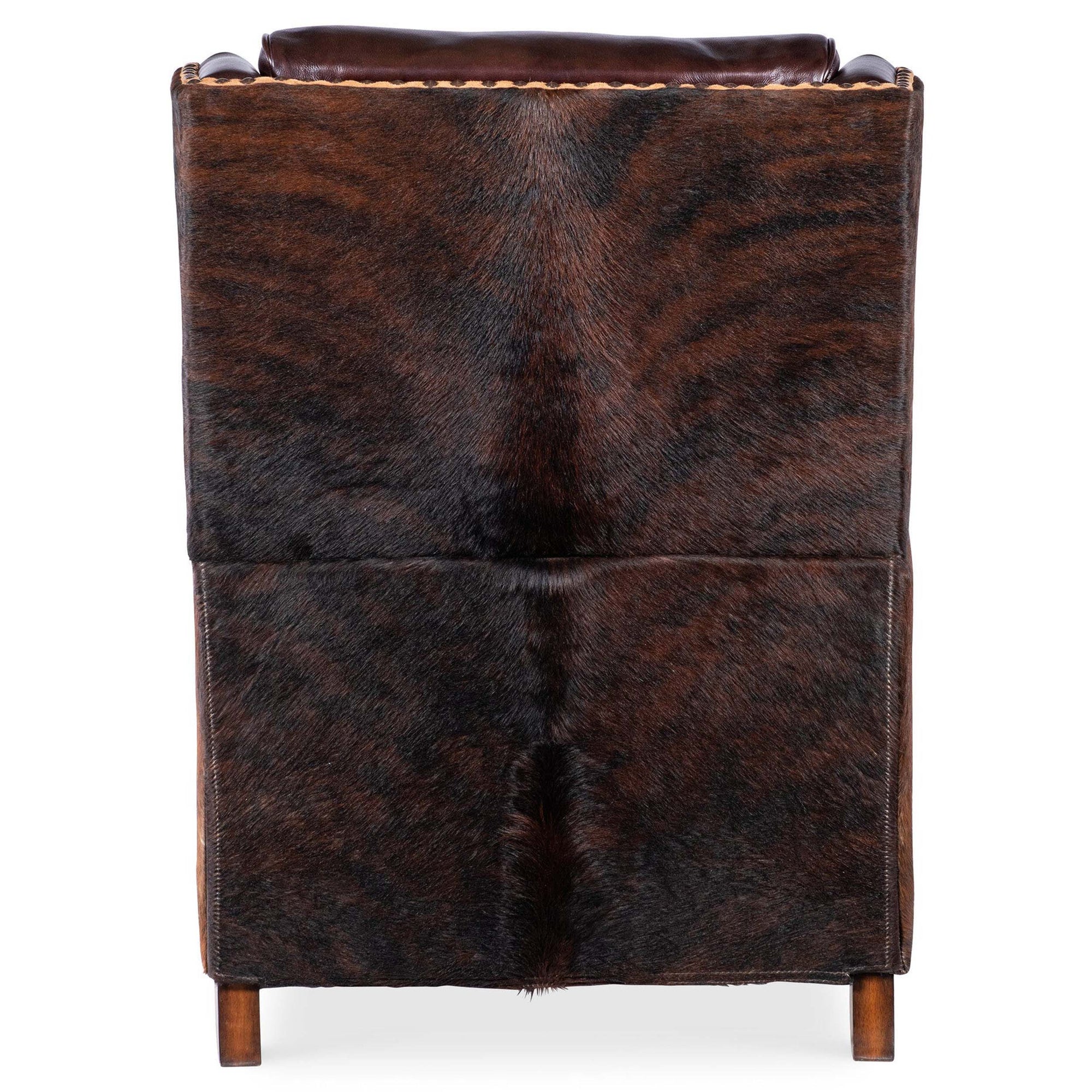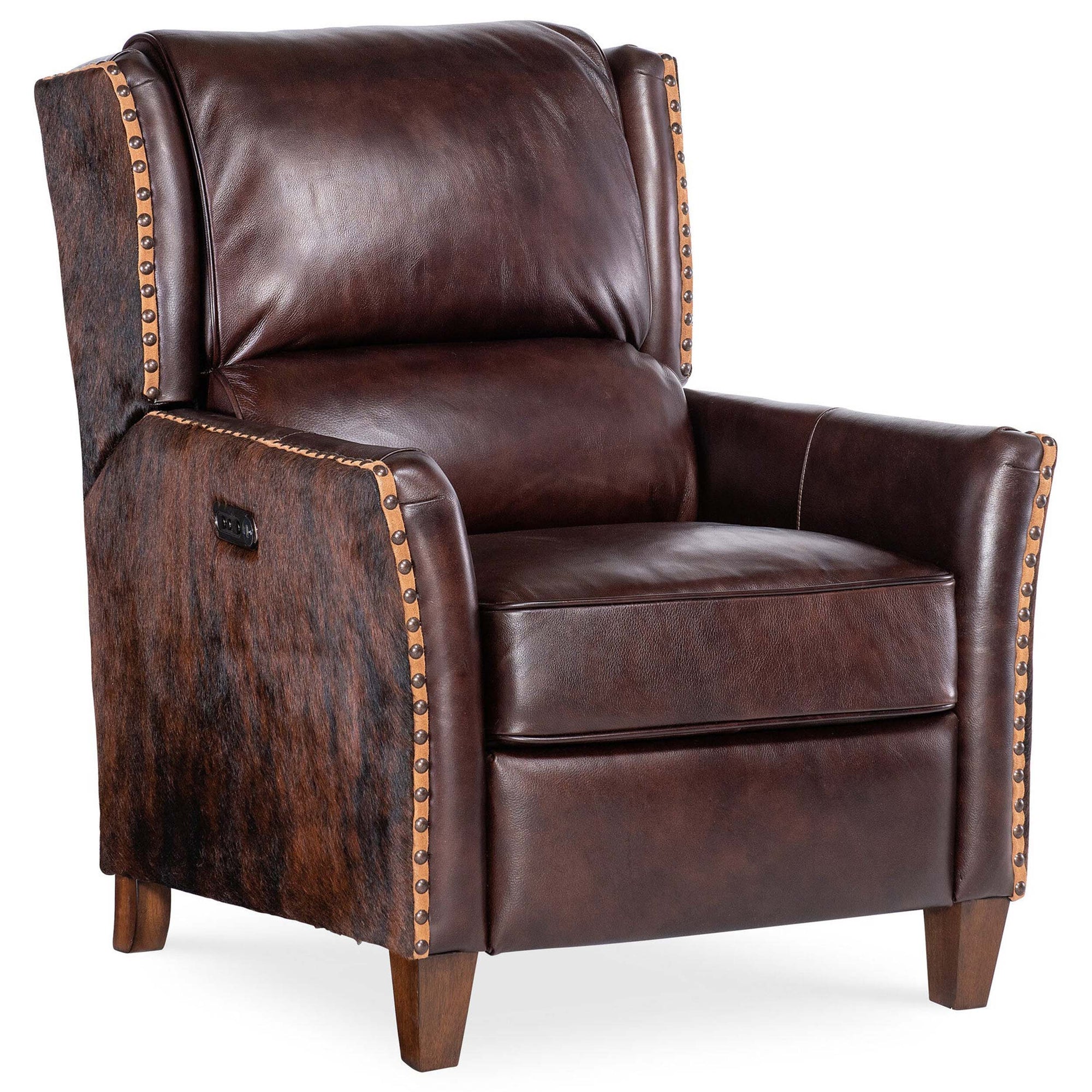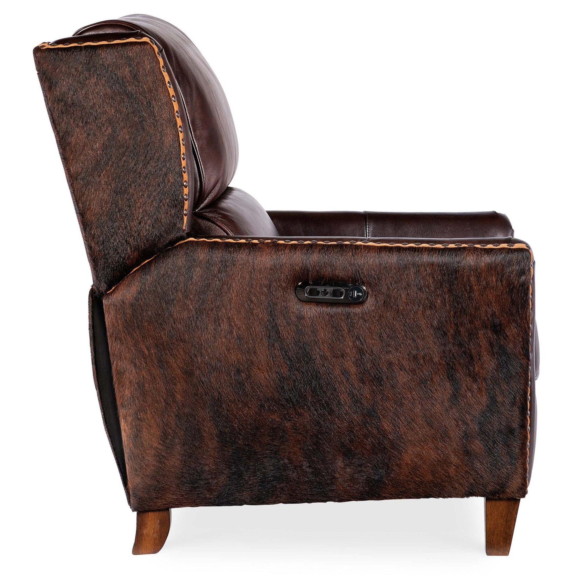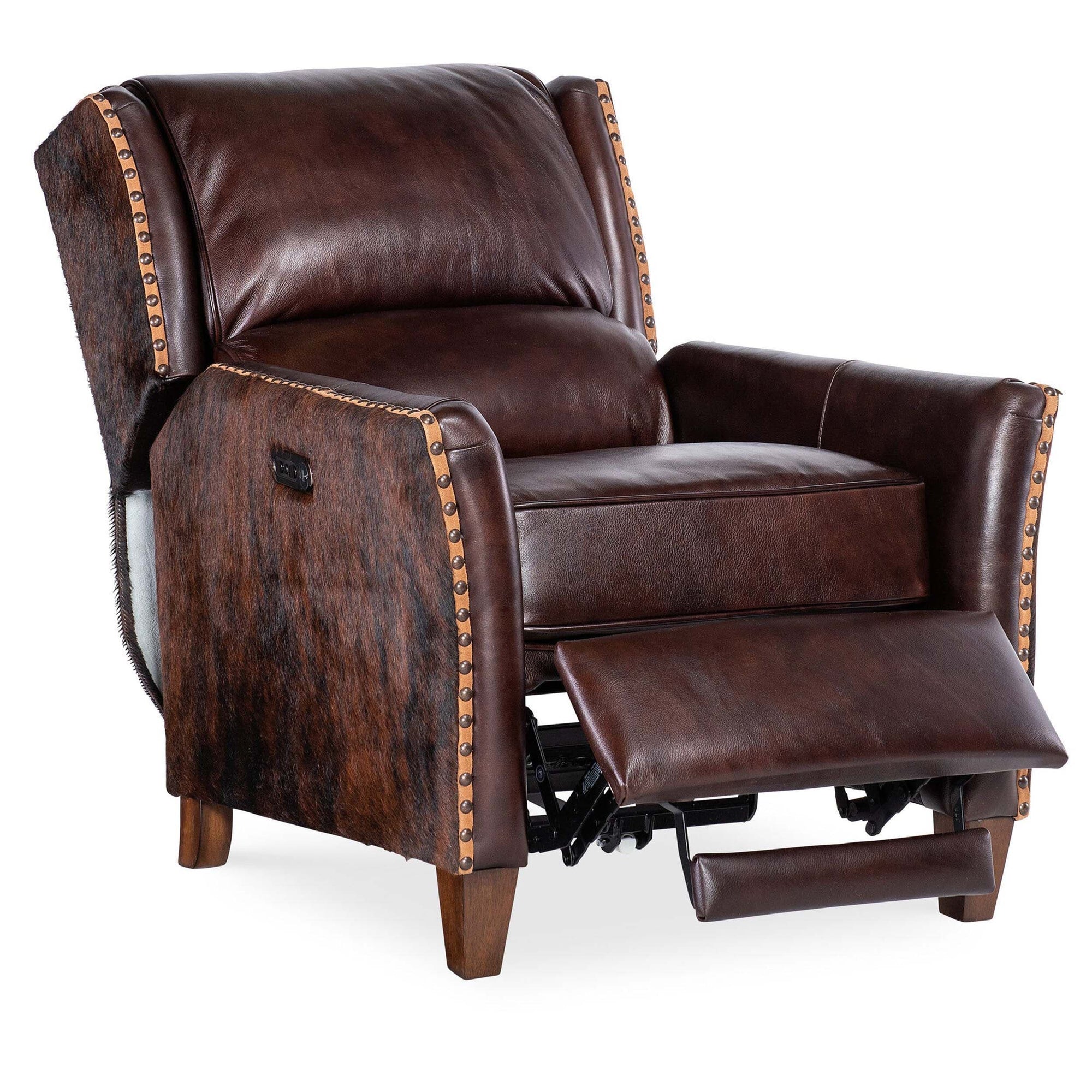 The Livingston Leather Power Recliner combines timeless luxury with traditional styling. This recliner features a power headrest and integrated USB port for modern convenience, while the bustle-style back and flared arms provide deep comfort. Crafted with semi-aniline top-grain leather, it is uniquely accented with contrasting hair-on-hide on the outside back and sides. Decorative nailhead trim with gimp welt and tapered legs in a dark finish complete this exquisite formal seating piece.