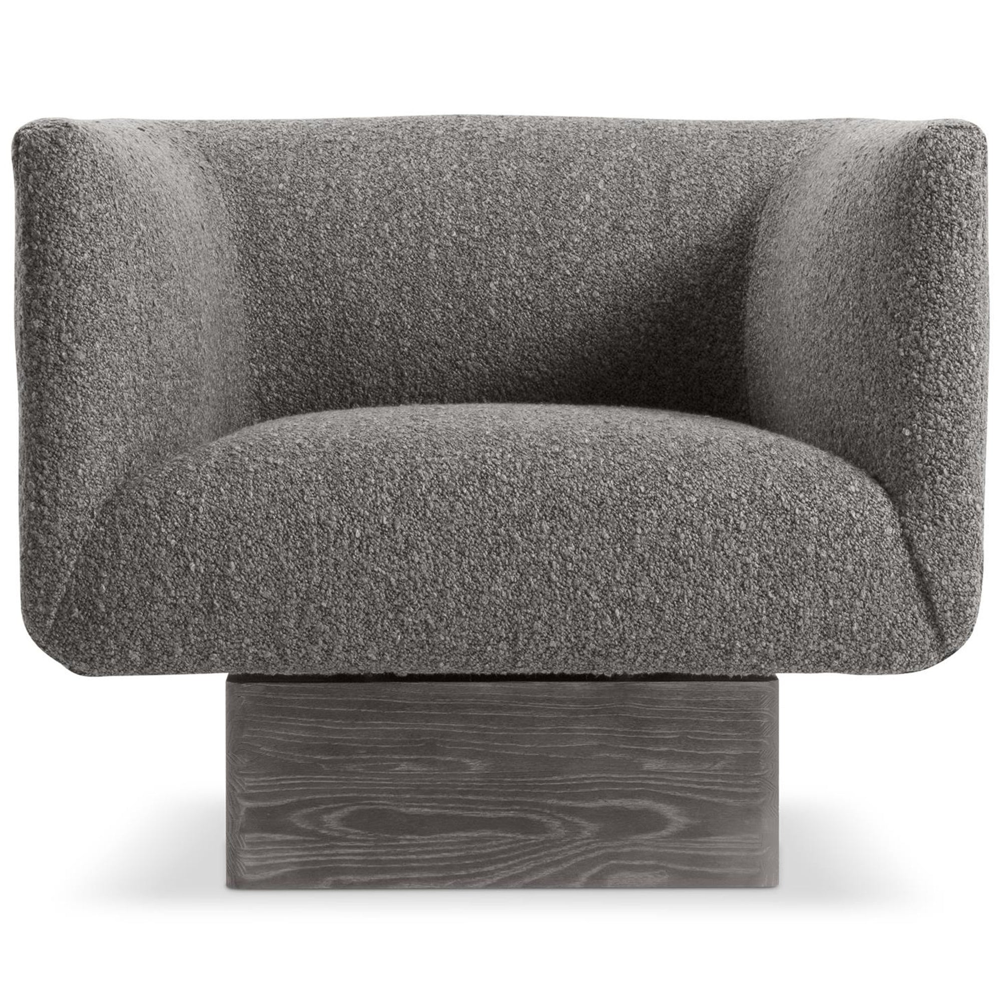 The Marni Swivel Chair draws on the classic club silhouette with geometric lines, padded arms, and a sleek tight back. A square plinth base crafted from textured wood adds visual interest while offering smooth swivel-and-return functionality.