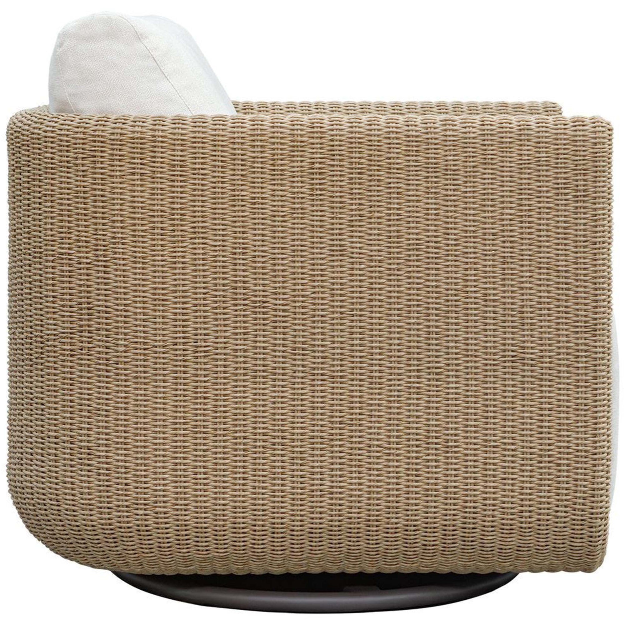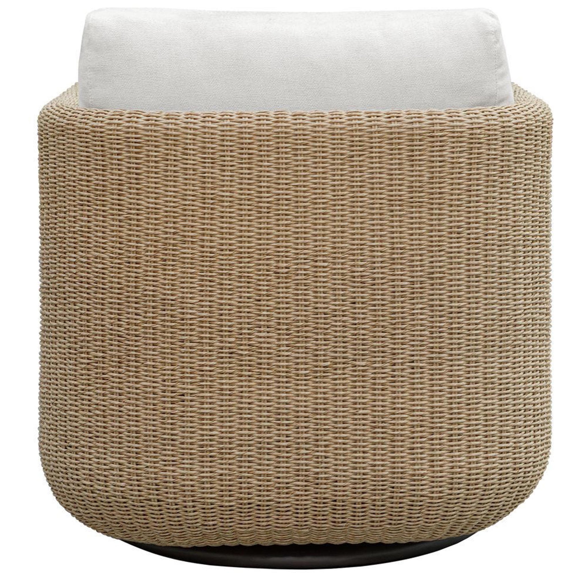 The Santorini Outdoor Swivel Chair features a rounded club chair silhouette that brings a clean architectural presence to any outdoor living space or lounge. It showcases a deep plush seat and backrest, providing a generous and functional area for relaxation. The integrated framework includes a hidden 360 degree swivel mechanism, allowing for effortless movement and versatile placement within a patio or deck. The base and sides are defined by a rhythmic woven pattern that adds visual depth and organic texture to the profile. This well proportioned design effortlessly merges streamlined modern forms with practical comfort to anchor a contemporary outdoor setting.