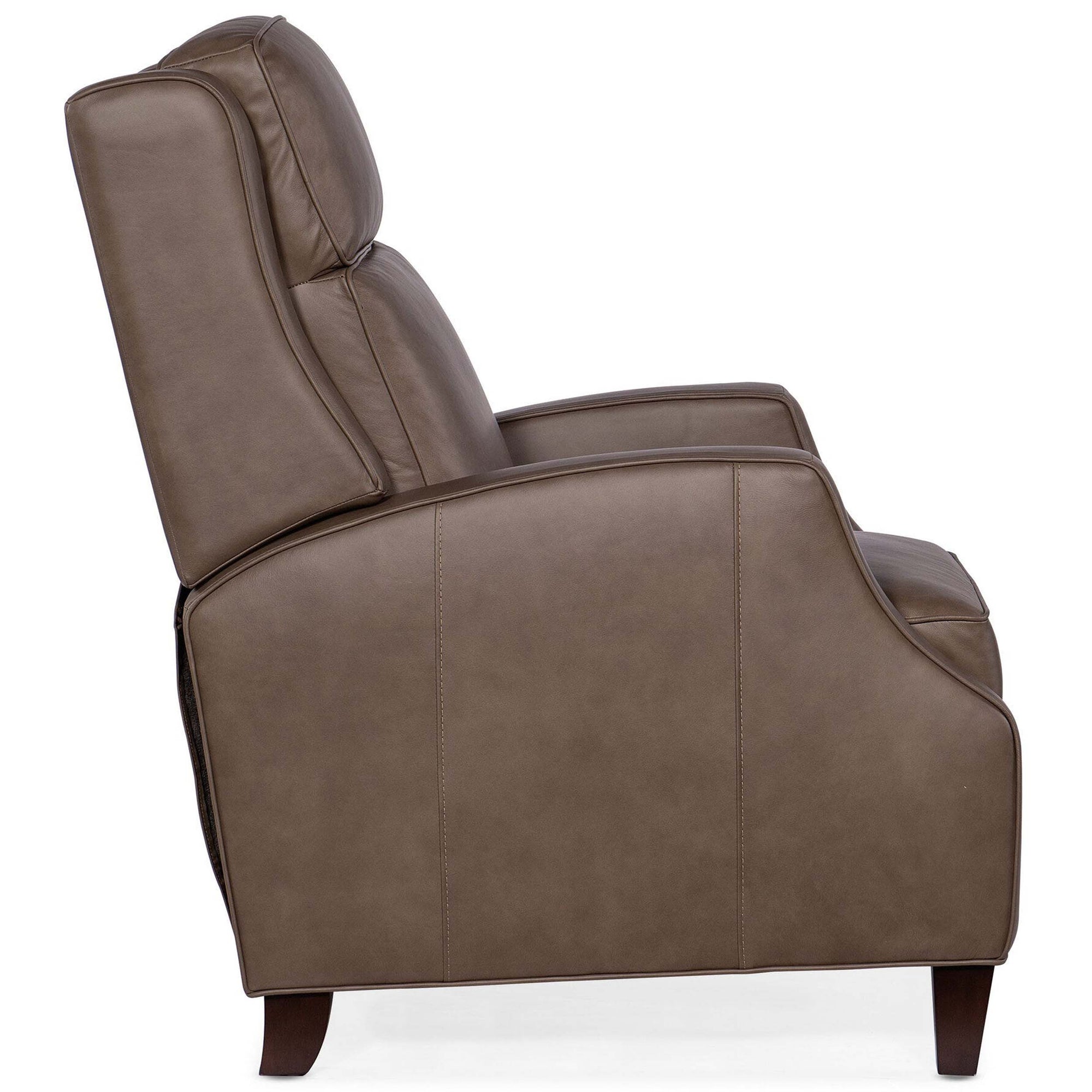 The Tricia Leather Manual Push Back Recliner offers a tasteful and timeless design for laid-back luxury. Wrapped in family-friendly finished top grain leather, this piece features refined tailoring with an understated bustle back, welt trim, and elegant scoop arms. This manual push-back recliner is supported by tapered legs in a dark wood finish, blending transitional style with premium comfort.