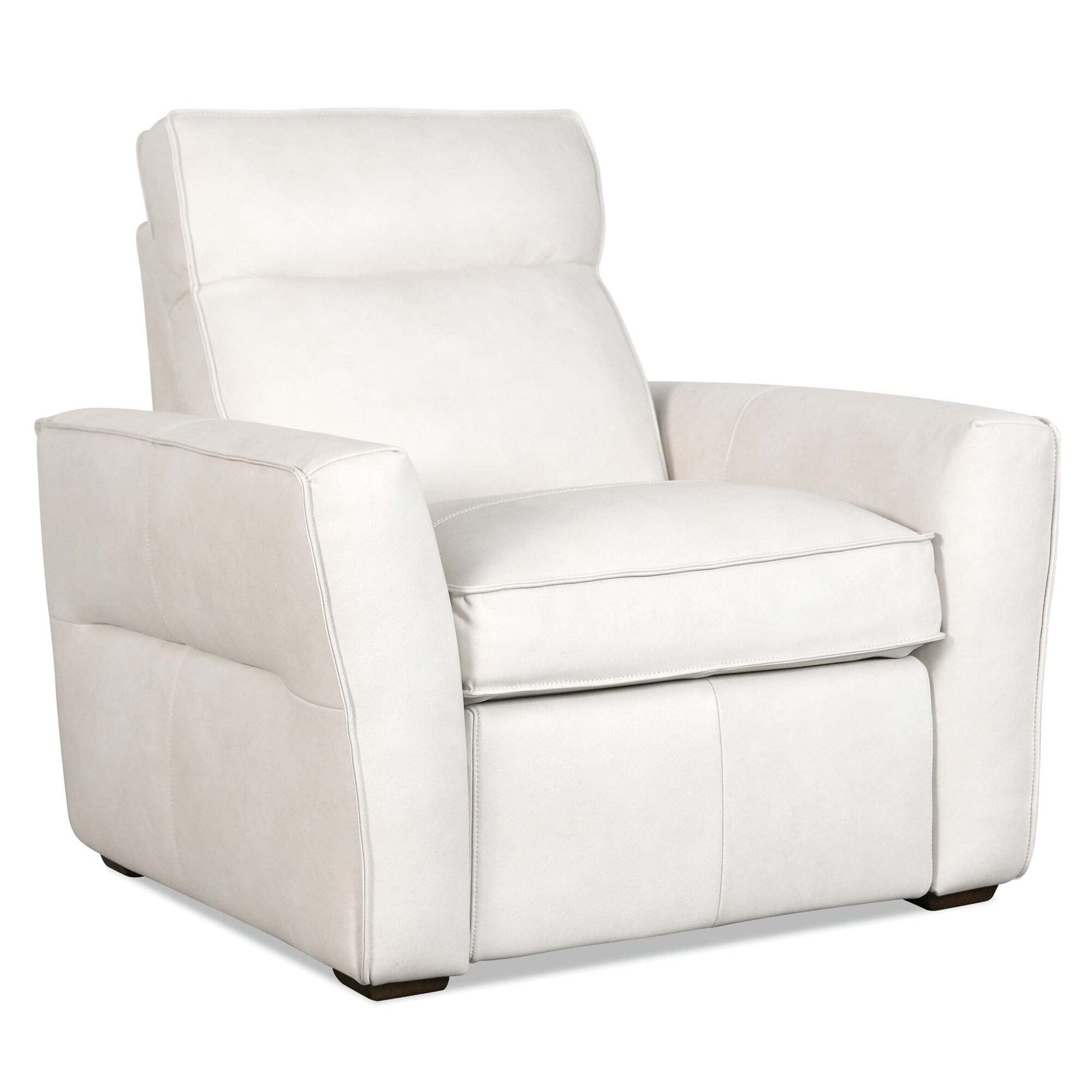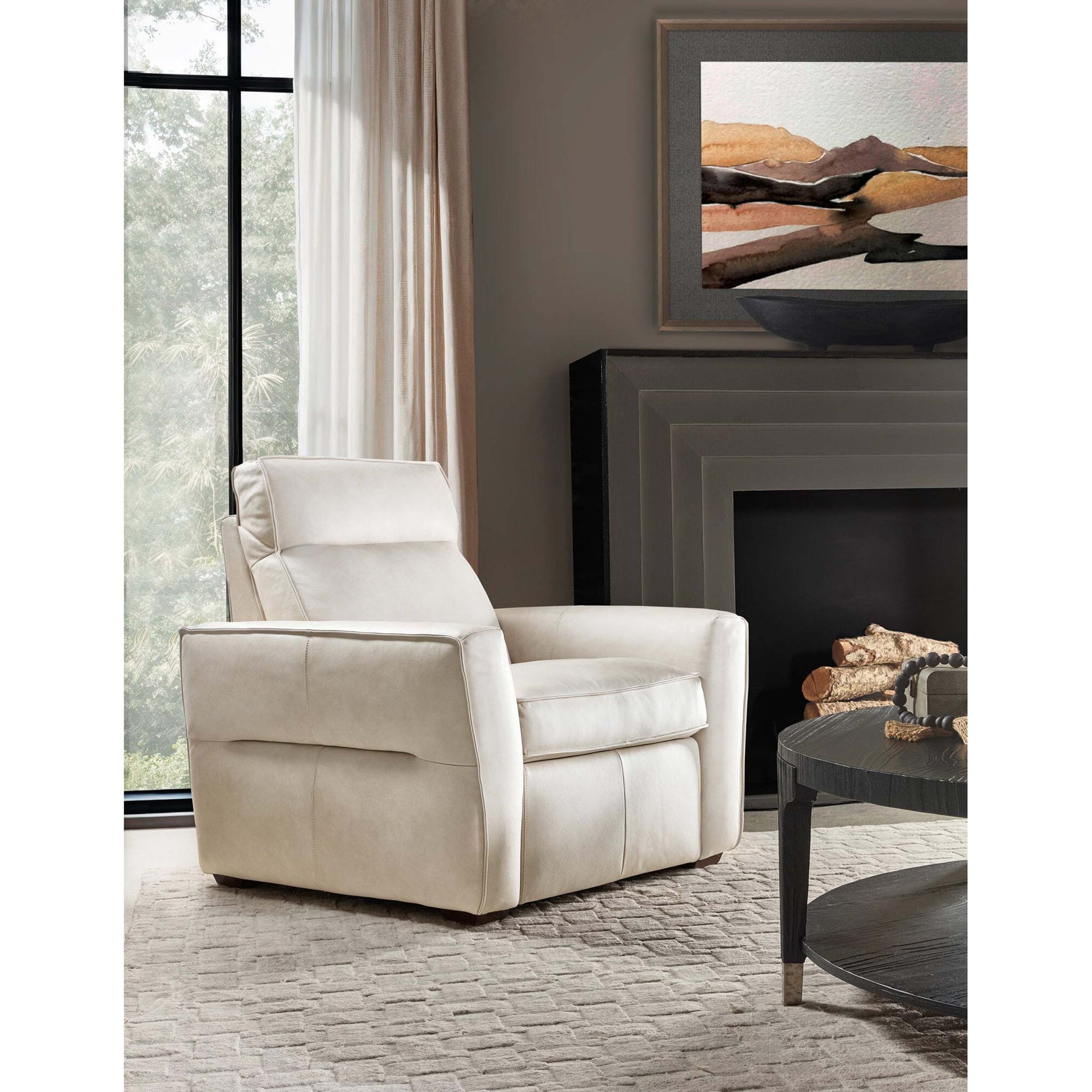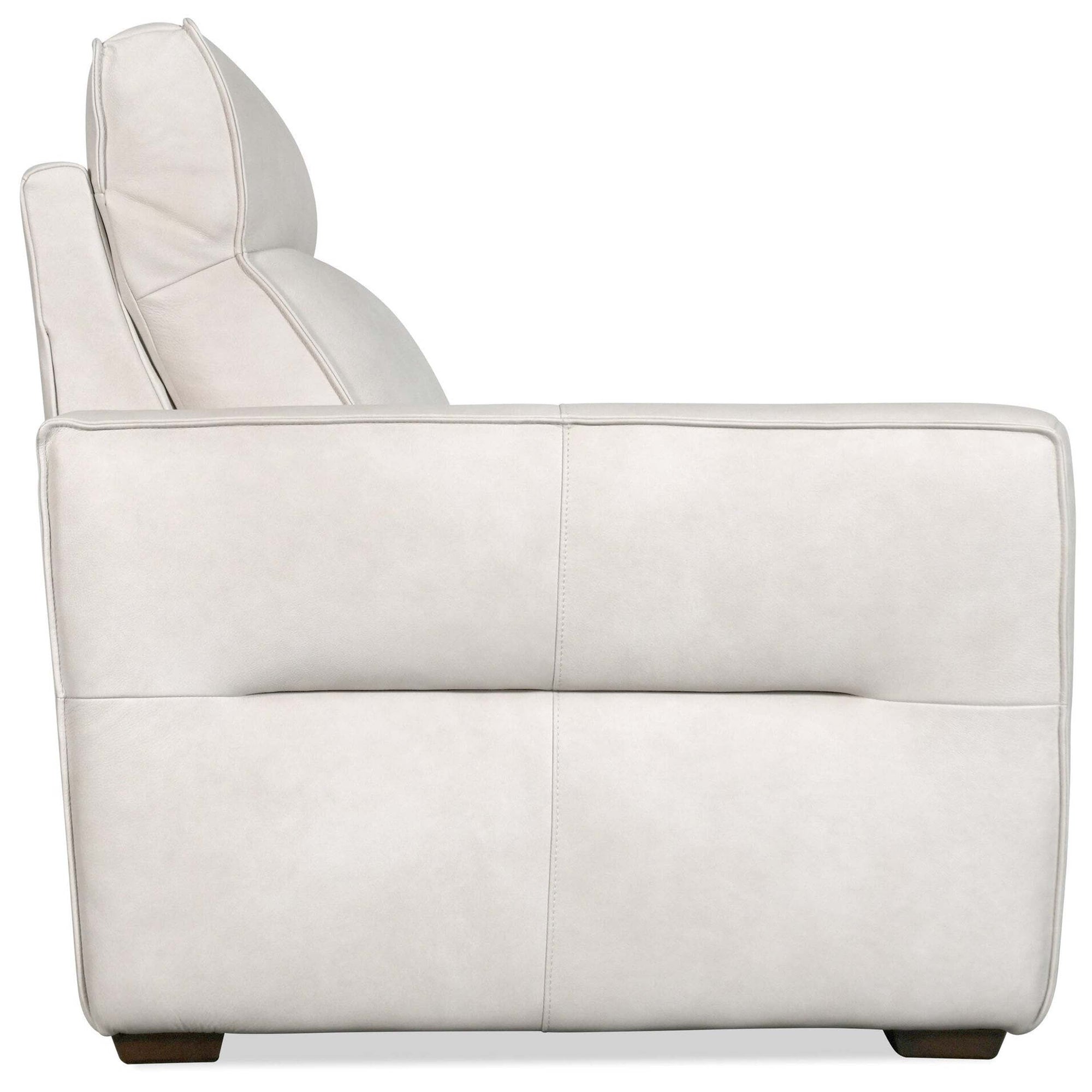 The Vann Power Leather Recliner brings effortless luxury to your living room with integrated power headrest technology. This power recliner features smooth reclining, adjustable head support, and a supportive bustle back for all-day comfort. Upholstered in top grain semi aniline leather with splits and finished with casual flange trim and dark wood block feet, it is an elevated choice for relaxed seating areas.