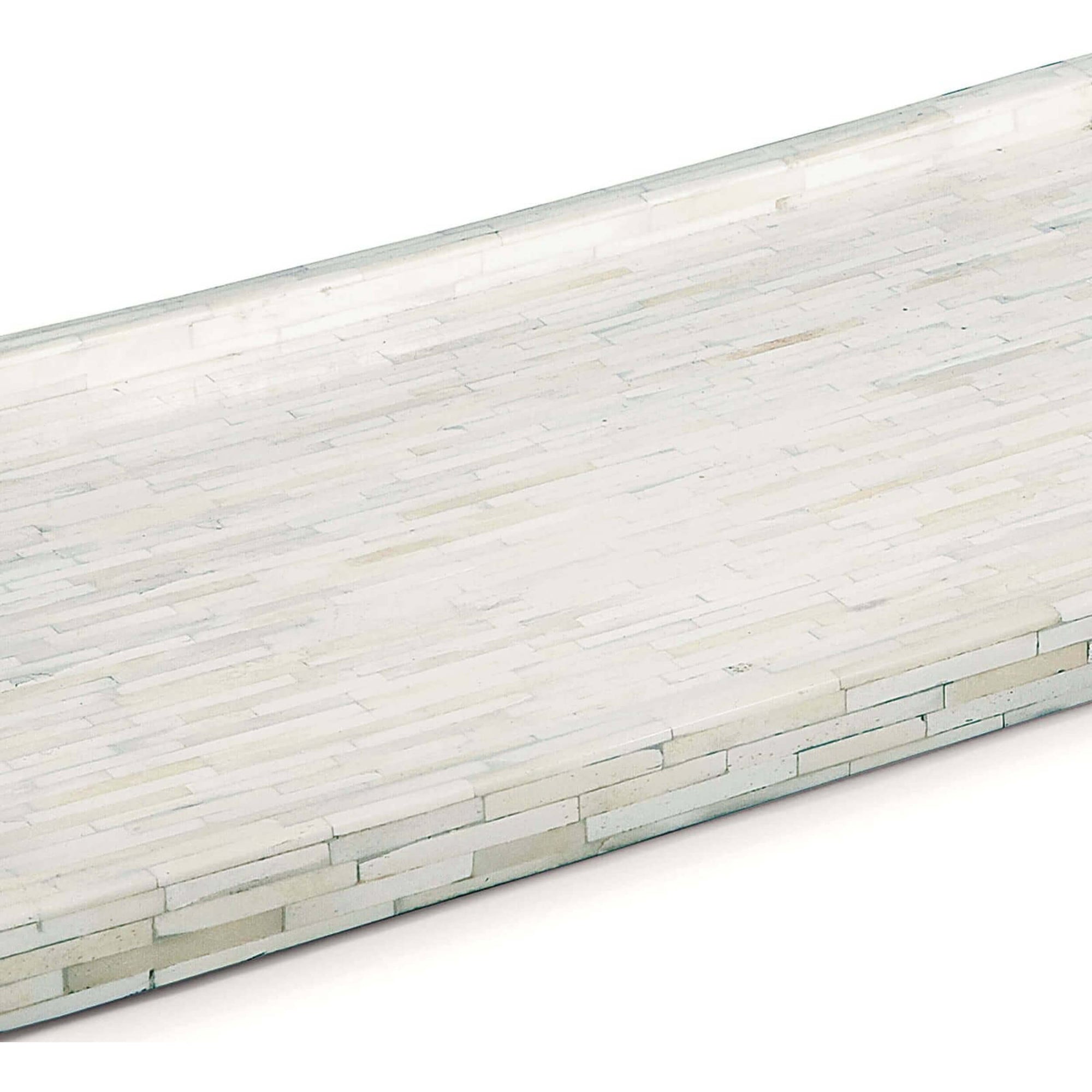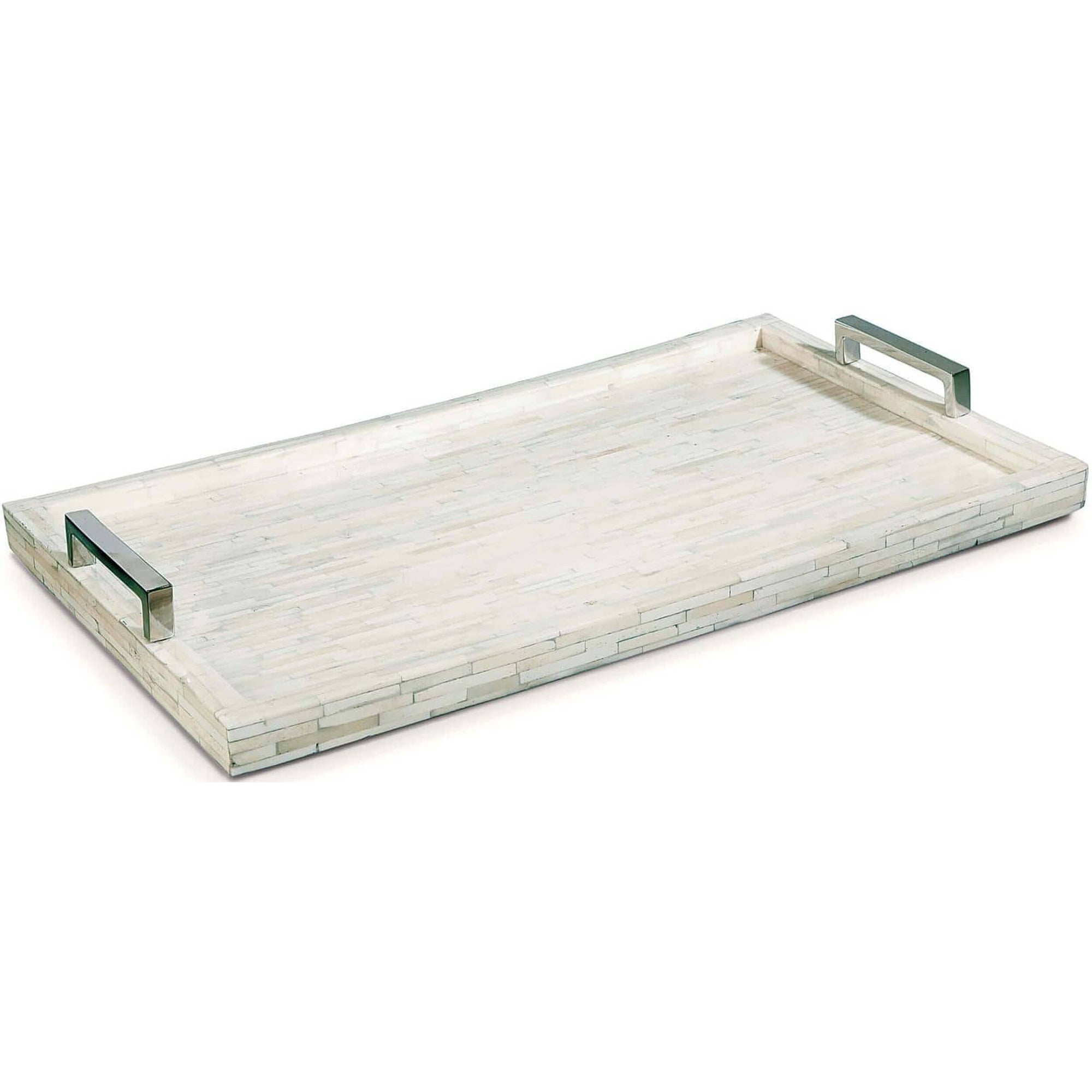 Adding luxury and style to your bedroom, living, or entertainment space, with the White Hone and Nickel Tray. This rectangular tray is covered in hand-inlay natural bone with a mosaic pattern that creates a rich composite for staging objets d'art to personal accessories. Polished nickel handles make it easy to re-position and transport the tray while adding a visually appealing element.