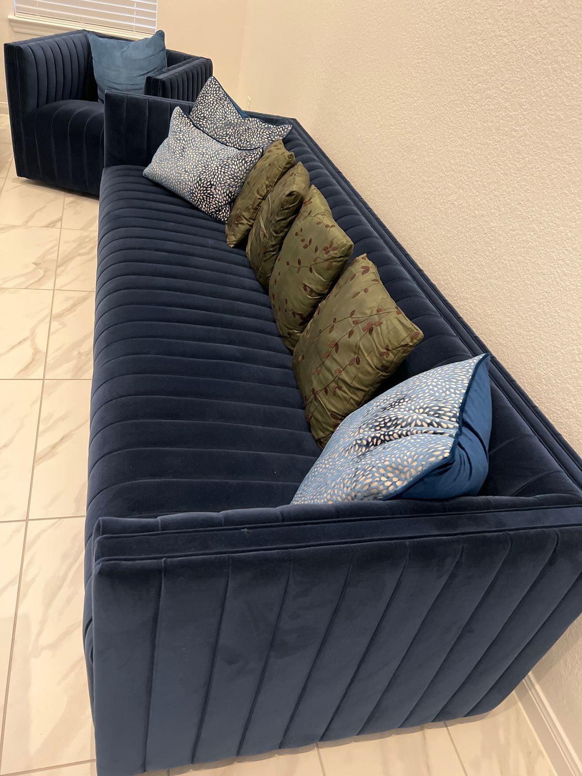 Velvety poly-blend seating takes on dramatic channeling and a rich navy hue for the trend-forward texture of the Augustine Sofa.