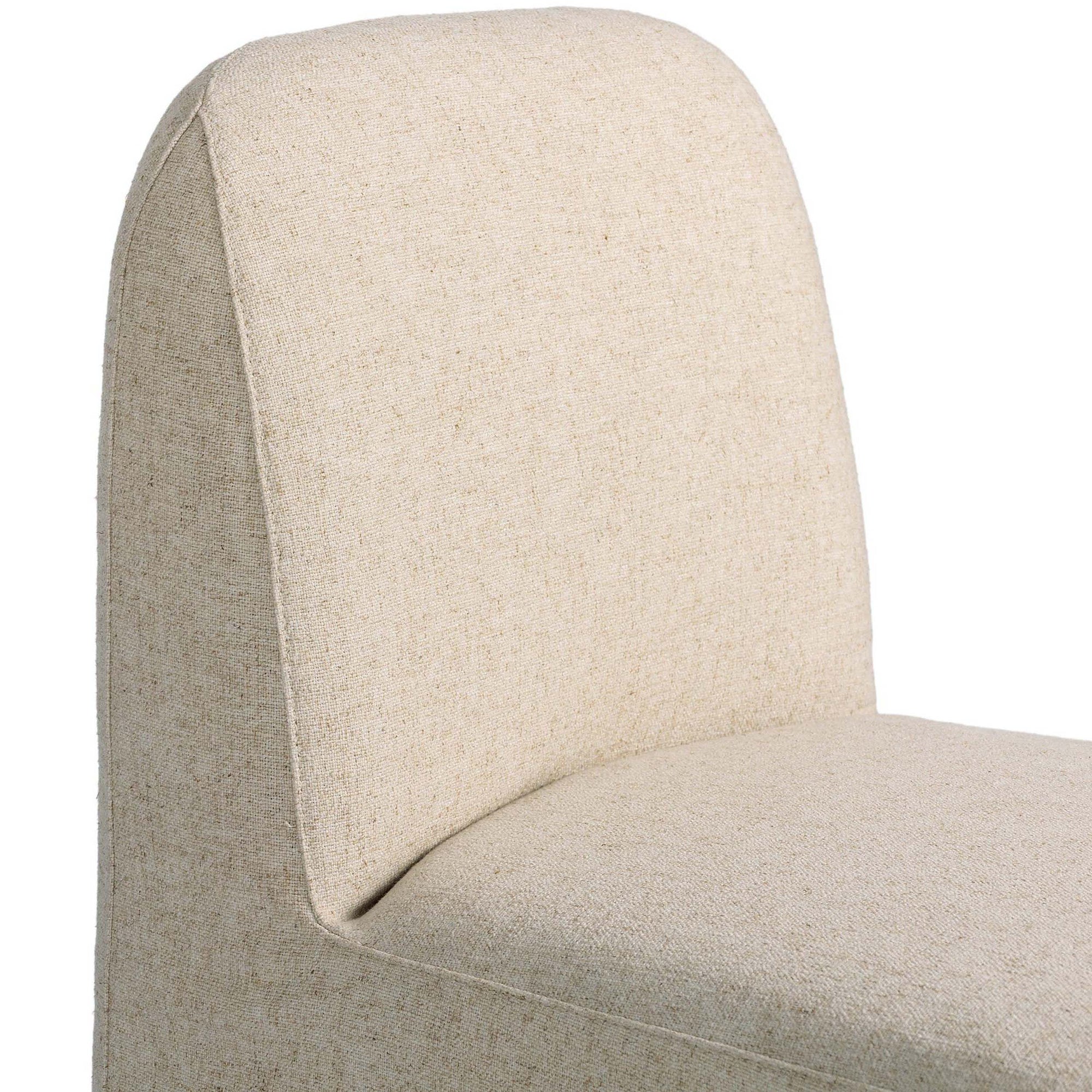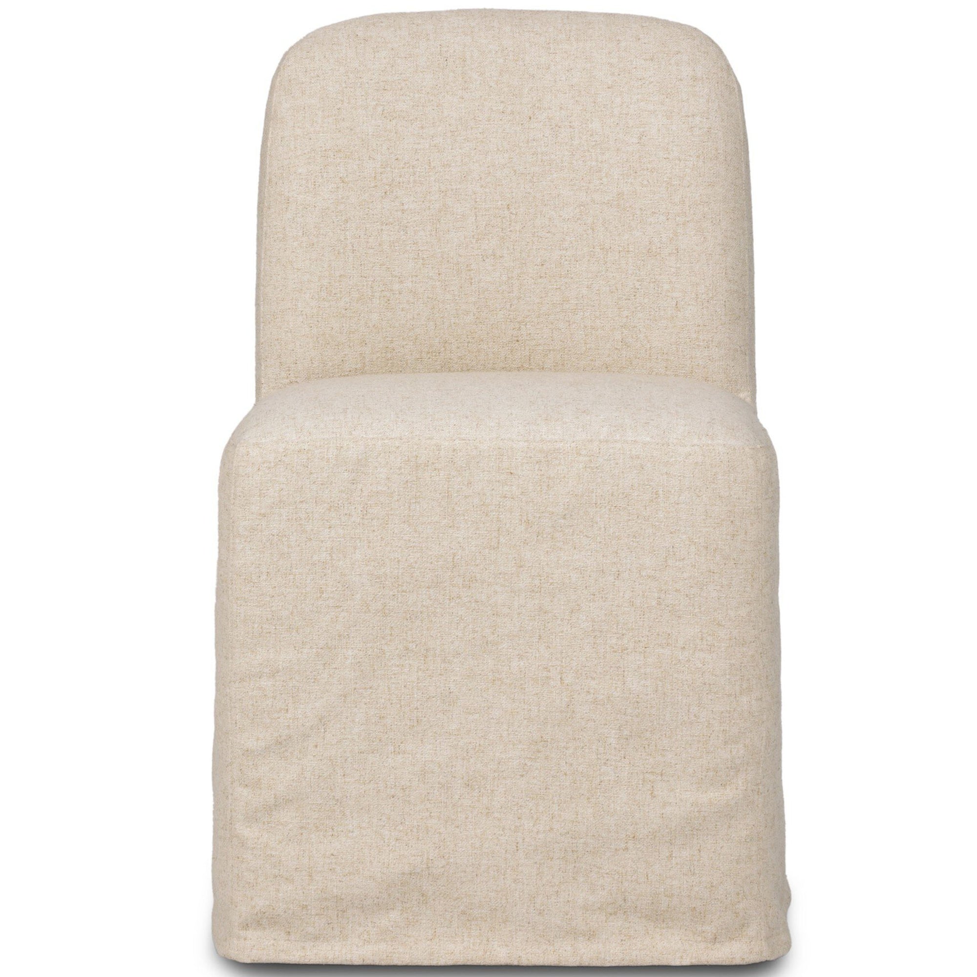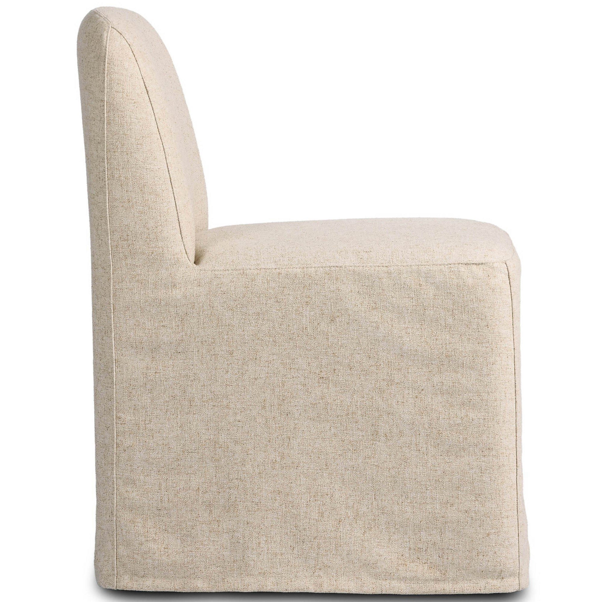 The Brie Dining Chair blends timeless comfort with functional design. This armless side chair features a soft performance fabric in a neutral tone, slipcovered for a clean, versatile look. Supportive webbing seat construction ensures lasting comfort, while smooth 360-degree casters provide easy movement. Perfect for both casual and formal dining spaces.