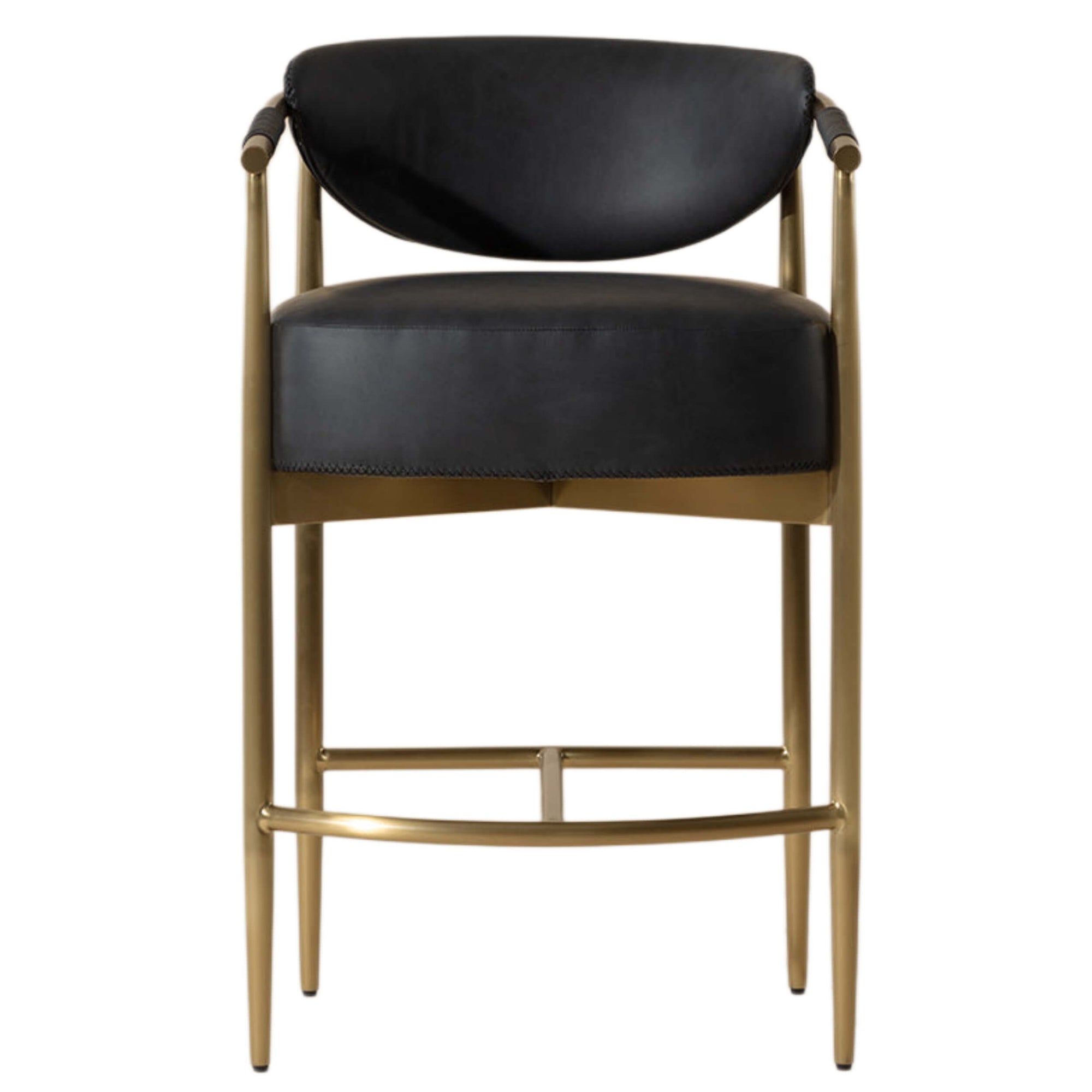 The Heloise Counter Stool features smooth contours, visible stitching, and elegant rope detailing along the arms. Its modern silhouette and gold base create a sophisticated look, making it a standout addition to any dining or bar area. Thoughtful design and comfortable proportions blend style and function for contemporary spaces.