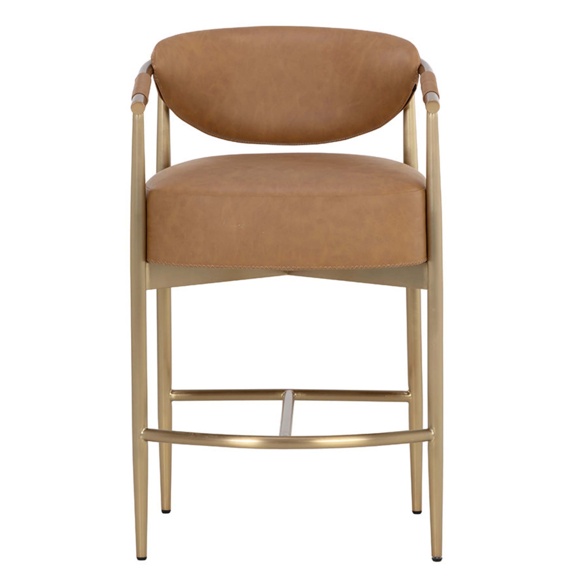 The Heloise Counter Stool features smooth contours, visible stitching, and elegant rope detailing along the arms. Its modern silhouette and gold base create a sophisticated look, making it a standout addition to any dining or bar area. Thoughtful design and comfortable proportions blend style and function for contemporary spaces.
