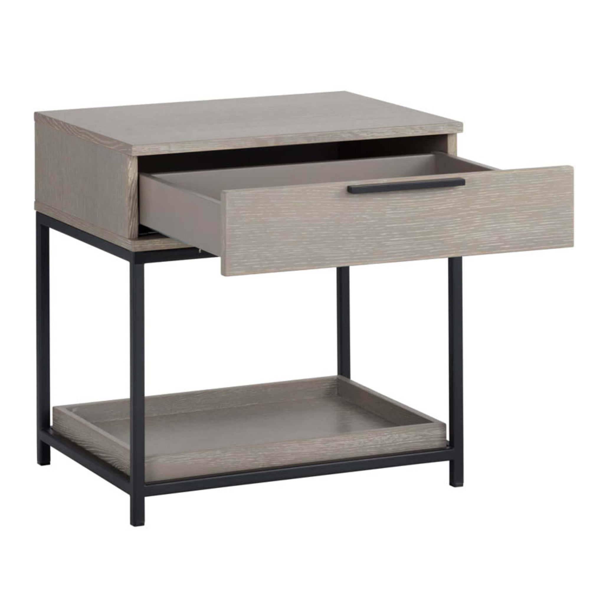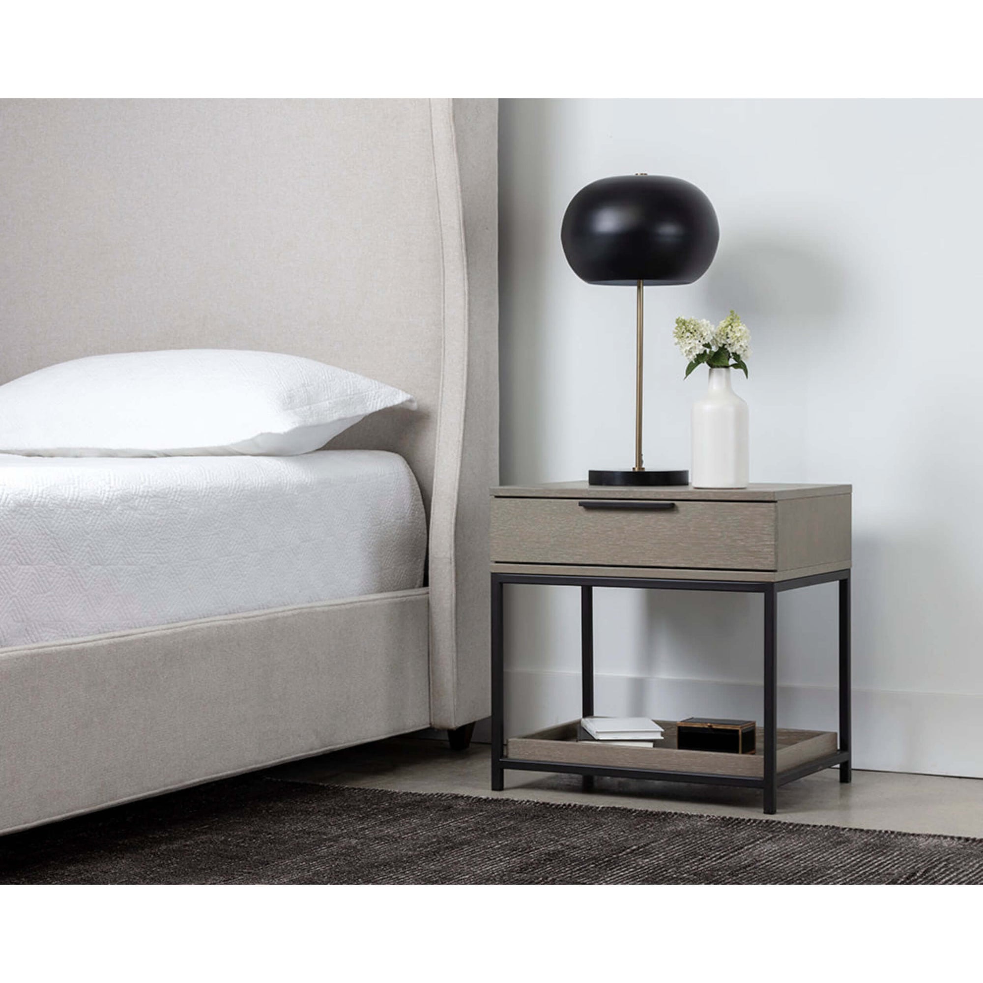 The Rebel Nightstand features a modern, streamlined design with a soft-close drawer and open shelf for added storage. Its clean lines, black hardware, and versatile silhouette make it a stylish and functional addition to any bedroom.
