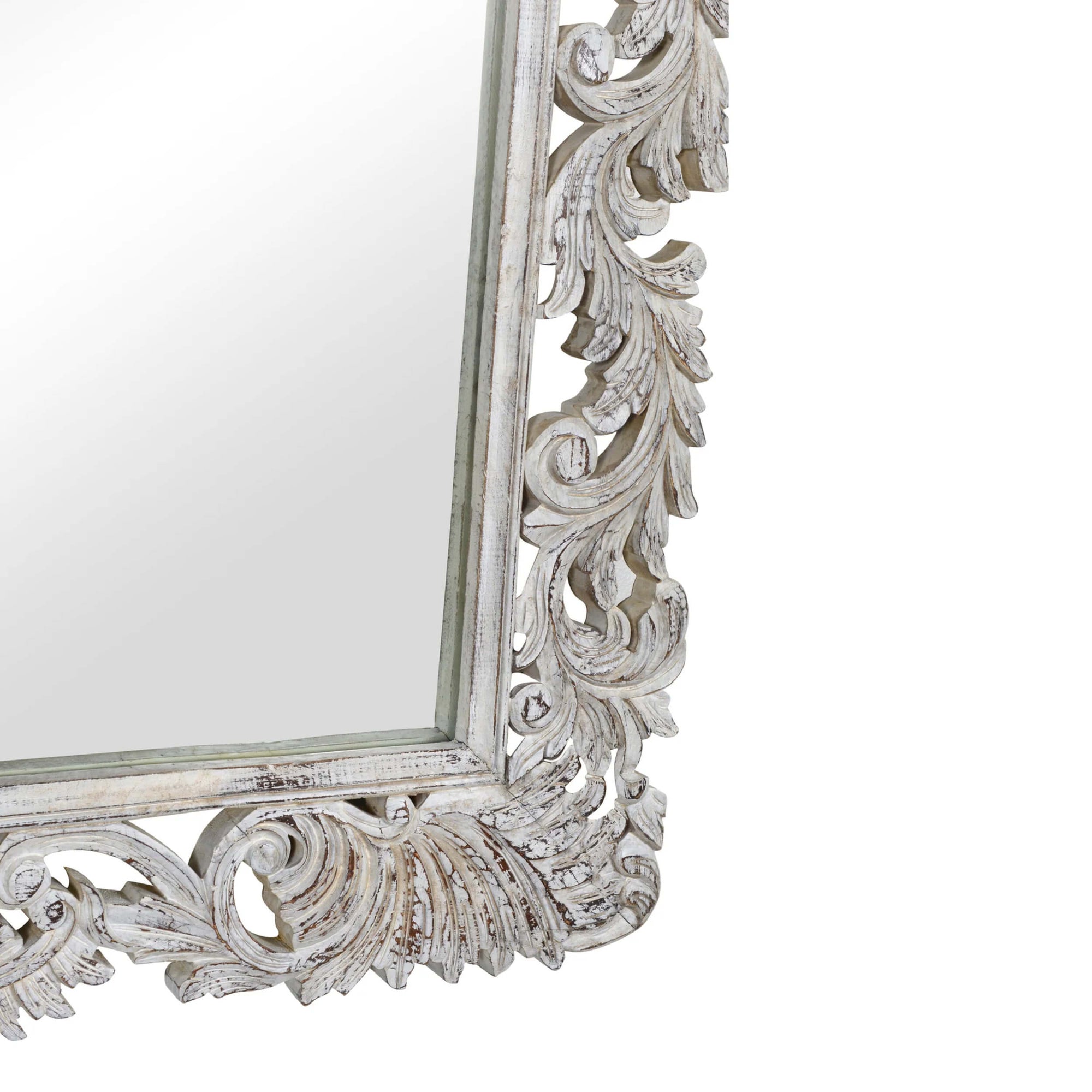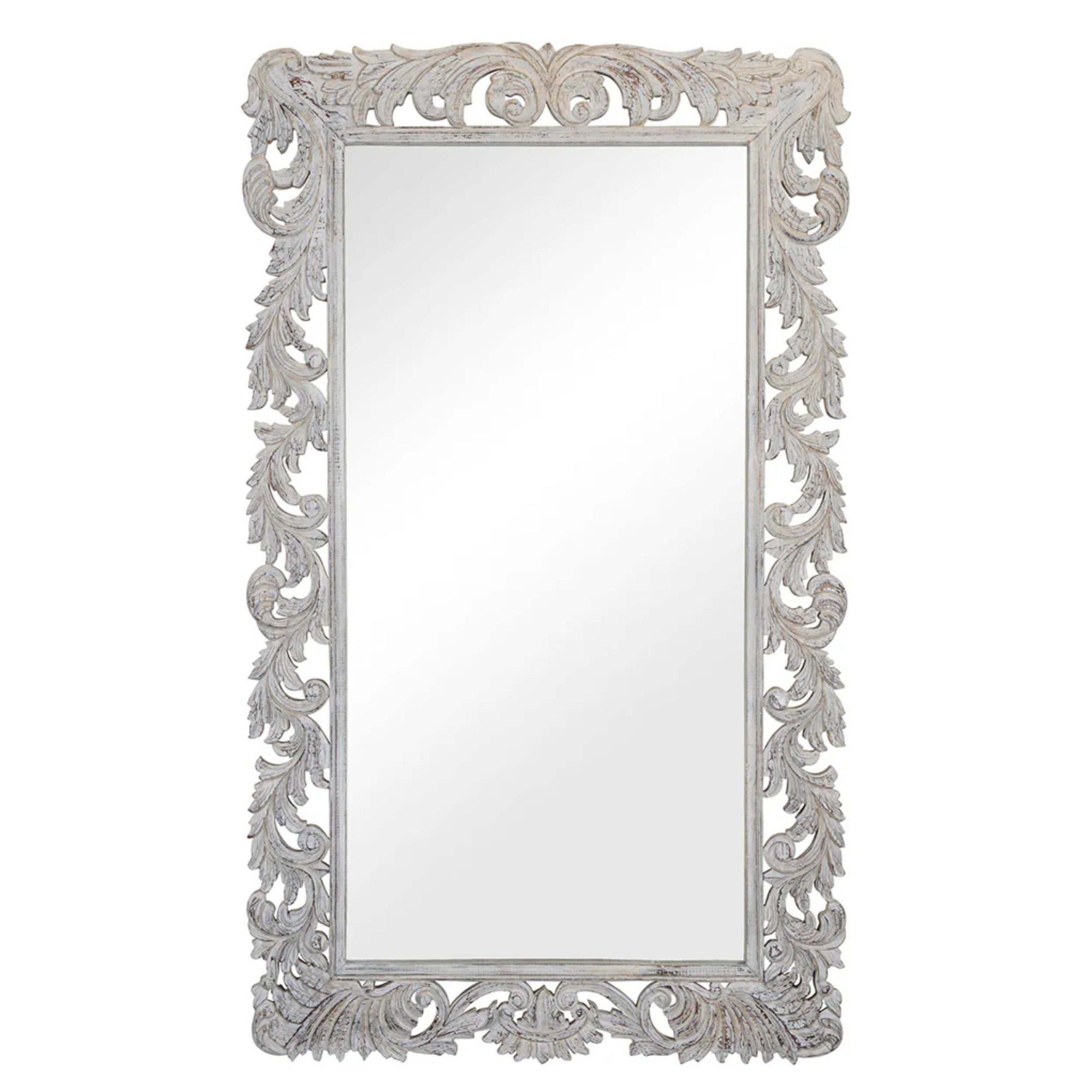 The Sophia Mirror features elegant hand-carved details and a beautifully distressed finish. Its graceful carvings make it a statement piece that reflects the elegance of the past in any modern room. Perfect for enhancing the beauty of your space, this mirror combines traditional craftsmanship with timeless style.
