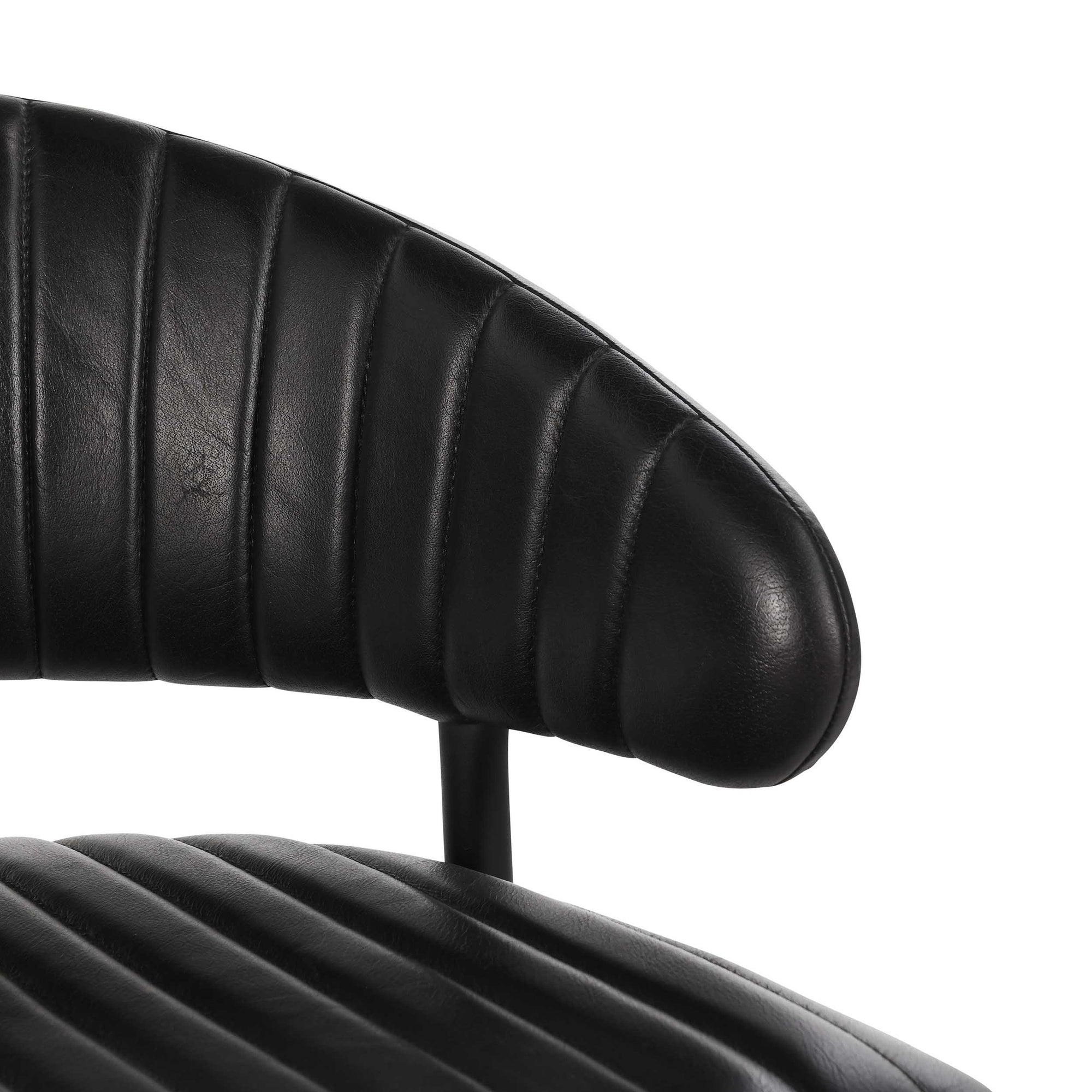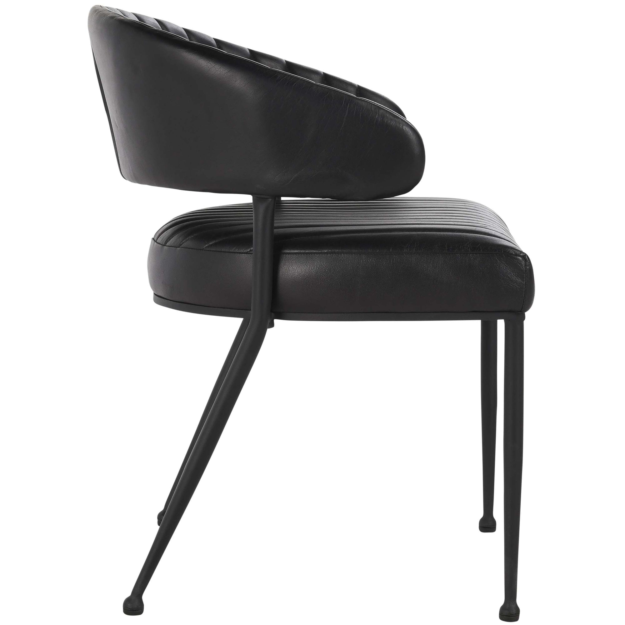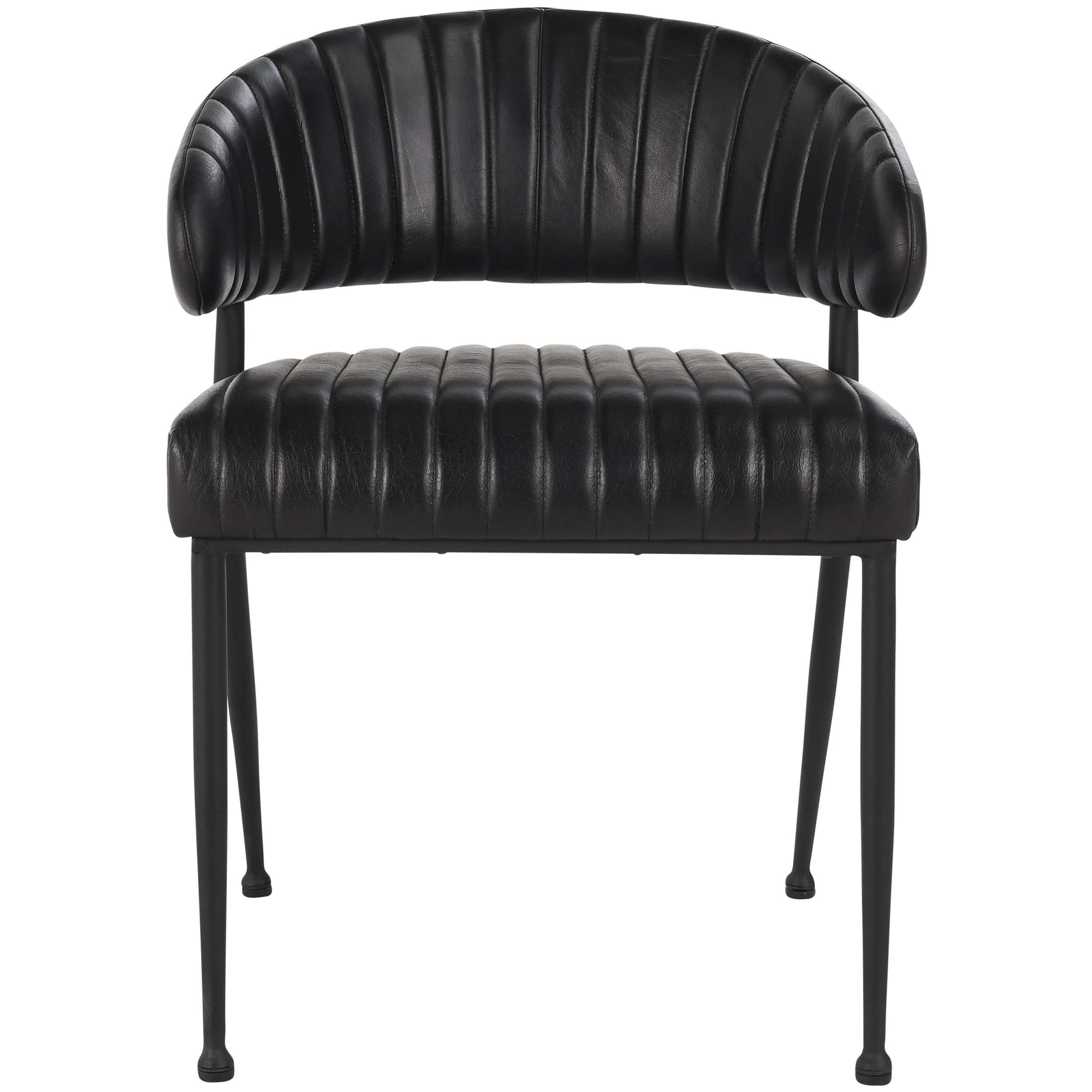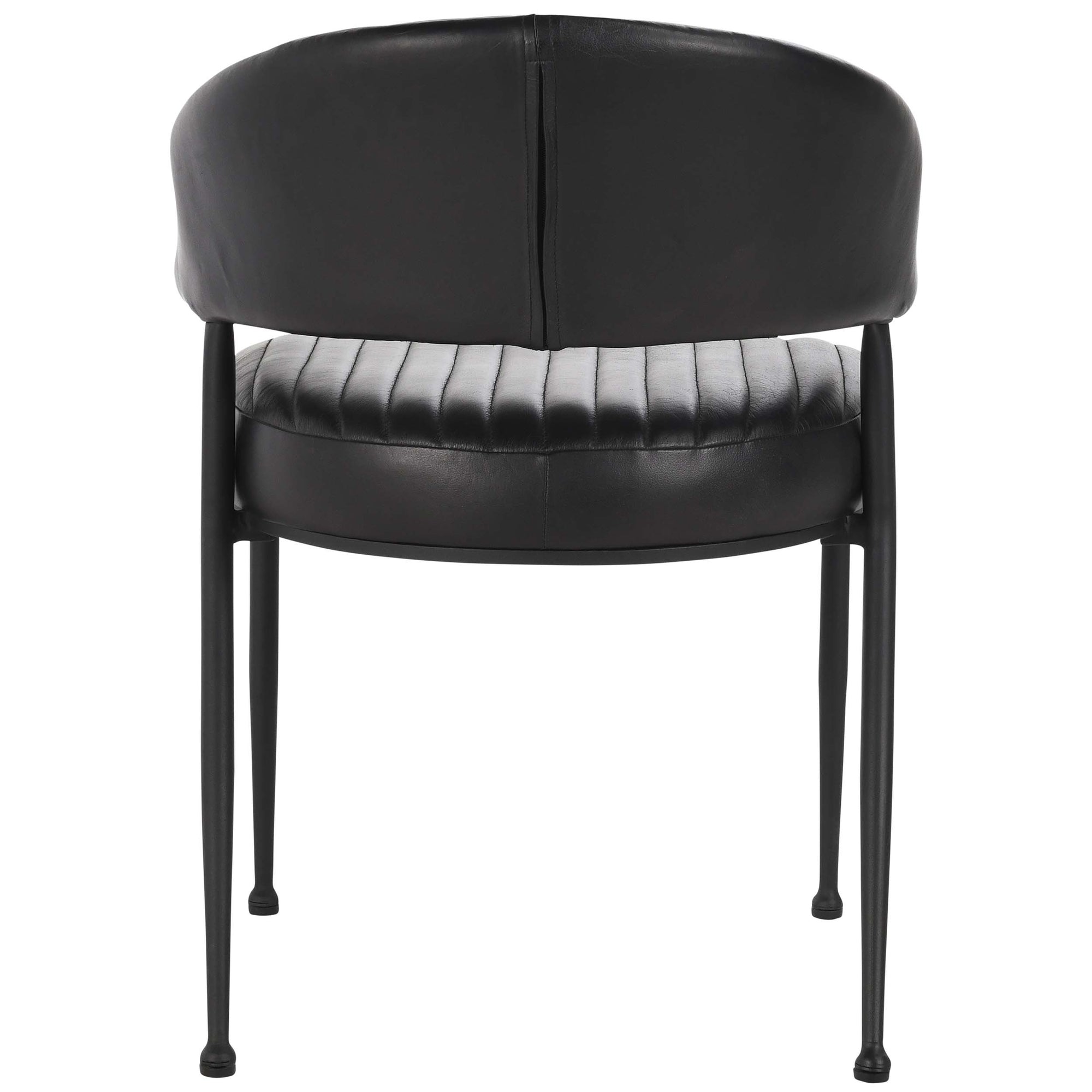 The Umbria Leather Dining Chair in Jet Black combines refined elegance with comfort. Featuring top-grain leather upholstery with sleek vertical channeling and sturdy iron legs, this set of two chairs adds understated luxury to any dining area. The padded seat and back ensure comfort while the durable construction provides long-lasting use.