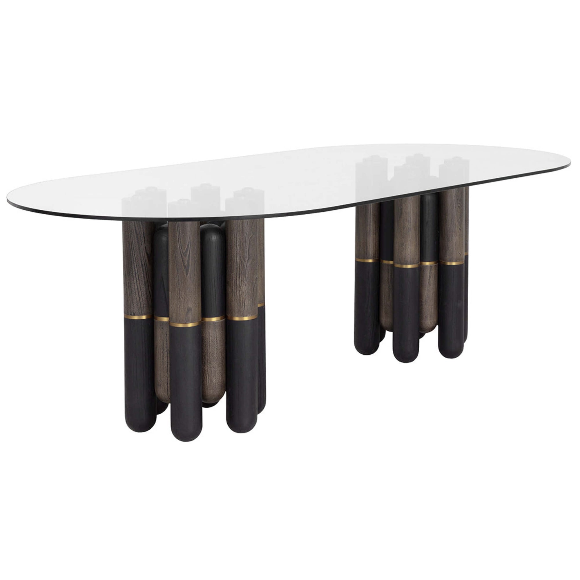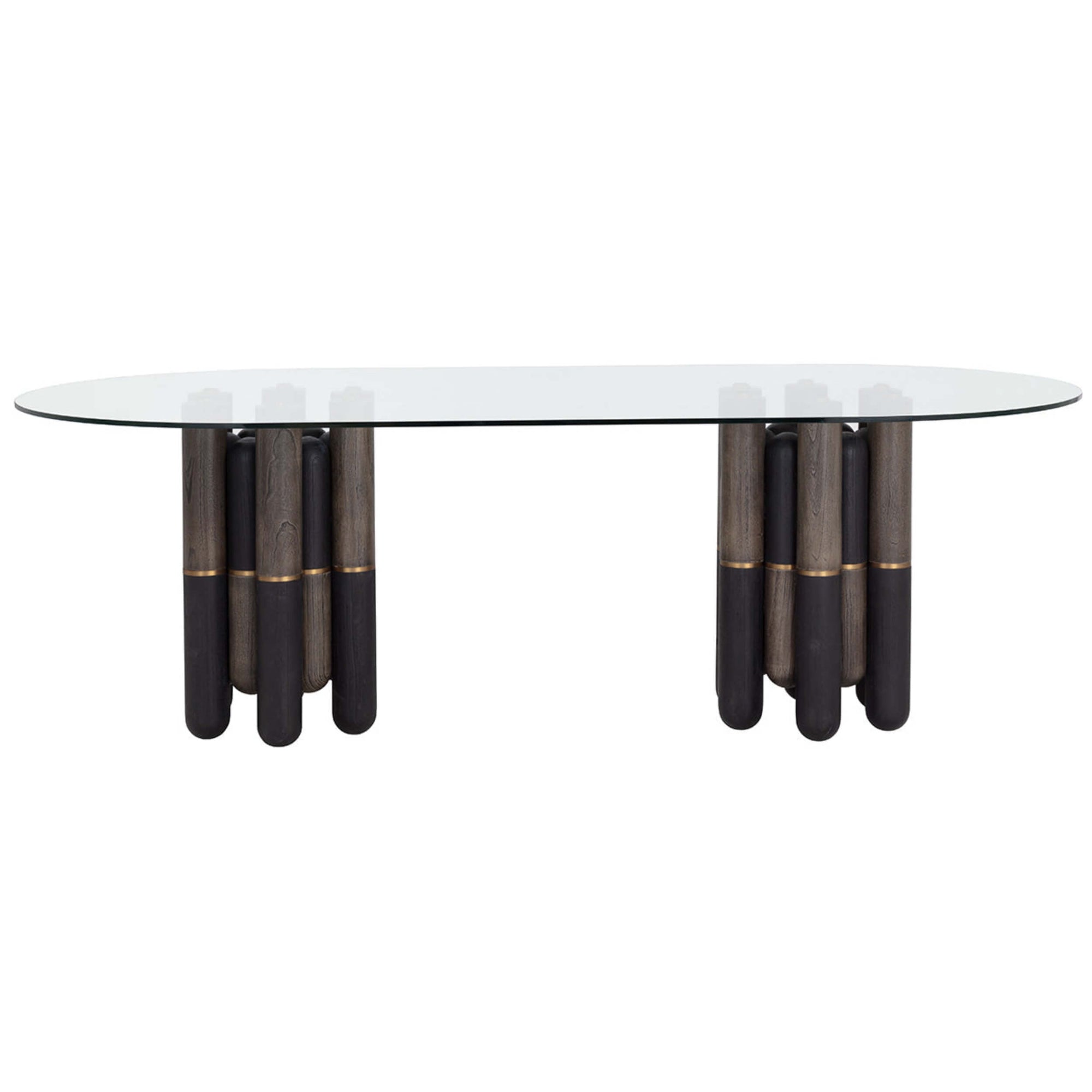 The Yanna Dining Table features an eclectic, sculptural base with a mix of dark and natural finishes accented by subtle metallic details. Its unique oval top and bold design bring playful character and modern sophistication to any dining space, making it a true statement piece for gatherings and everyday meals.