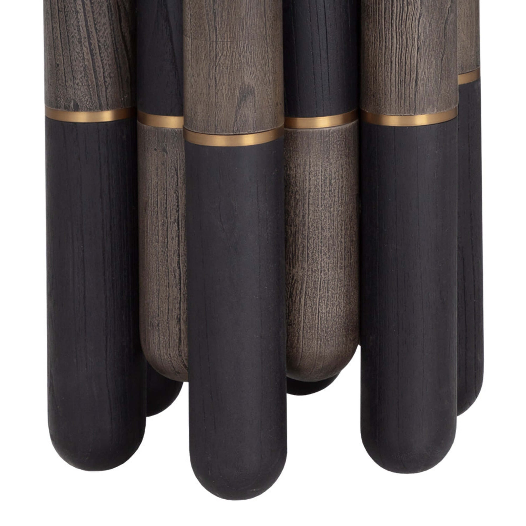 - Sculptural base with a mix of dark and natural finishes