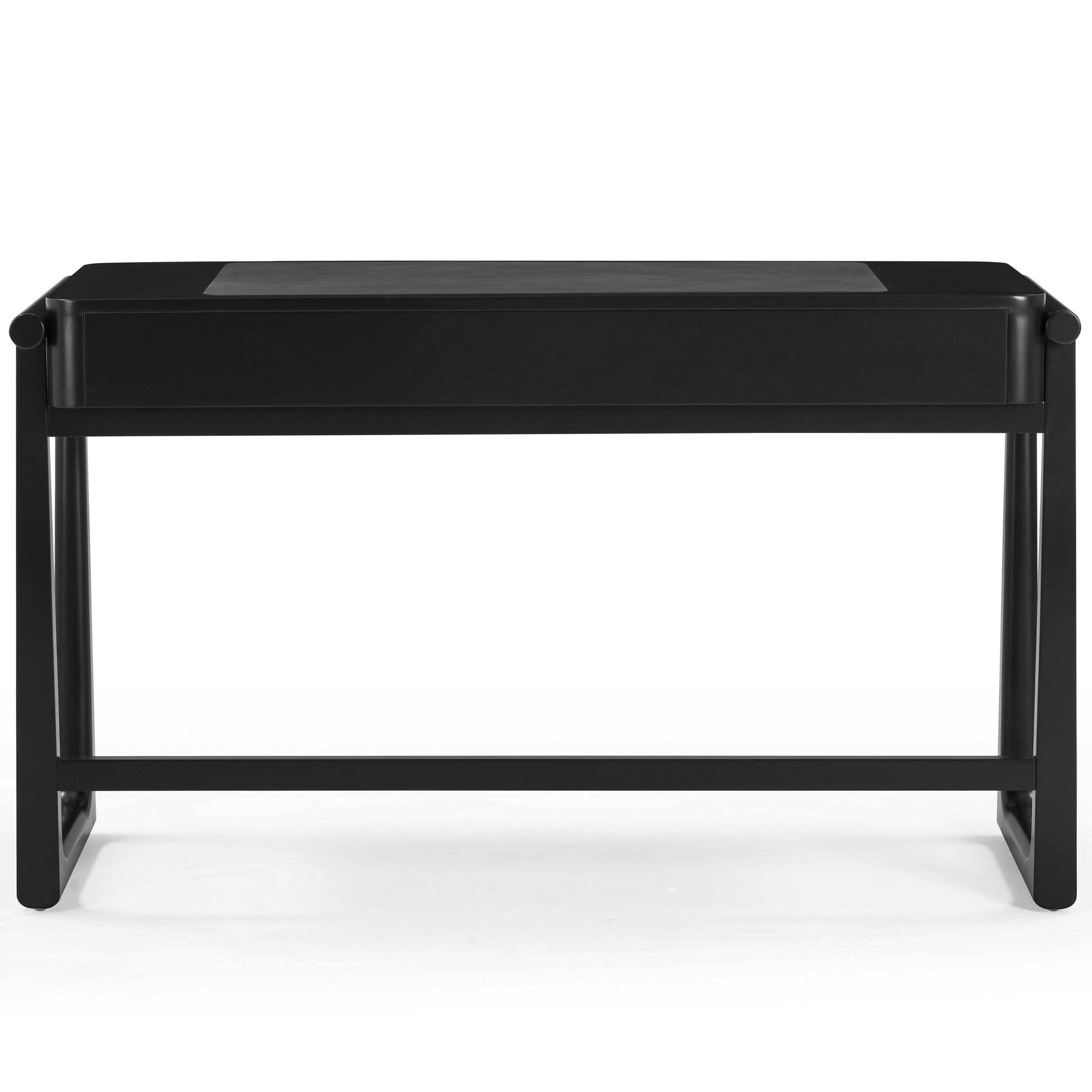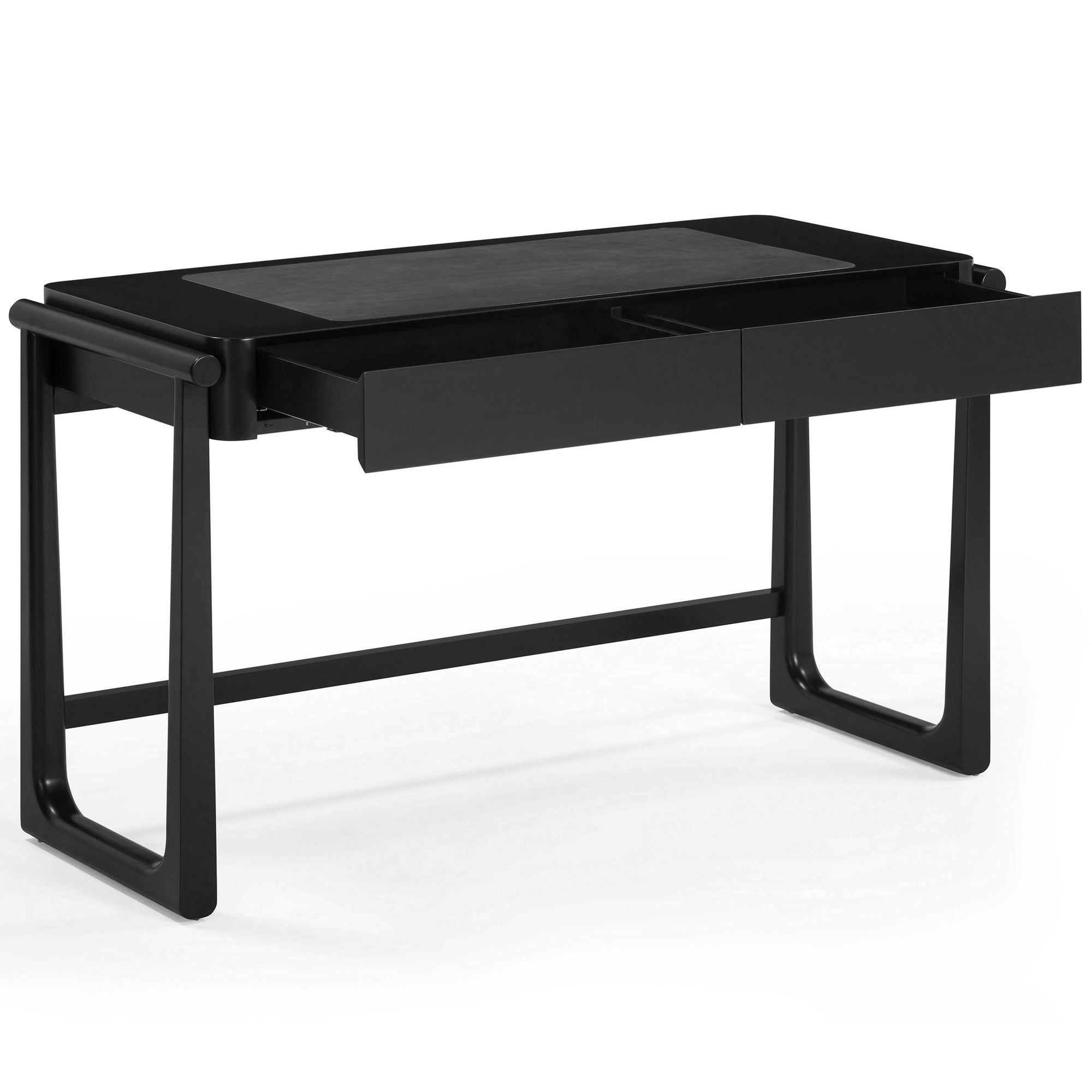The Alfalfa 2 Drawer Desk, Black combines chic style with practical functionality. Featuring two smooth-glide soft-closing drawers and a padded vegan-leather work surface, it provides ample storage and a durable workspace. Its sleek lacquer finish and elegant black color add sophistication to any home office, making this desk both stylish and highly functional.