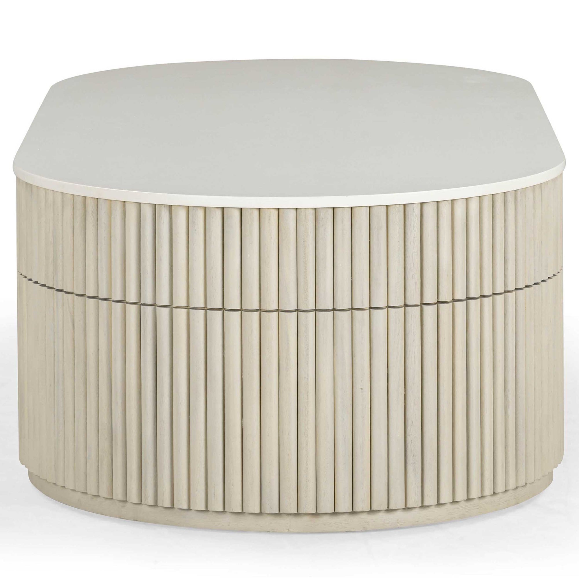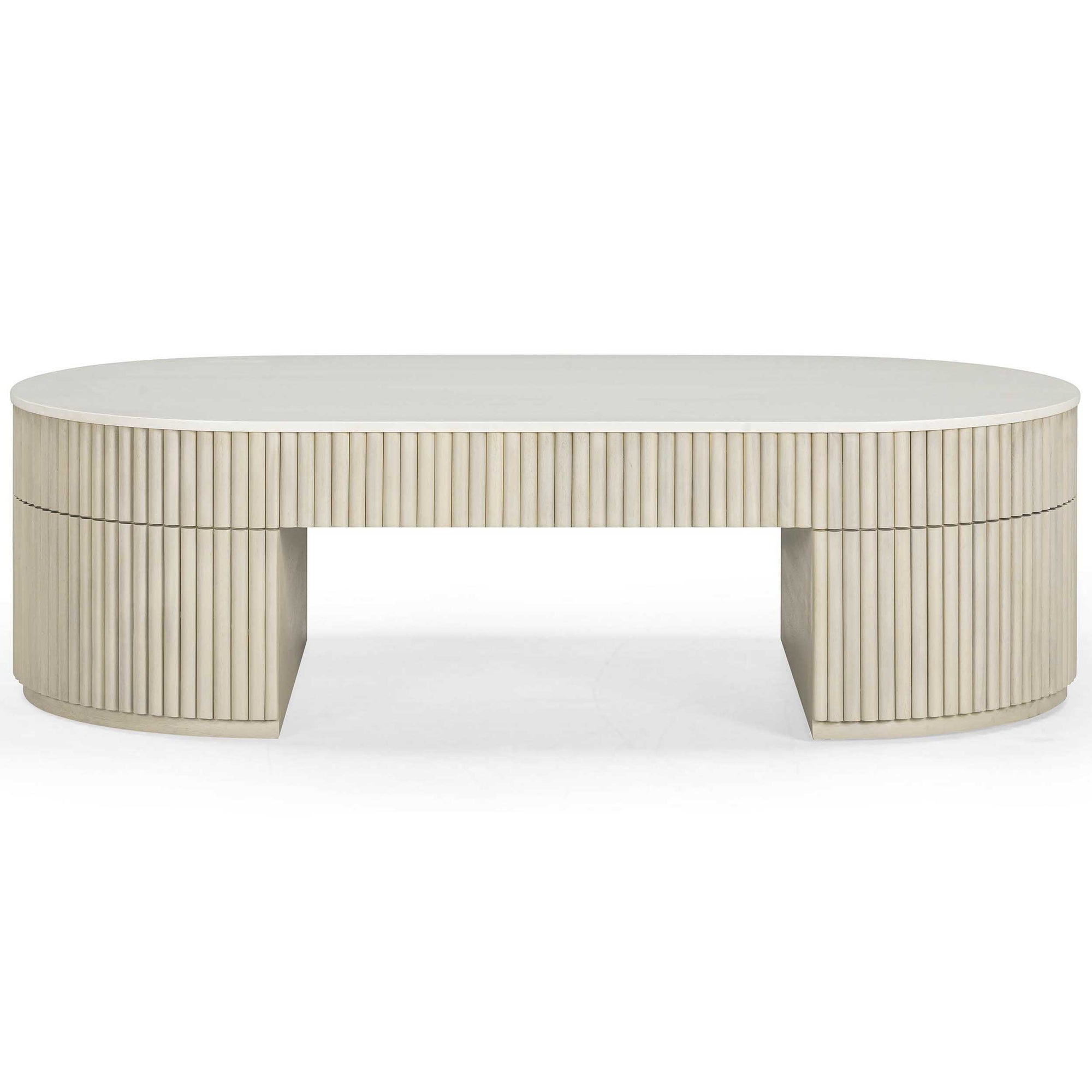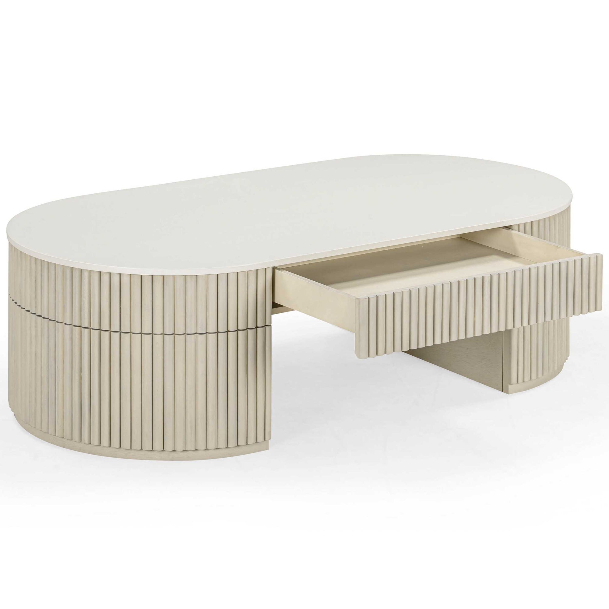 The Bella Large Storage Coffee Table in Cream combines artistry and function with a sculptural design crafted from solid acacia wood. Its channeling effect mimics stained glass with a matte texture, paired with a glossy top for easy cleaning. A soft-close drawer offers hidden storage, while its California-cool vibe makes it a true statement centerpiece for modern living spaces.