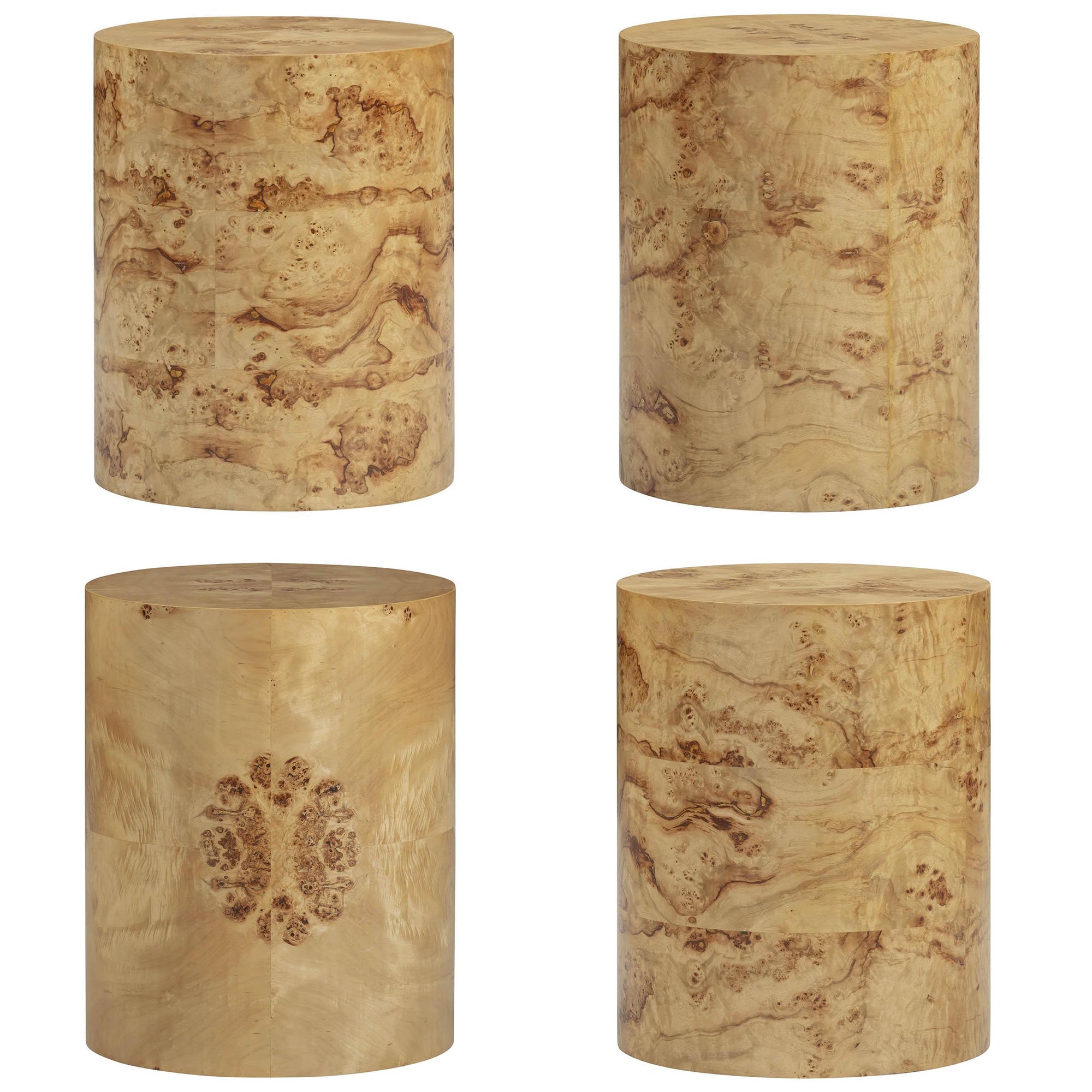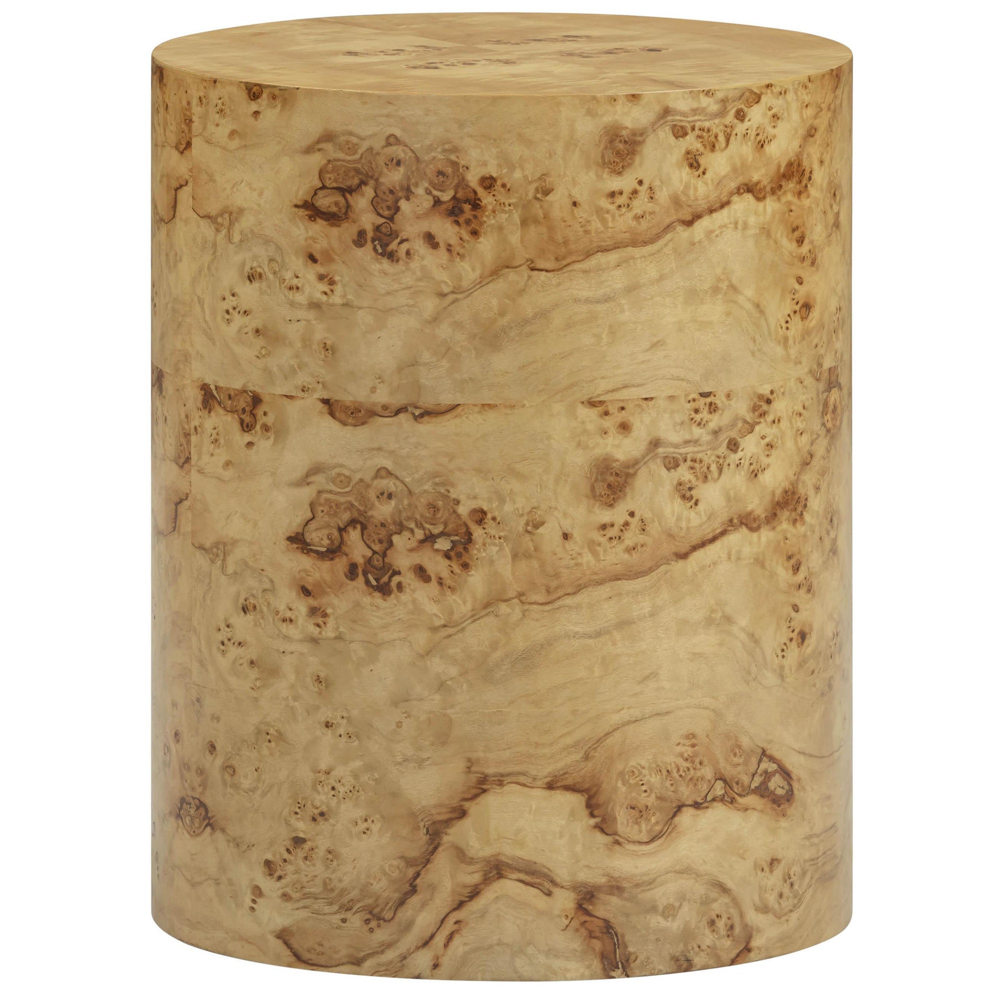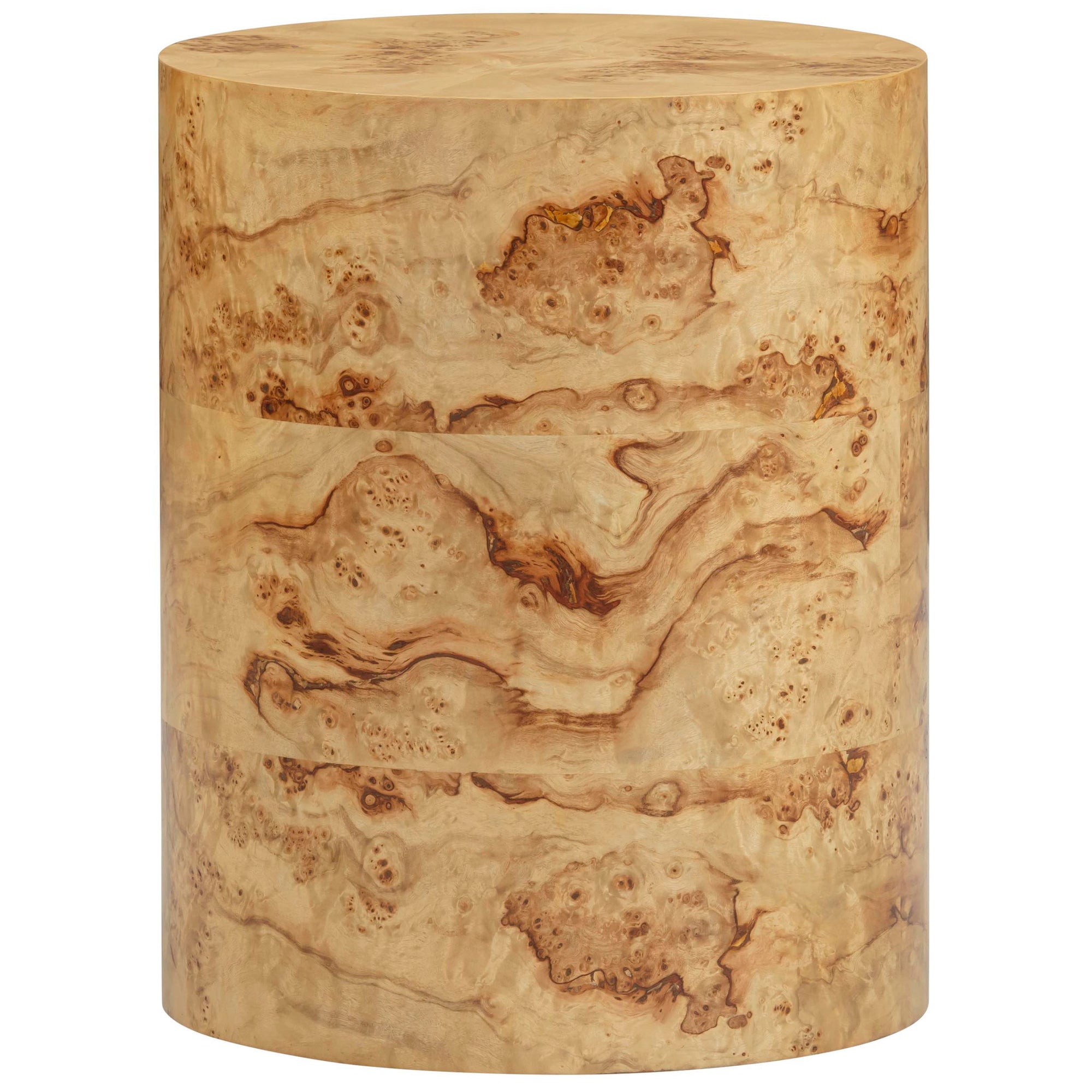 The Fig Burl Drum Side Table, Natural, combines organic warmth and visual rhythm in a sculptural drum silhouette. Wrapped in richly grained burl veneer with bookmatched panels, each table is unique due to natural variations in the wood. This side table adds subtle elegance and functional style to any living space.