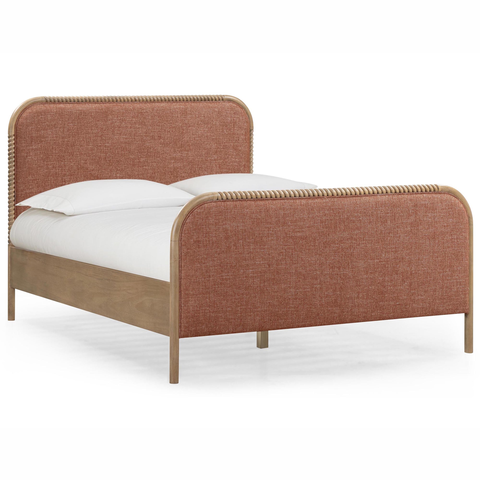 The Hatia Panel Bed brings warmth and texture to the bedroom with a balanced mix of upholstery and classic detailing. Upholstered headboard and footboard panels are framed by turned spindle-style wood, creating a layered look that feels inviting yet refined. Designed as a standout centerpiece, the Hatia Panel Bed includes supportive slats, eliminating the need for a box spring and offering both comfort and visual appeal.