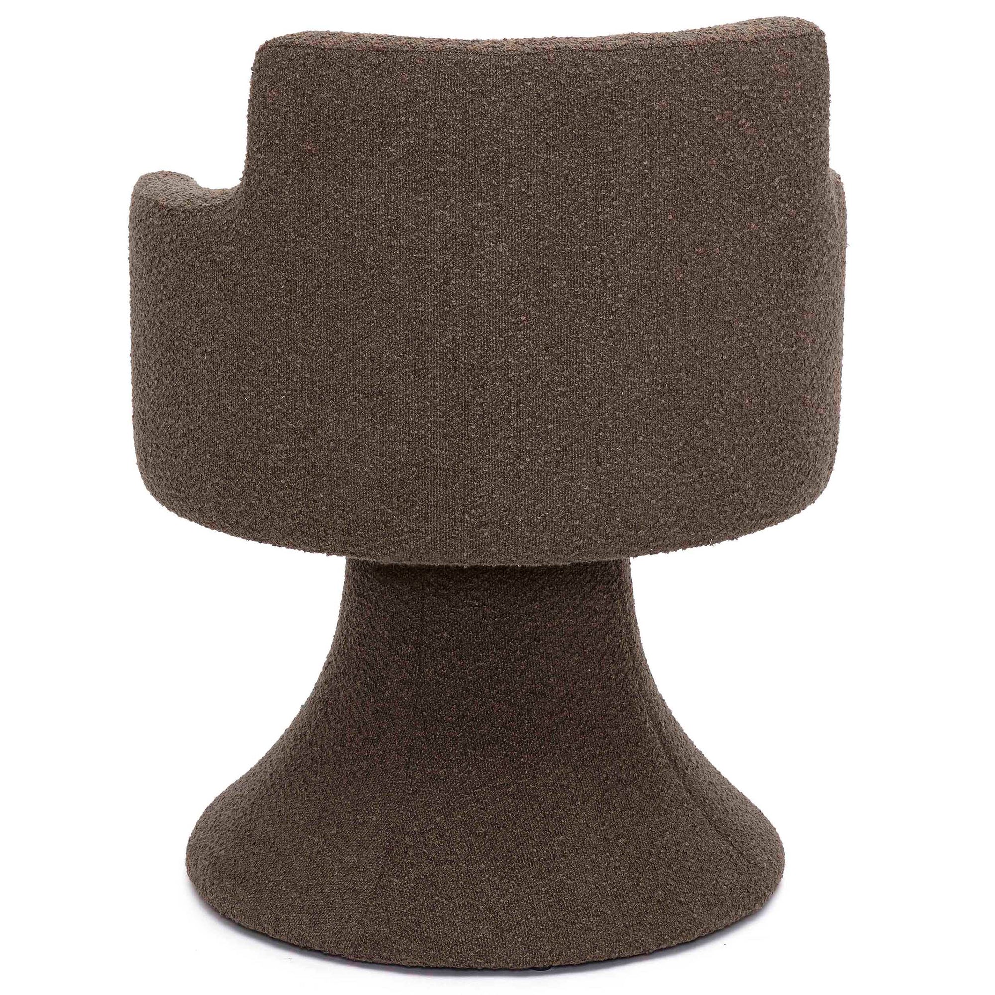 The Jeffree Swivel Dining Chair combines retro charm with modern design. Upholstered in durable chocolate brown performance boucle, it offers tall back support and cushioned seating for comfort. Its 360-degree swivel feature allows effortless interaction around the table, making it versatile as a dining chair or desk chair. Sleek lines and a playful twist on classic design make the Jeffree a stylish and functional addition to any space.