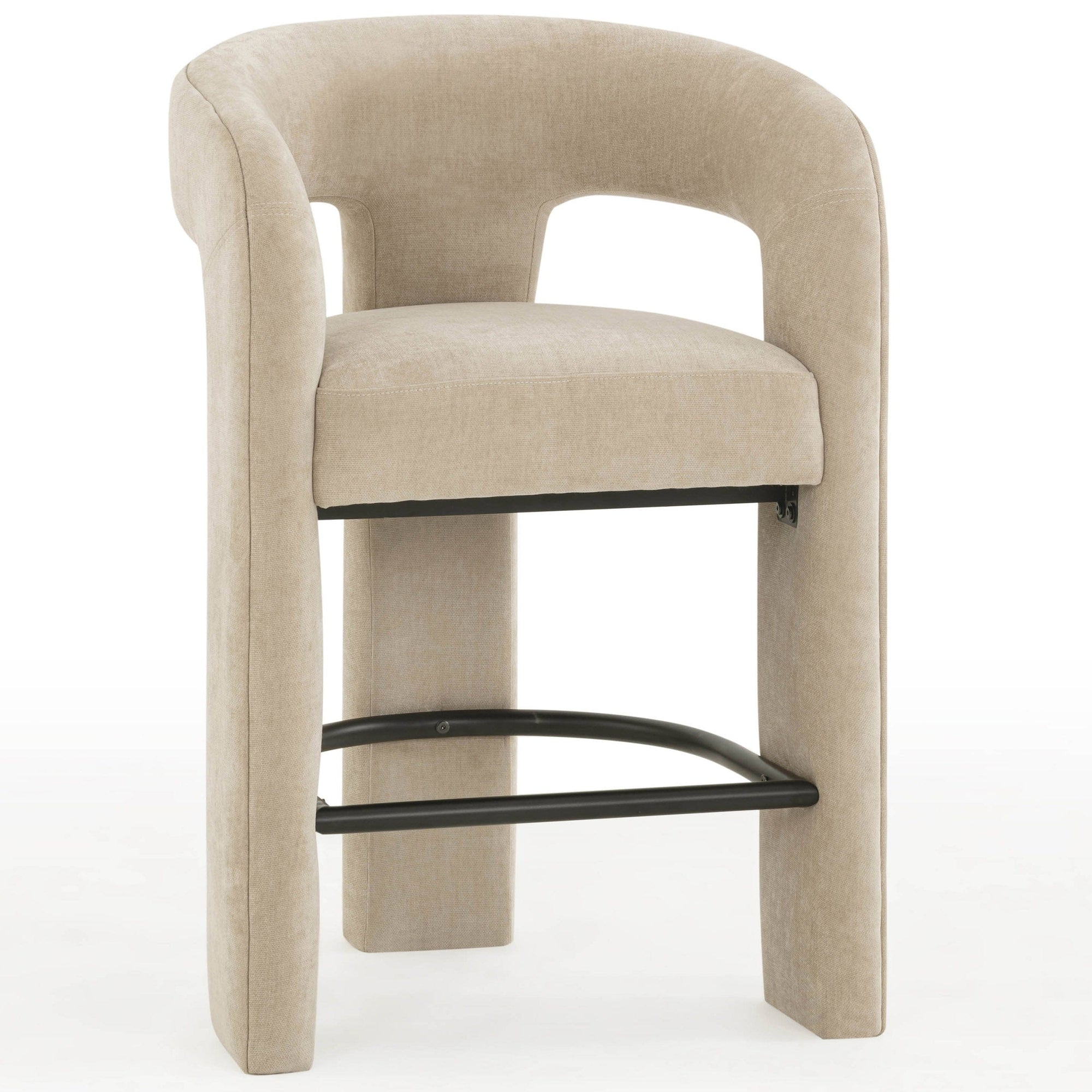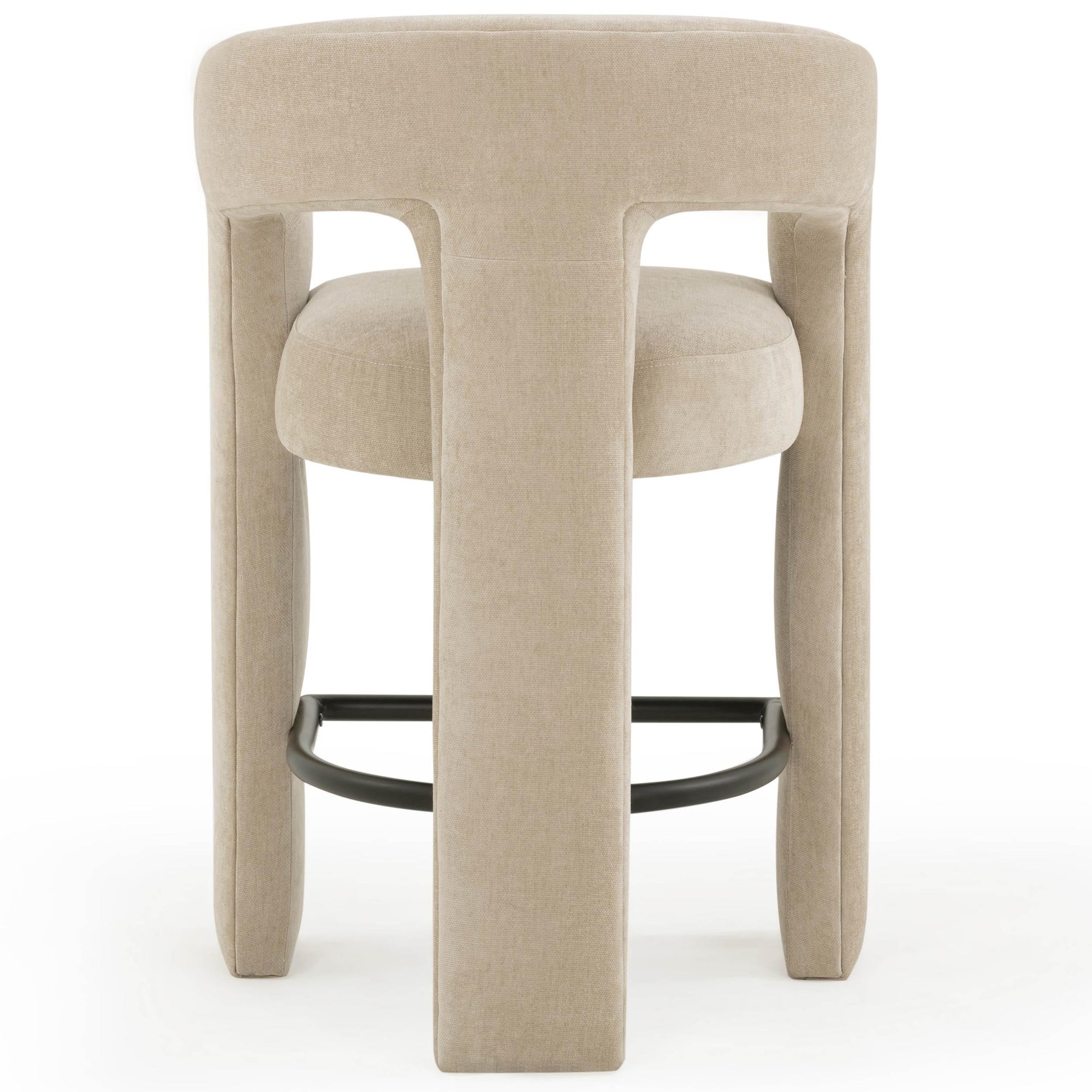 The Malone Chenille Stool, Taupe, blends comfort and style with a soft, textured chenille upholstery that is water-repellent and contract grade. Featuring padded arms, a curved shelter back, and a plush fiber-wrapped foam seat that retains its shape, this stool brings both elevated design and everyday durability to any dining space.
