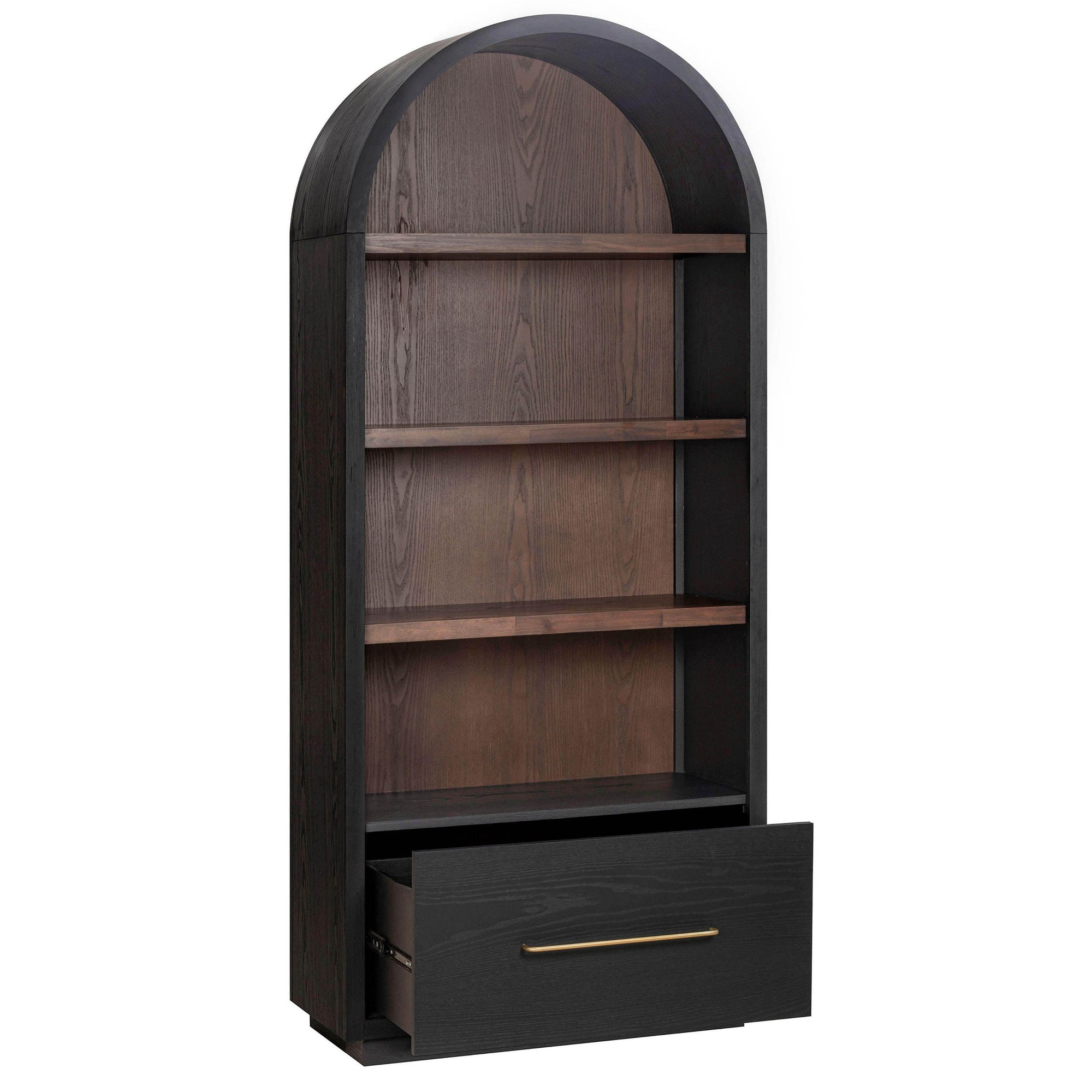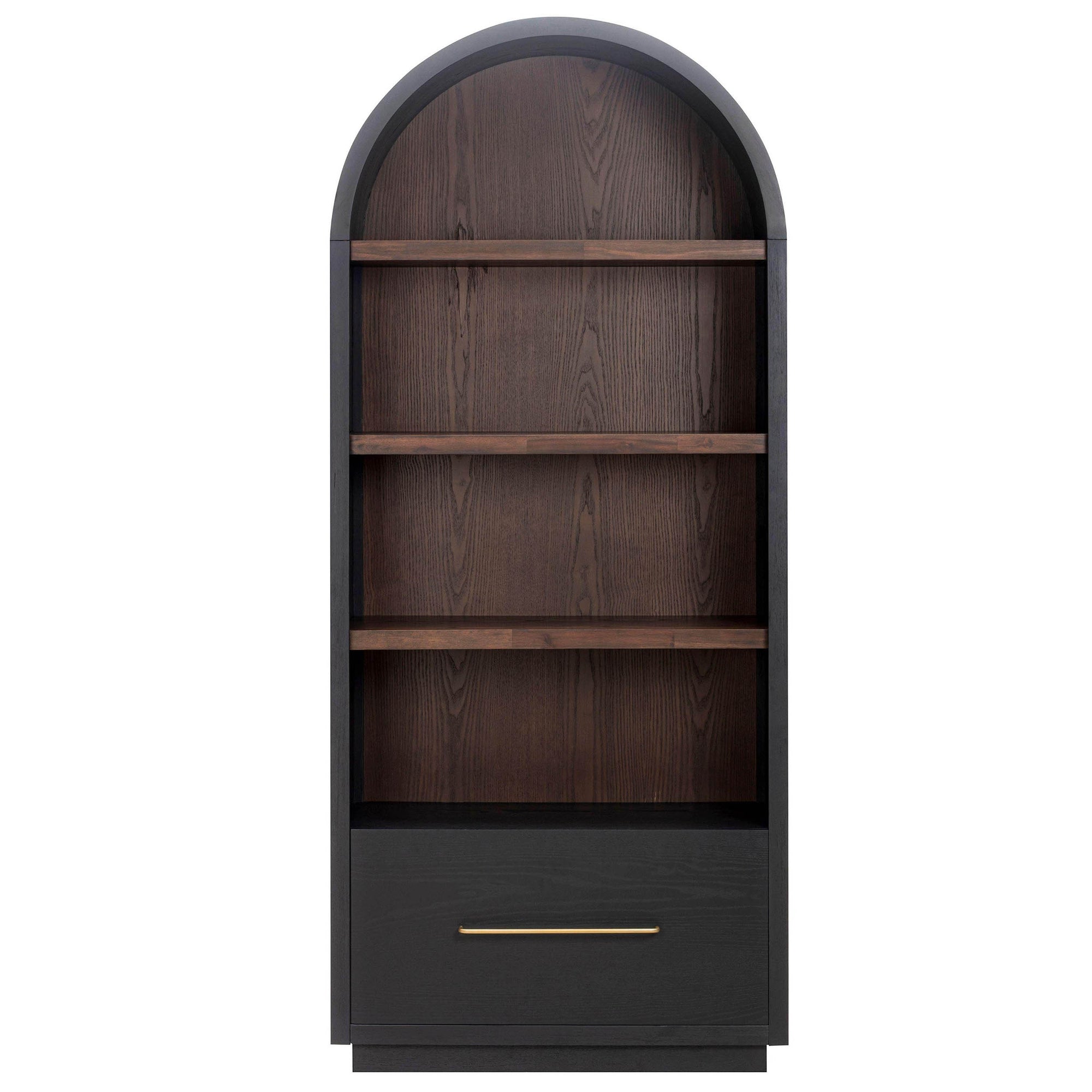The Marlow Bookcase with File Drawer combines sculptural design with practical storage. Featuring soft curves, open shelving, and a black and dark brown two-tone finish, it provides two adjustable shelves and a bottom soft-close drawer with file holder, perfect for keeping essentials organized. Its versatile style allows it to stand alone or be paired with other Marlow bookcases to create a built-in look, adding both elegance and functionality to any room.