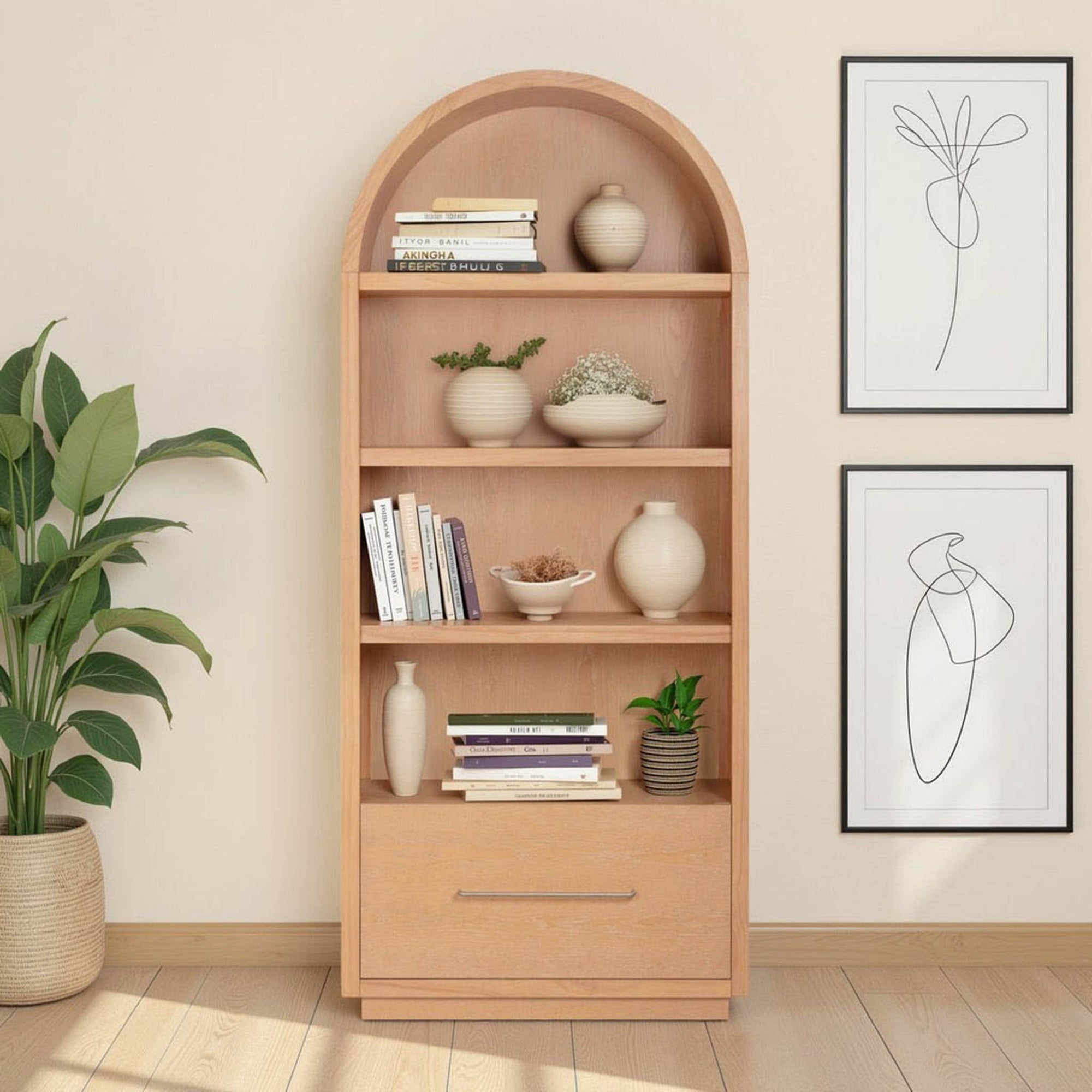 The Marlow Bookcase with File Drawer combines sculptural design with practical storage. Featuring soft curves, open shelving, and a natural wood finish, it provides two adjustable shelves and a bottom soft-close drawer with file holder, perfect for keeping essentials organized. Its versatile style allows it to stand alone or be paired with other Marlow bookcases to create a built-in look, adding both elegance and functionality to any room.