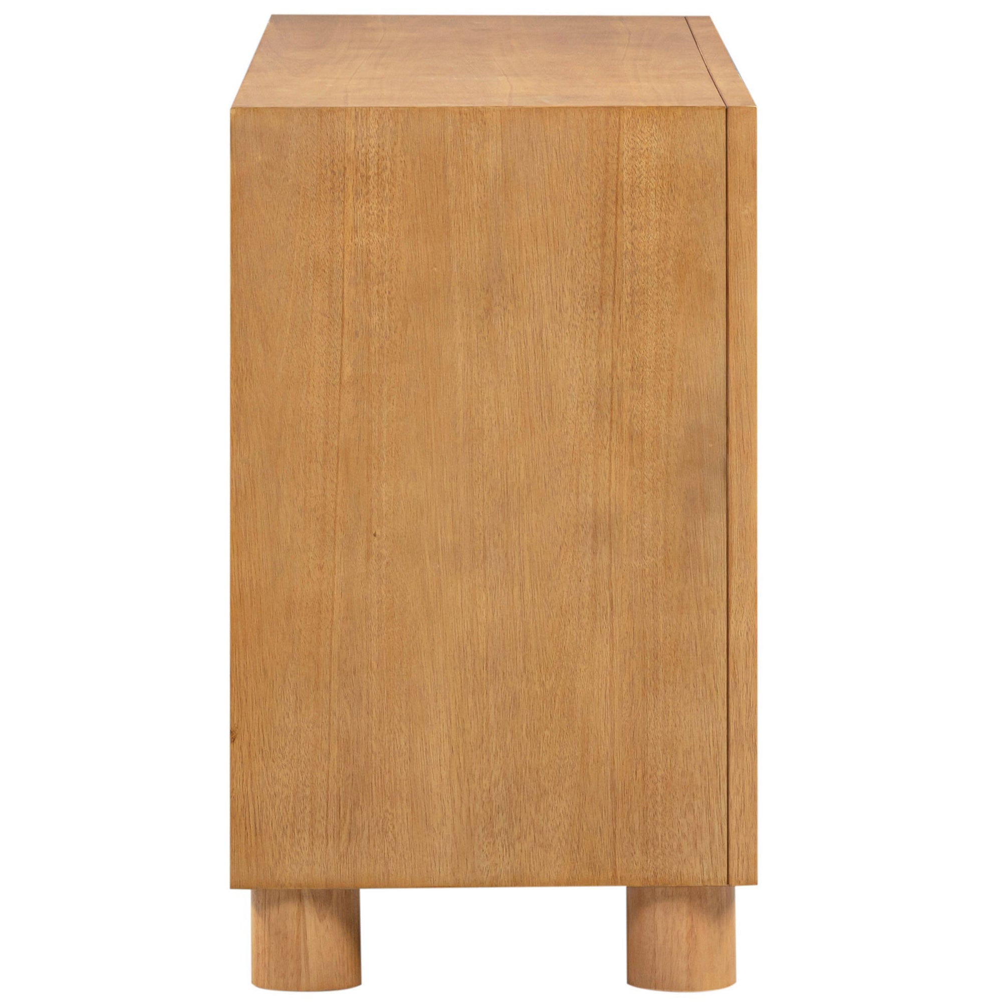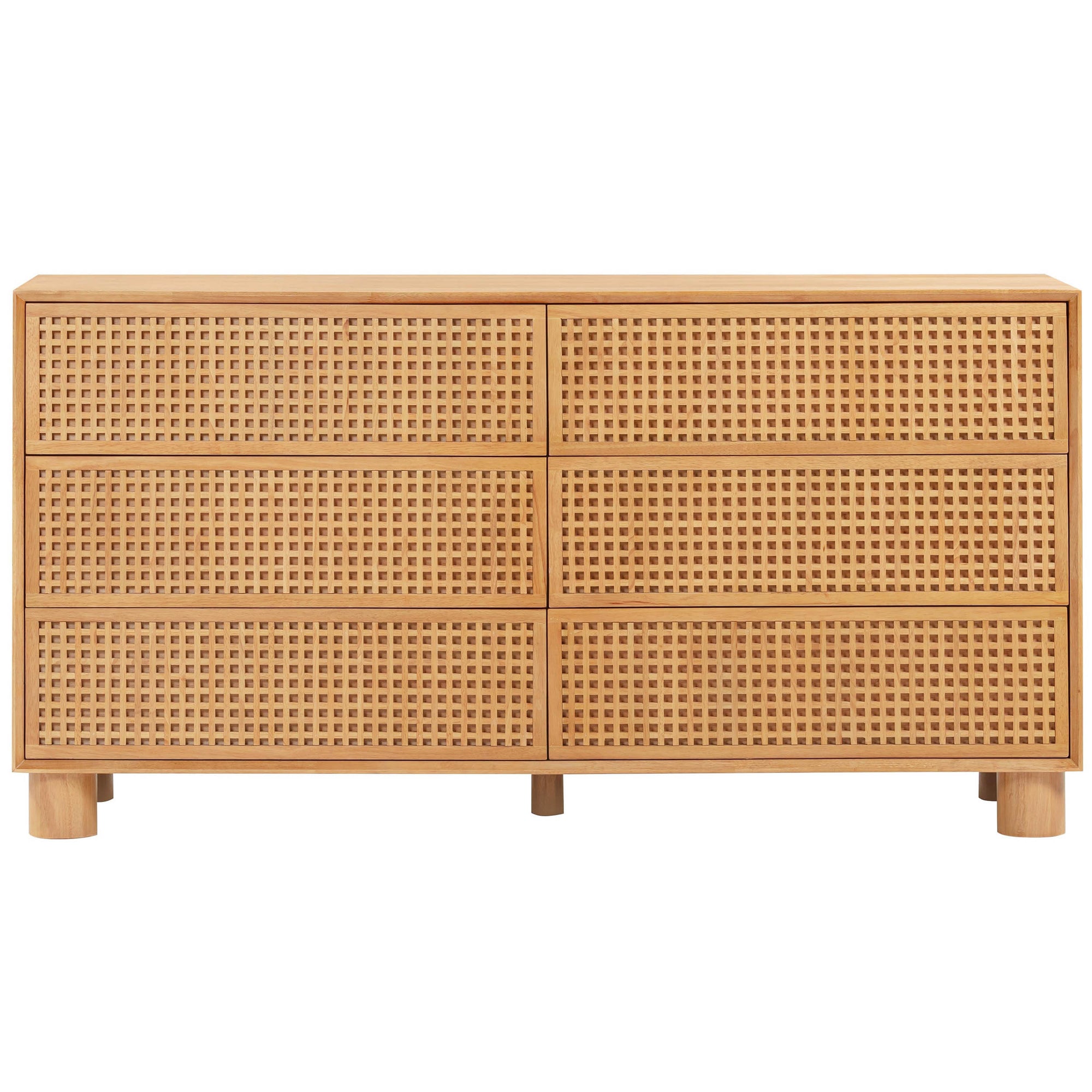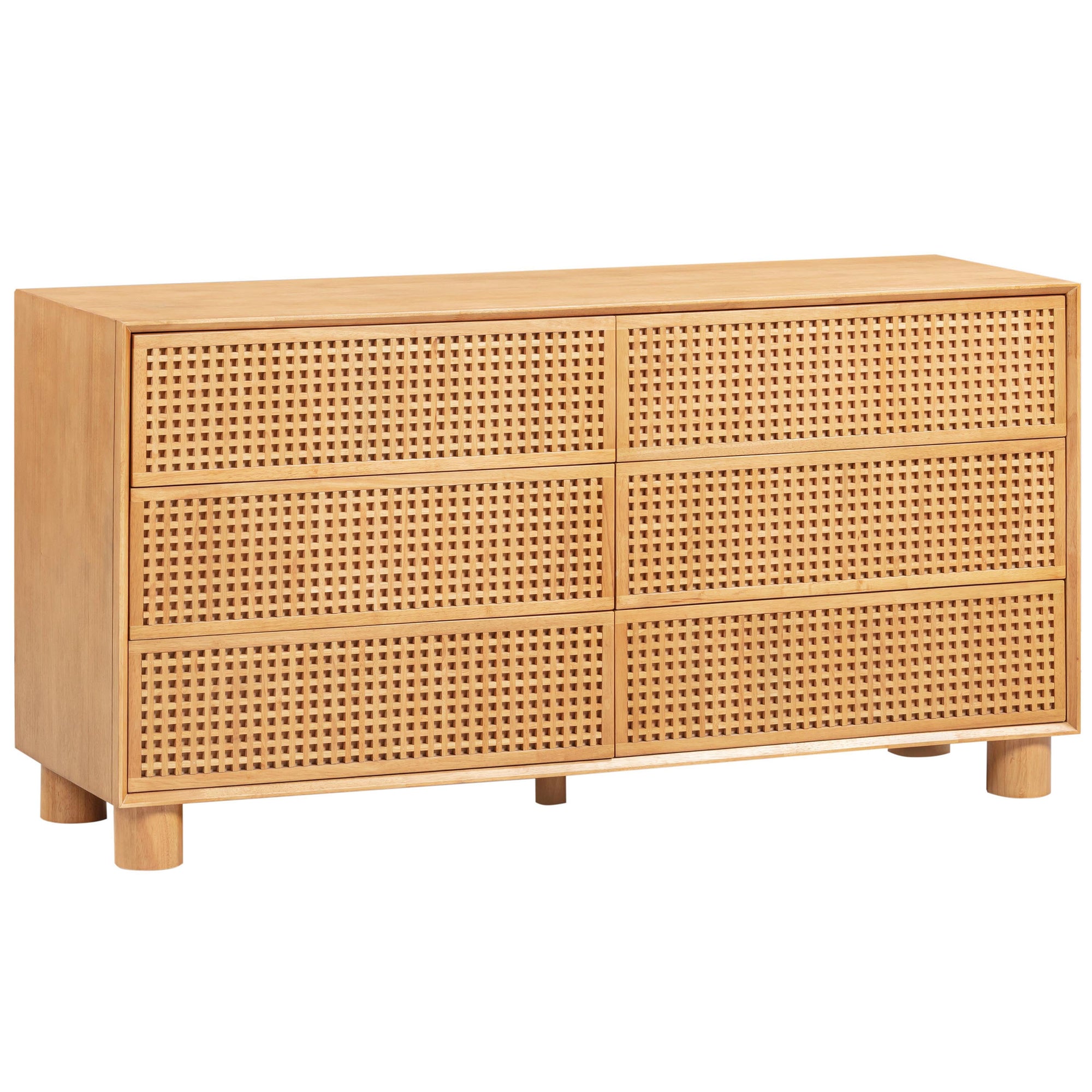 The Miles Natural Wood Dresser delivers a sophisticated blend of sculptured Memphis forms and organic natural finishes. Handcrafted with solid wood cross-hatch patterns on the door fronts, this piece offers a clean exterior that highlights the beauty of natural materials. Six smooth-gliding, push-to-open drawers—including felt-lined top drawers—provide ample storage and a high-end feel without the need for visible hardware.