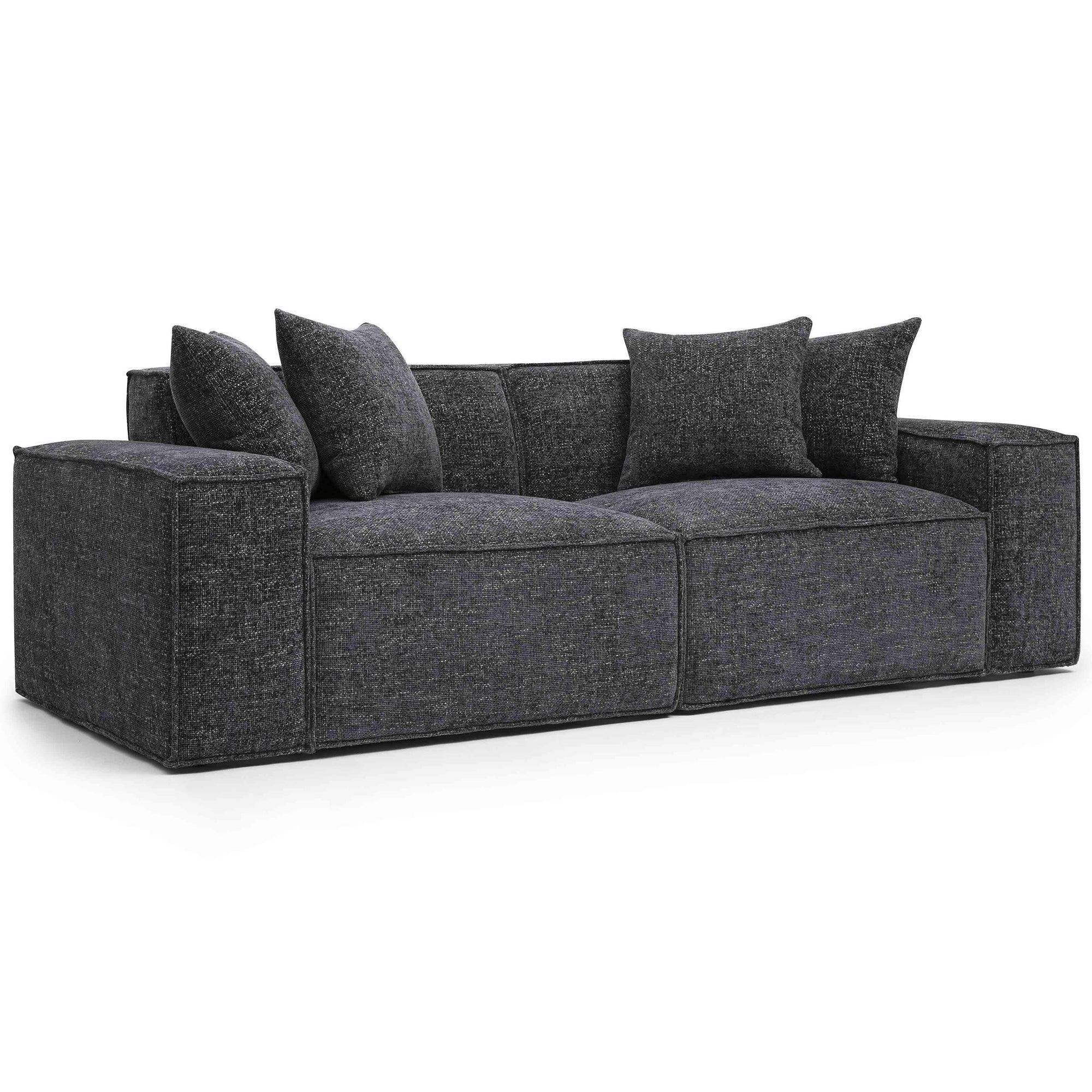 The Mindy Loveseat combines modular flexibility with cozy texture as part of the Mindy Modular collection. Upholstered in soft chenille basketweave with thick stitching, it features deep seating and plush cushions for comfort. Built-in alligator clips allow easy configuration, making it simple to pair with other pieces from the collection. This loveseat adds both style and functionality to any living space.