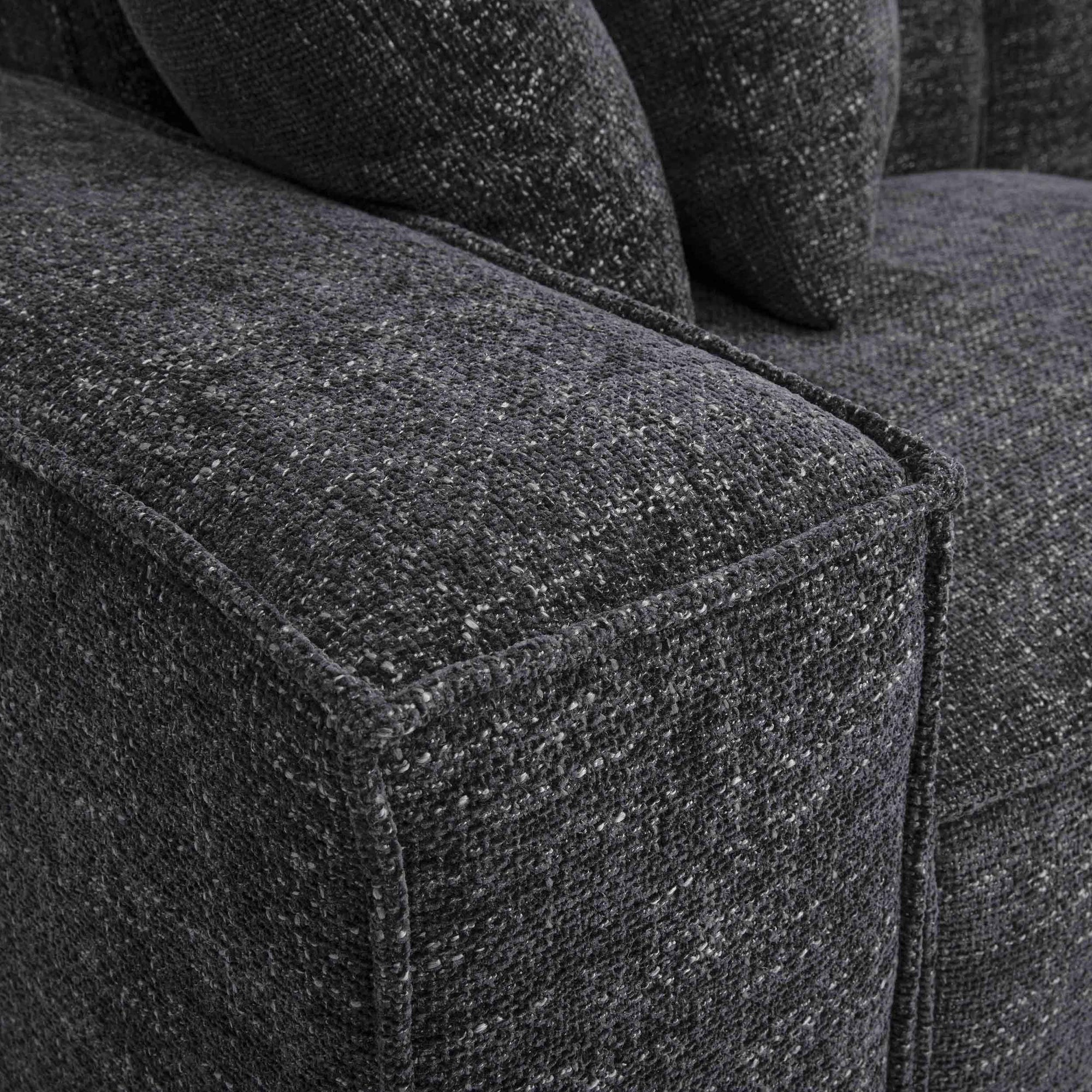 The Mindy Sofa combines modular flexibility with cozy texture as part of the Mindy Modular collection. Featuring soft chenille basketweave, thick stitching, and deep seating, this sofa delivers both comfort and style. Built-in alligator clips allow easy configuration, making it simple to pair with other modular pieces from the collection for a custom seating arrangement that fits your space perfectly.
