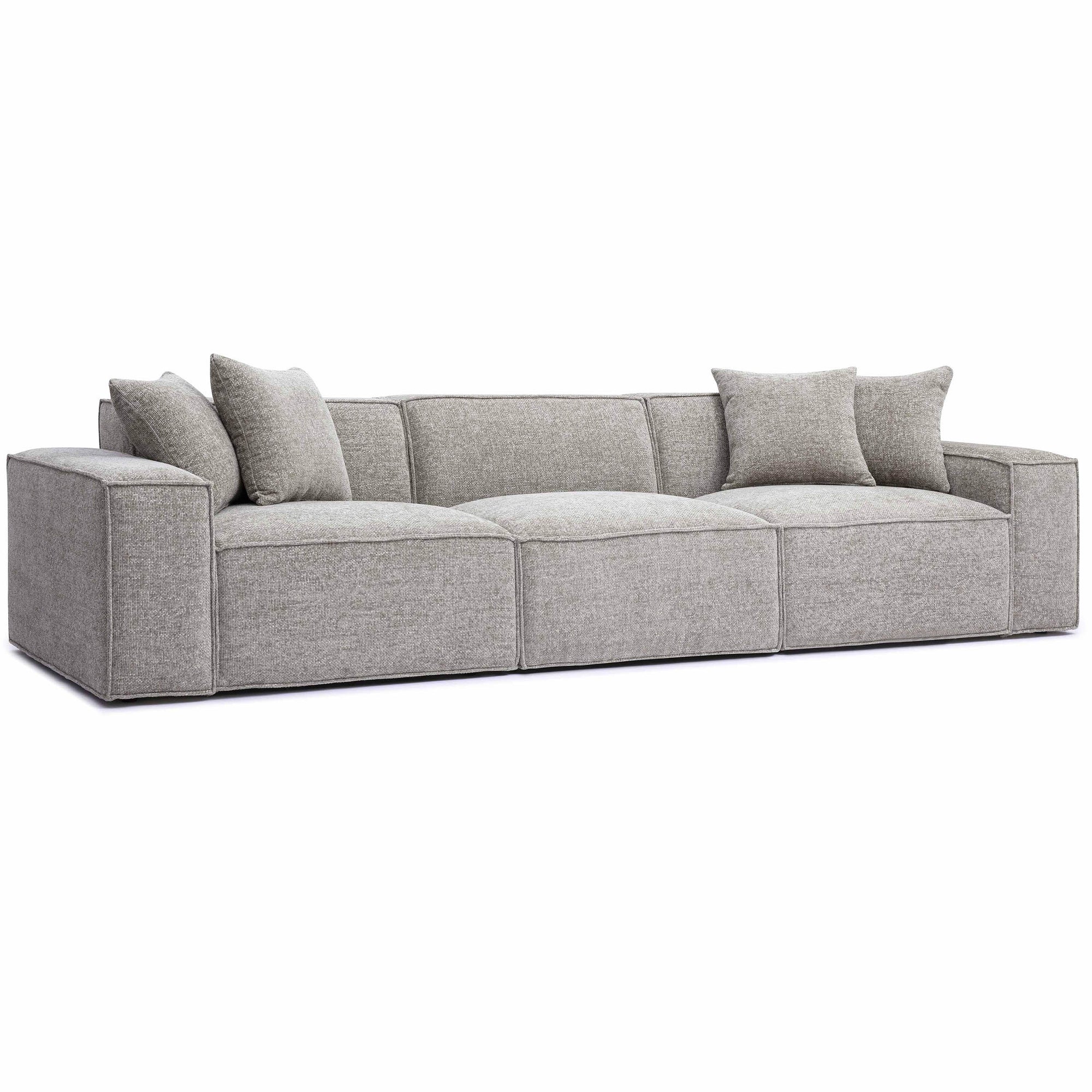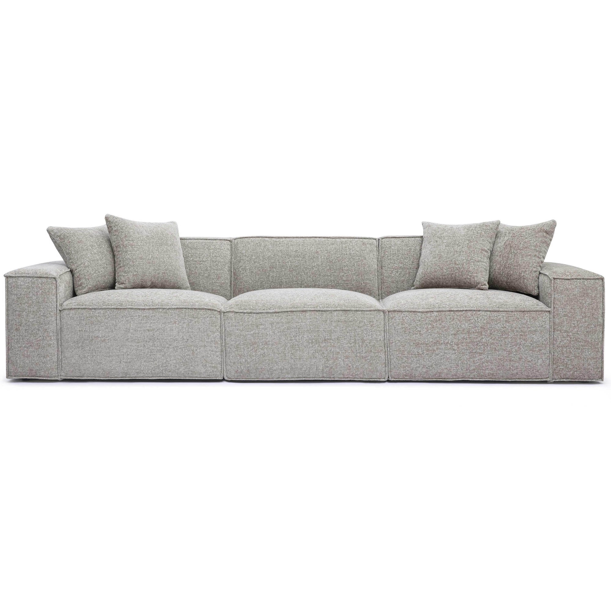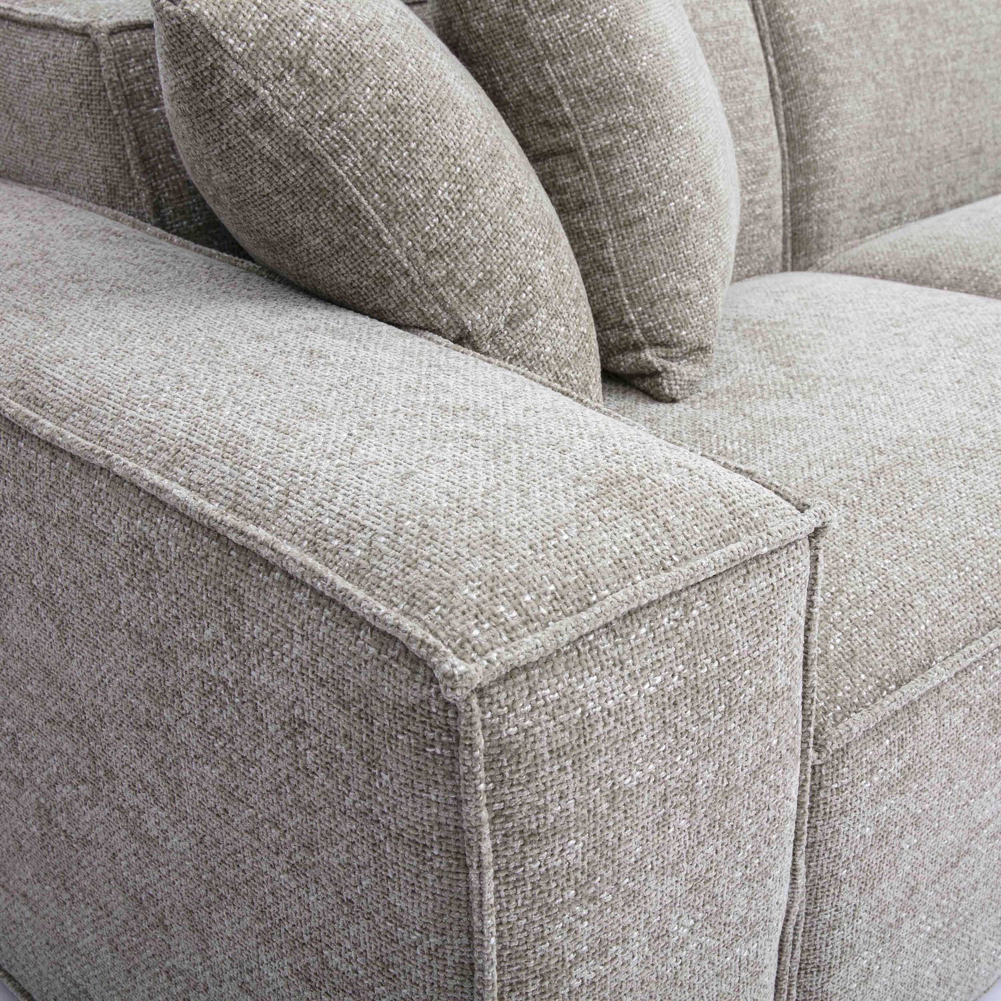 The Mindy Sofa combines modular flexibility and cozy texture as part of the Mindy Modular collection. Upholstered in soft chenille basketweave with thick stitching, it features deep seating and plush cushions for comfort. Built-in alligator clips allow easy configuration, making it simple to pair with other modular pieces in the collection. This sofa adds style and functionality to any living space.