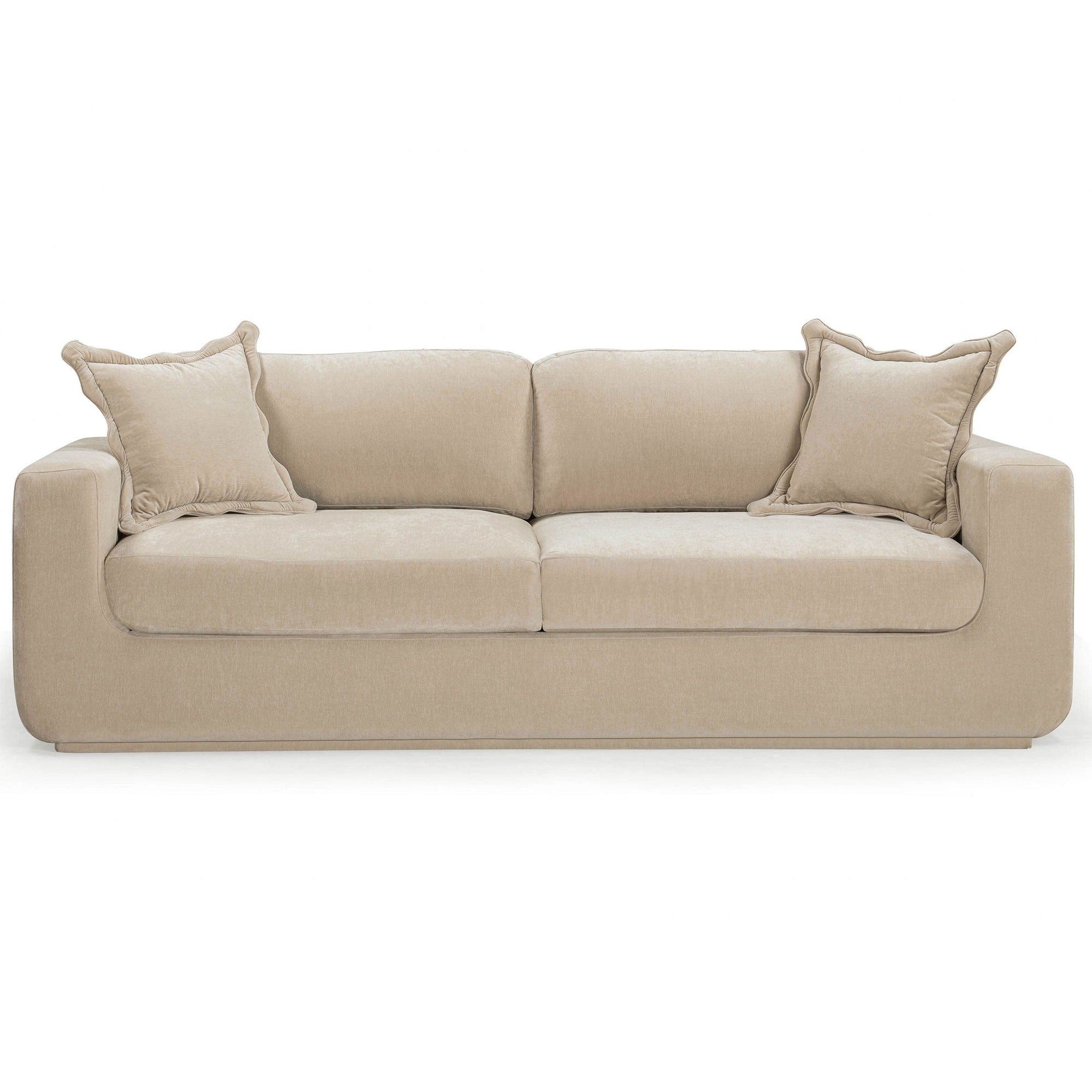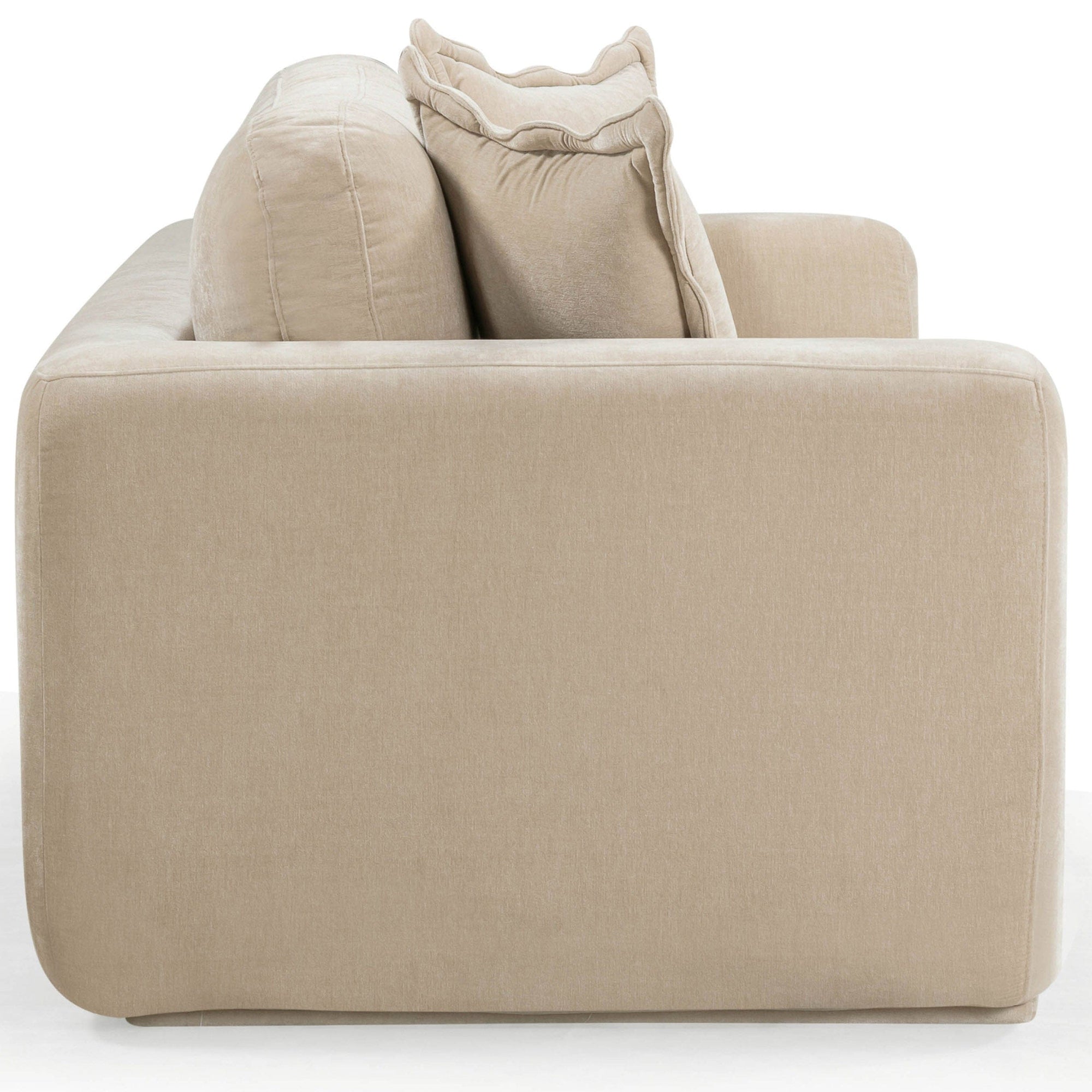 The Miri Sofa combines bold design with supreme comfort. Upholstered in high-durability velvet made from 50% recycled fibers, it features deep seating and plush scalloped pillows for a cozy, stylish experience. Skillfully handmade, this sofa is a standout piece that adds both sustainable luxury and modern elegance to any living space.