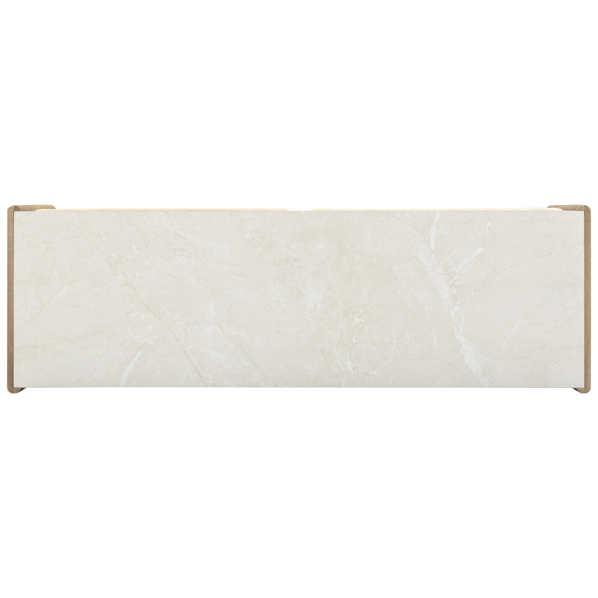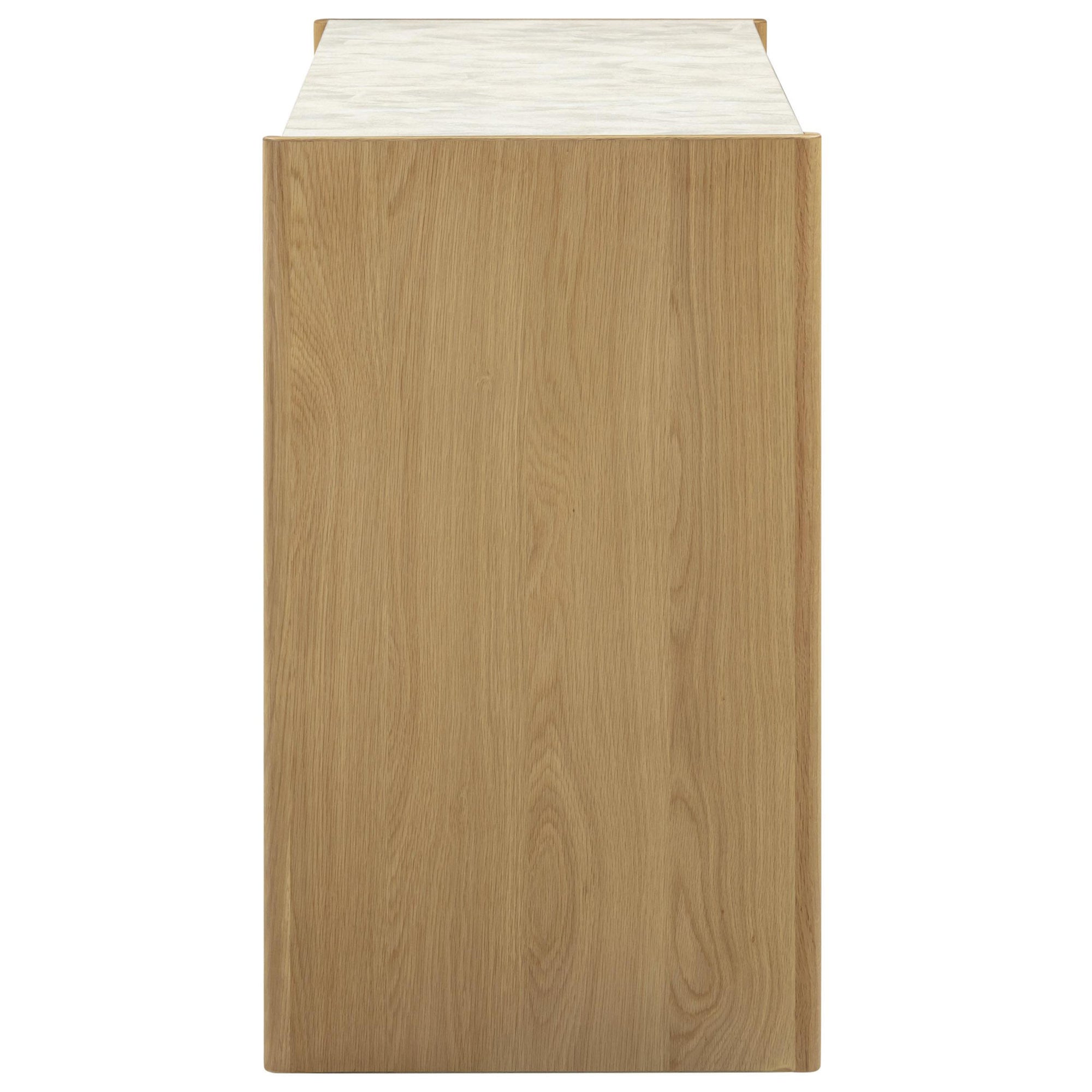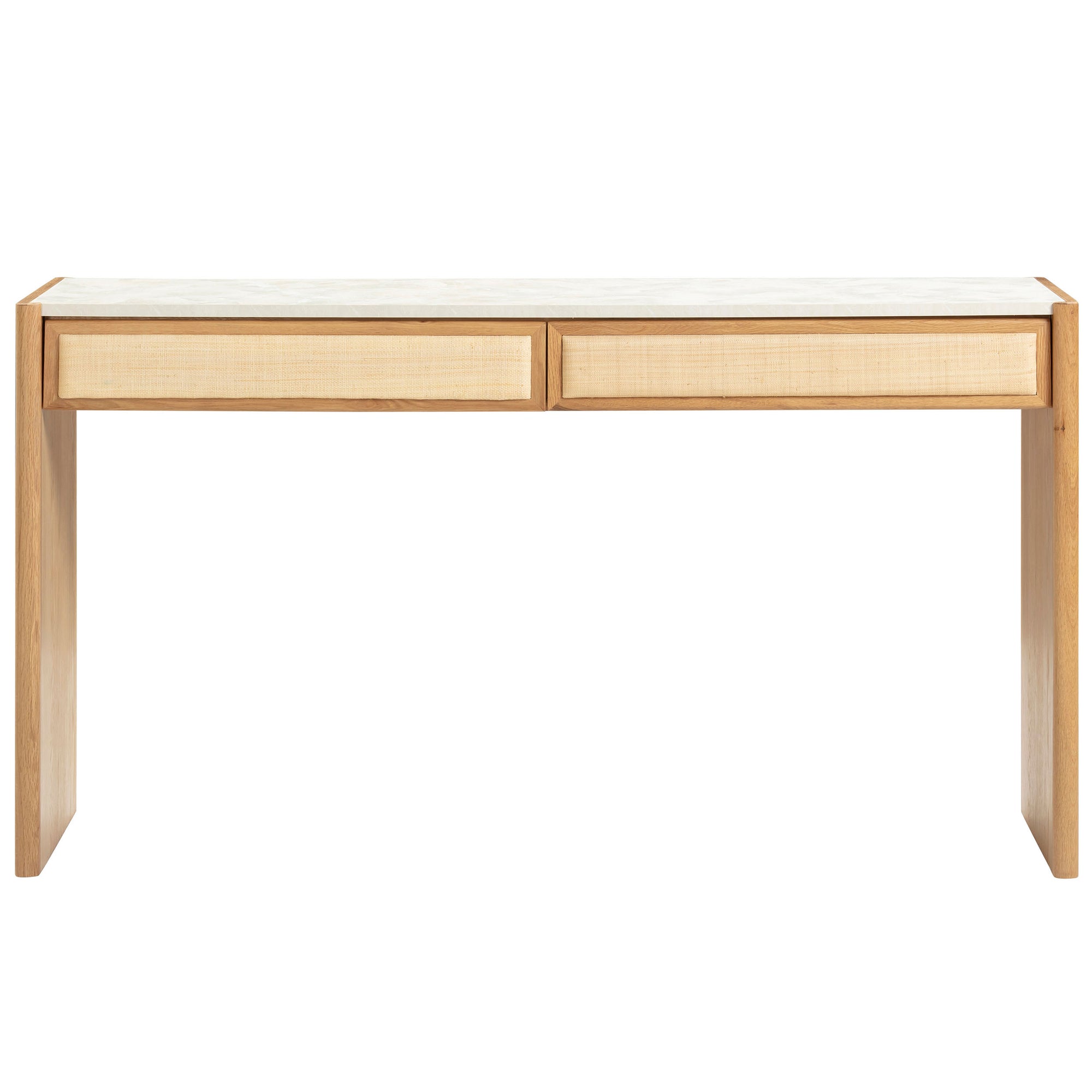 The Paige Console Desk, Natural, channels mid-century form with a tropical twist. Featuring solid white oak frames, padded raffia drawer fronts, and a faux-stone top, this desk combines clean design with practical storage. Soft-close, felt-lined drawers provide organized space for essentials, making it a stylish and functional addition to any entryway or home office.