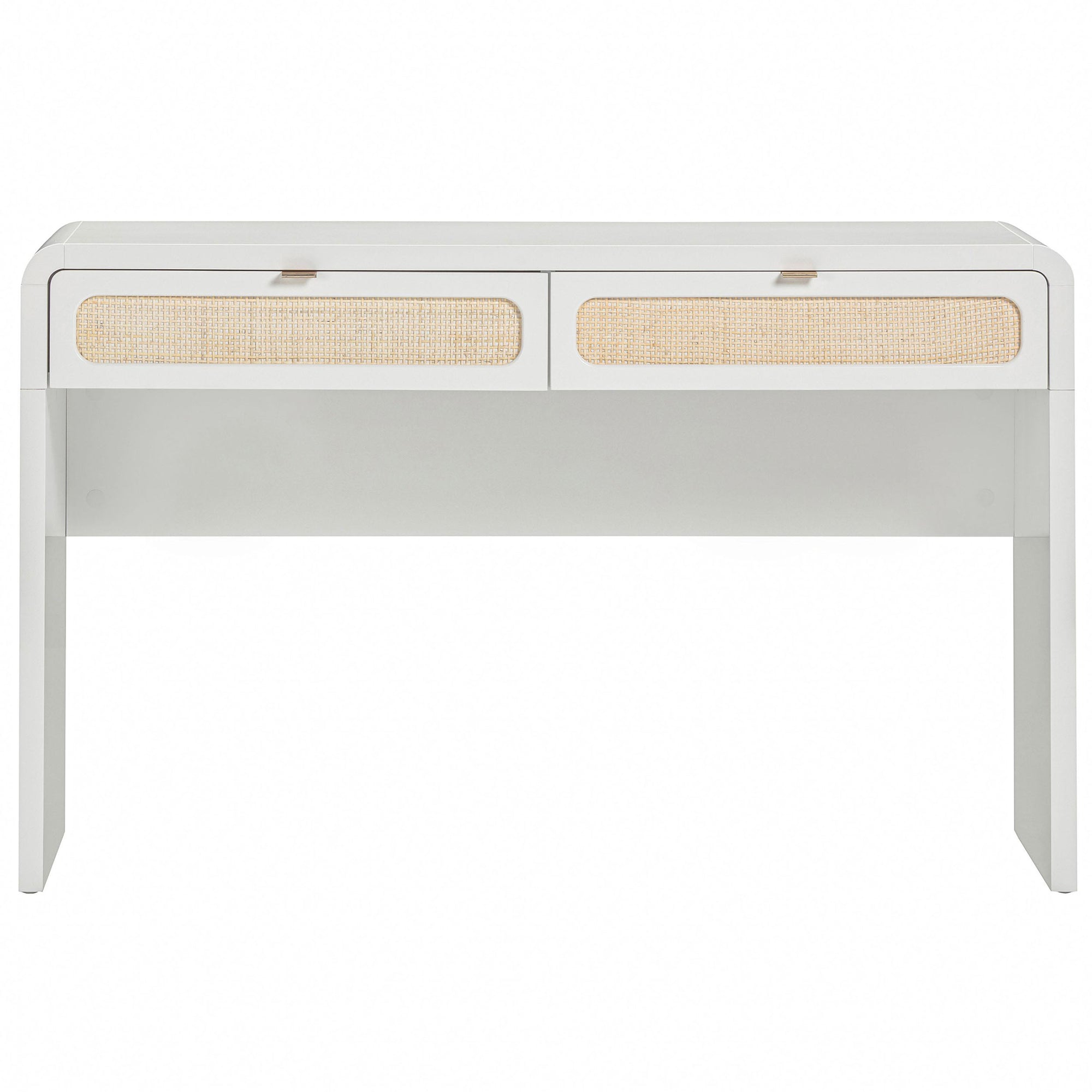 The Patty Rattan Console Desk, White, combines handwoven rattan, softly rounded silhouettes, and airy pastel charm. Featuring two whisper-quiet soft-close drawers and skillfully handmade construction, this console desk adds a breezy, vacation-at-home feel to bedrooms, guest spaces, or home offices.