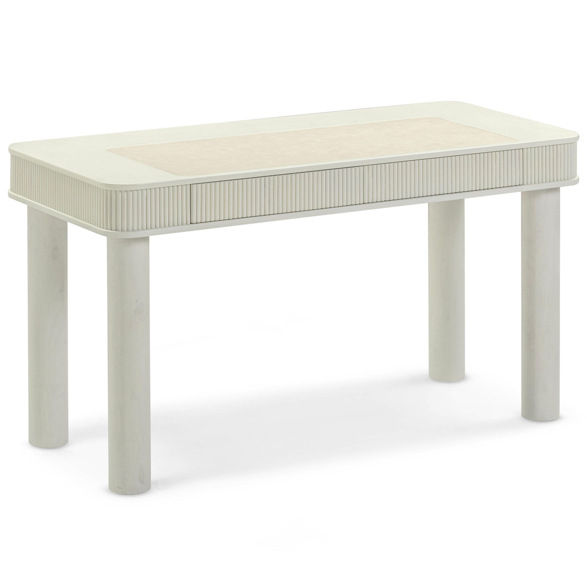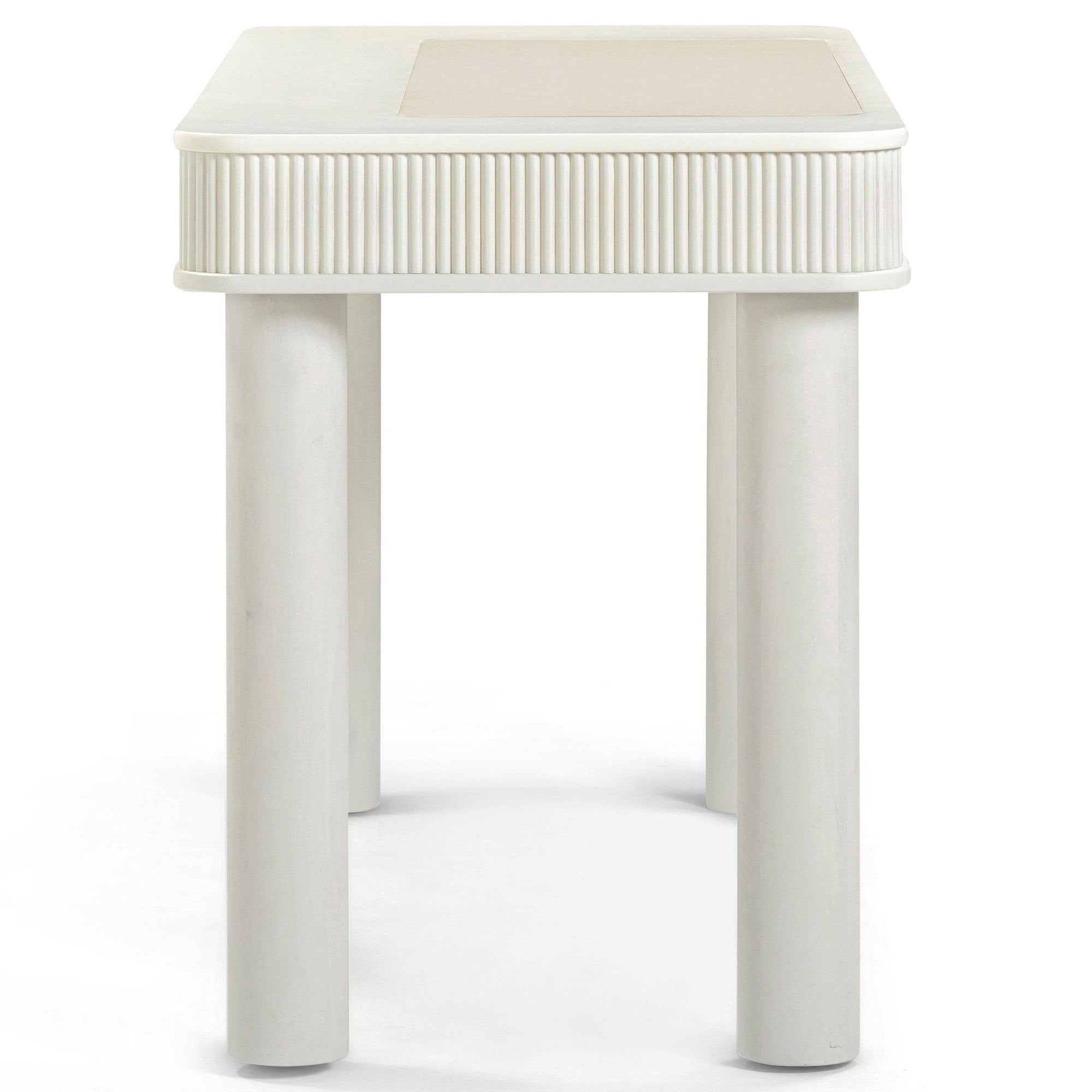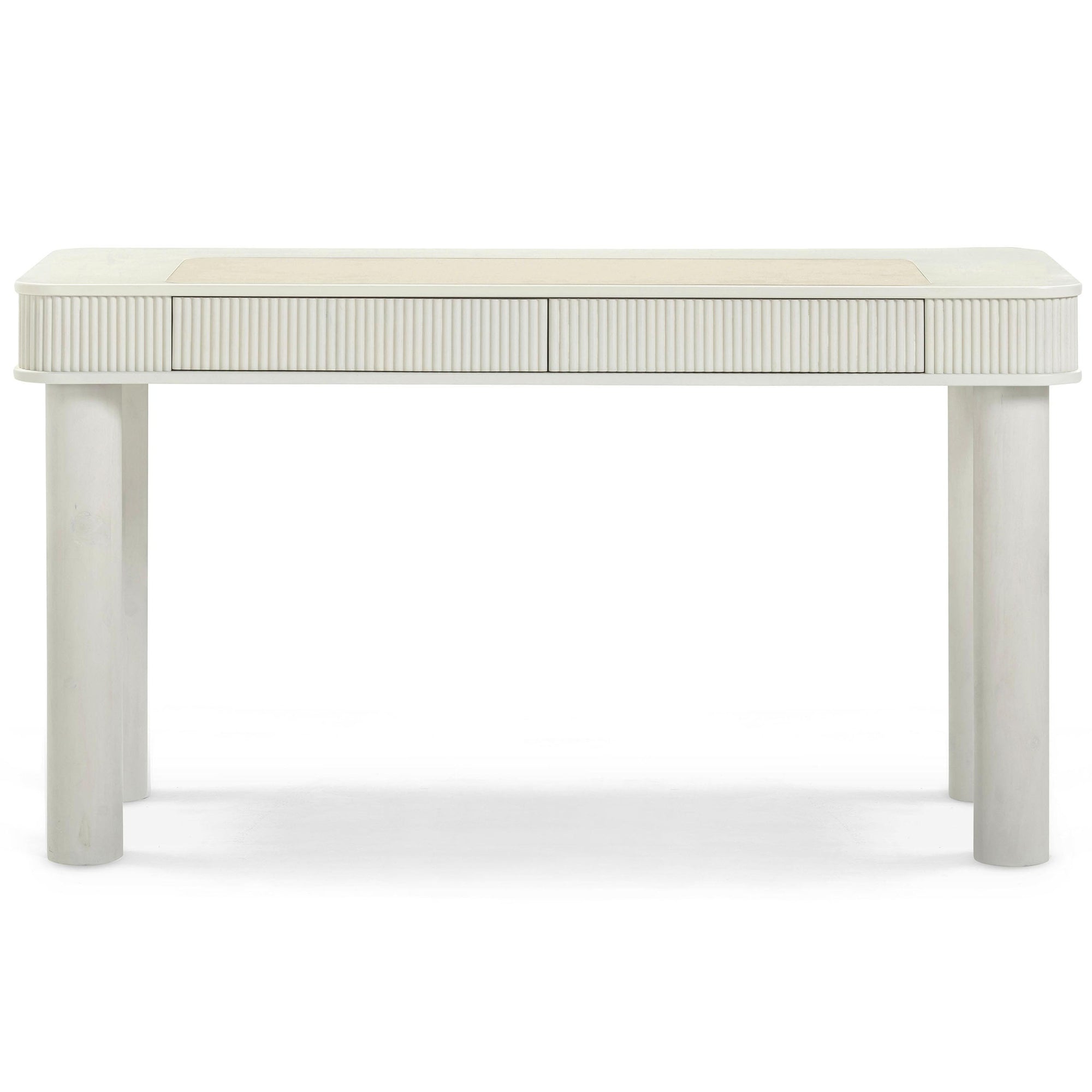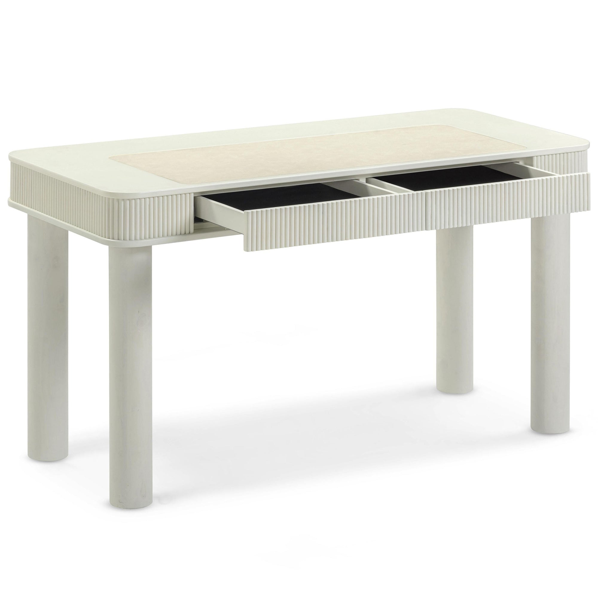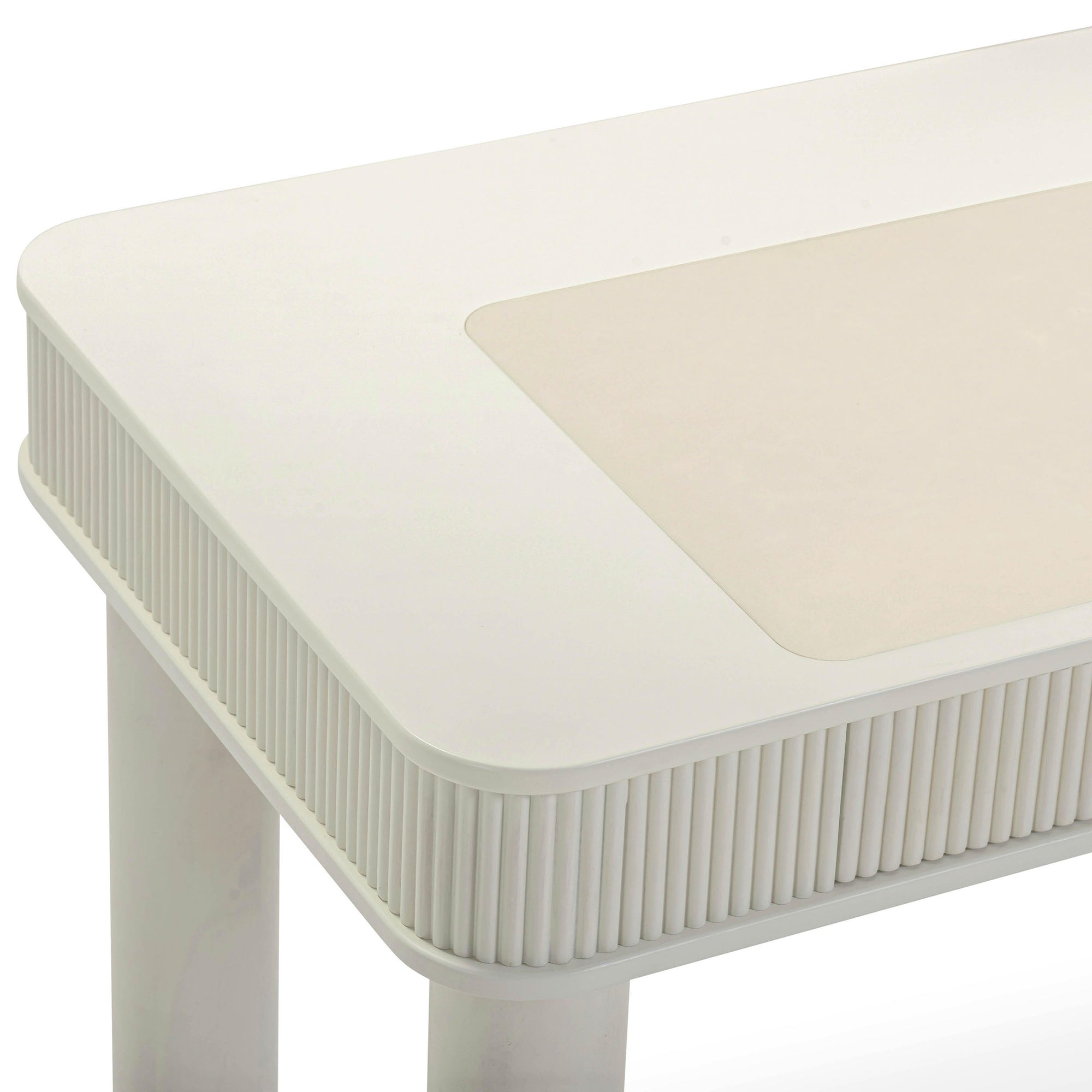 The Sarah Executive Work Desk, Cream, brings sculptural beauty to your workspace with fluted edging, thick pillar legs, and a fully finished back that stuns from every angle. Its marine grade vegan leather top wipes clean easily, while push-to-open drawers provide sleek, refined storage for your essentials. This desk blends functionality with elegant design, creating a statement piece for any office.