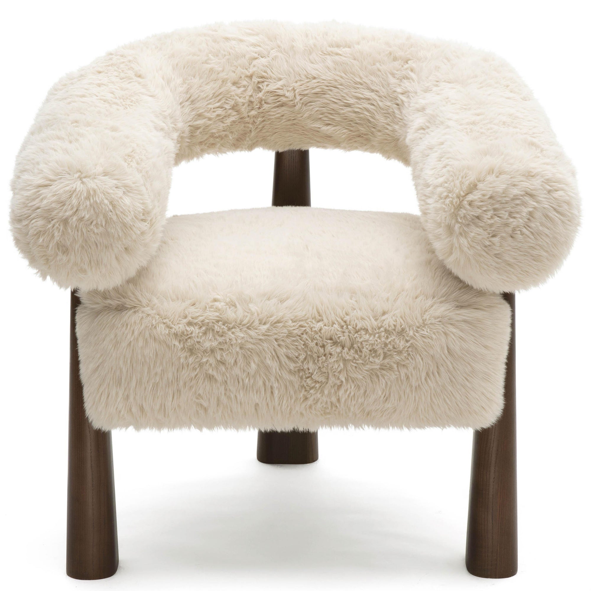 The Spara Vegan Shearling Accent Chair combines sculptural design with cozy comfort. Wrapped in soft, cruelty-free vegan shearling, it features a wide, chunky backrest and tapered natural ash wood legs for bold, lounge-worthy style. Perfect for adding plush elegance and a modern touch to any living space.