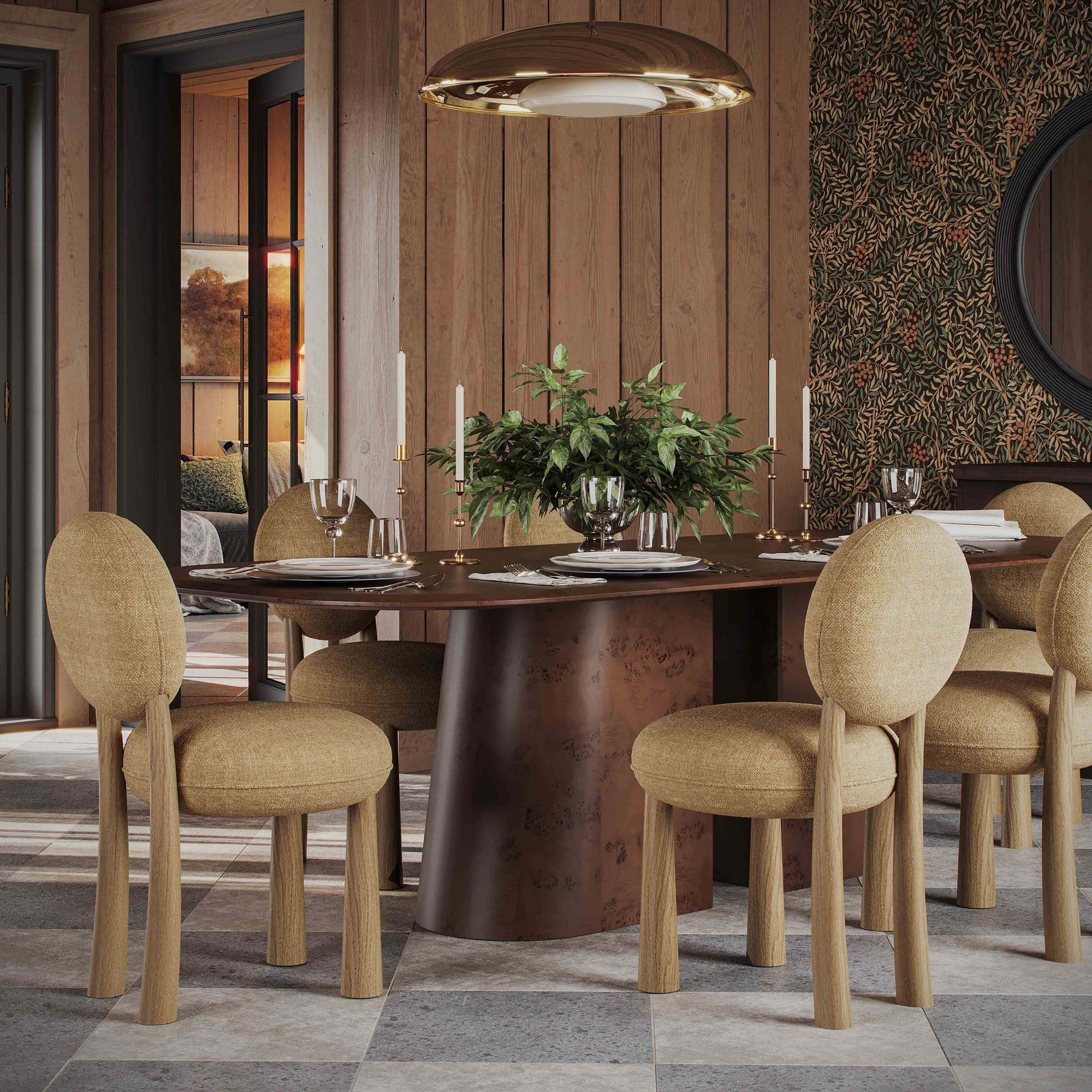 The Sulley Dining Chair, Honey combines playful design with functional comfort. Featuring a sturdy cushioned backrest and solid ash wood legs, these chairs bring charm and practicality to any dining space. Upholstered in durable performance fabric, they offer water-repellent and contract-grade durability while adding a touch of woodland whimsy to your table setting.