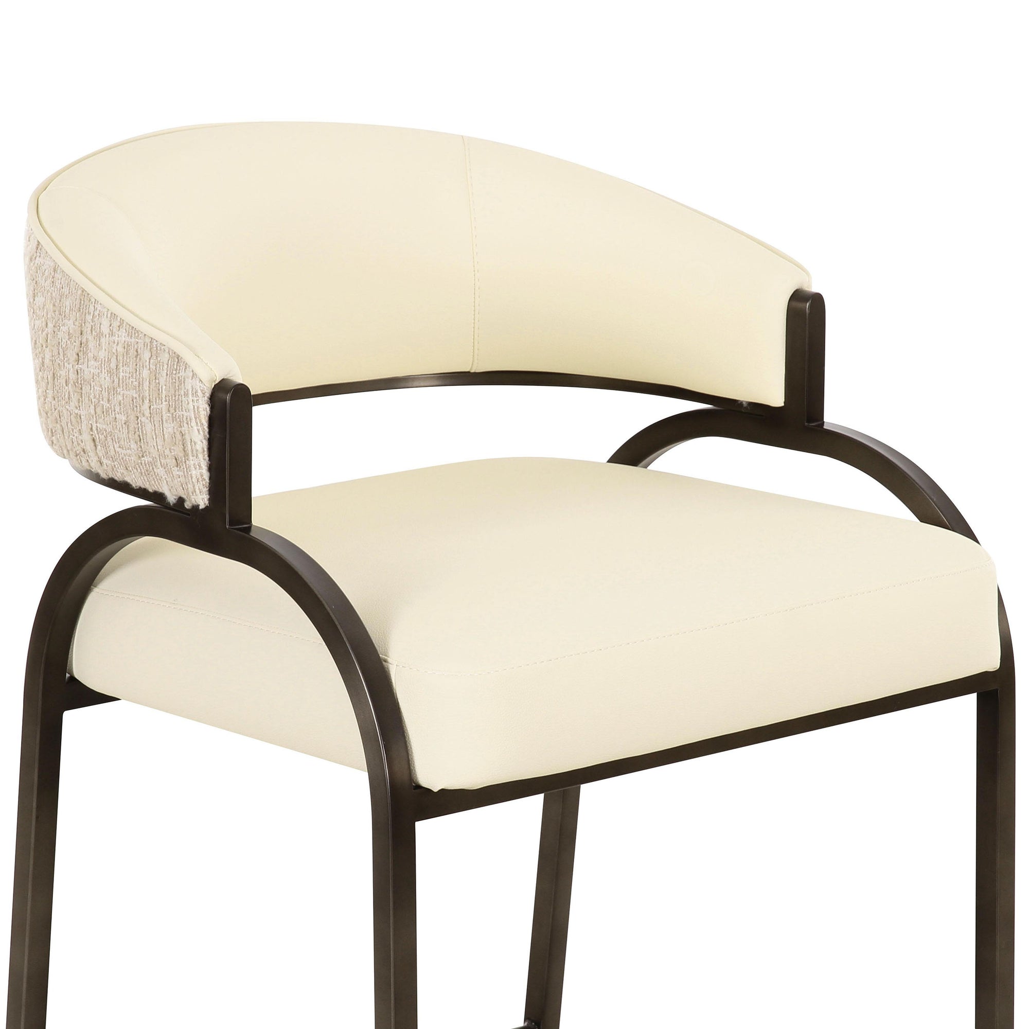 The Tatum 2-Tone Counter Stool, Cream, pairs sleek black iron with easy-to-clean cream vegan leather and textured fabric for a stylish yet practical seating option. Designed for stress-free use, this counter stool features liquid-repellent performance upholstery, sculptural silhouettes, and durable construction, bringing modern contrast and elevated comfort to any dining or kitchen space.
