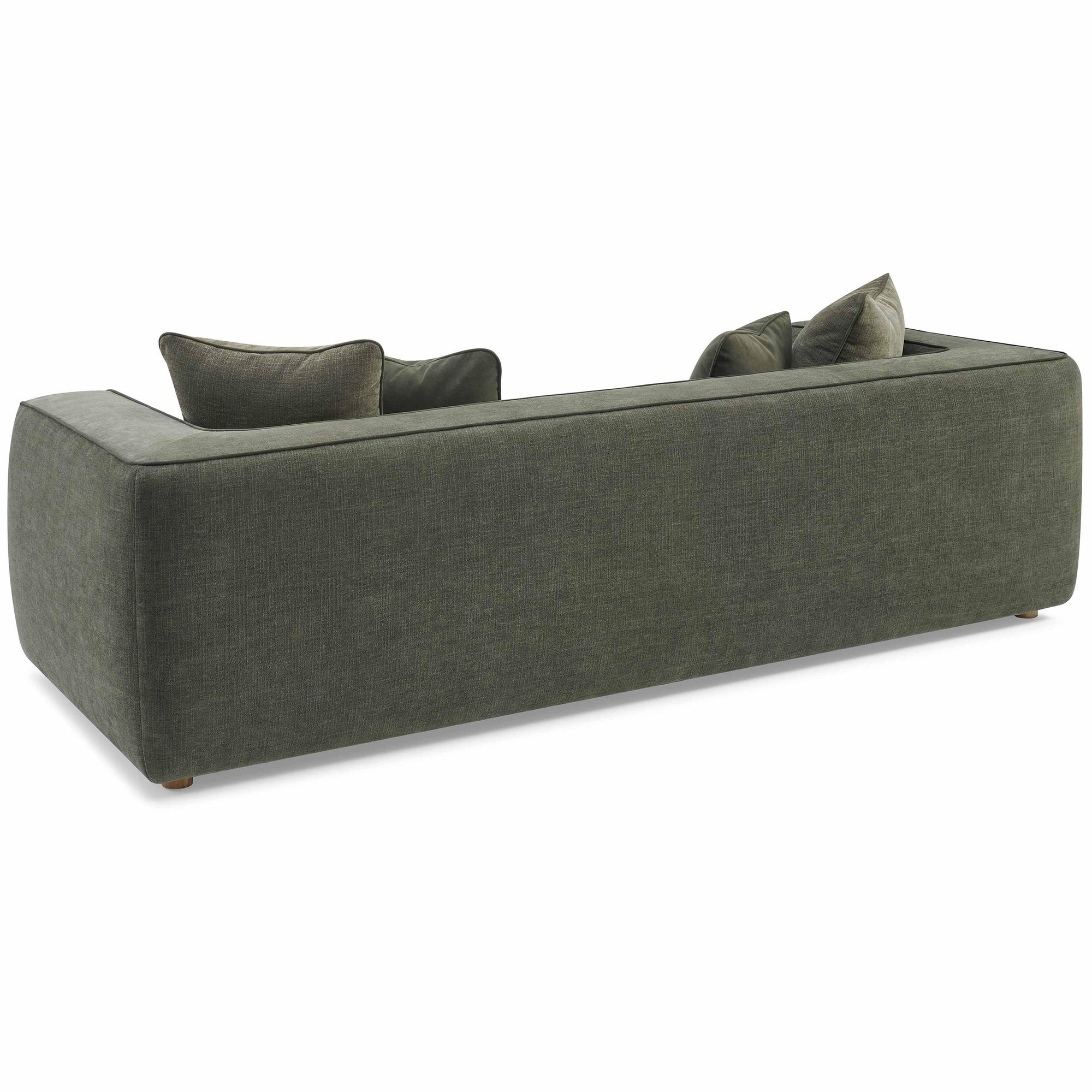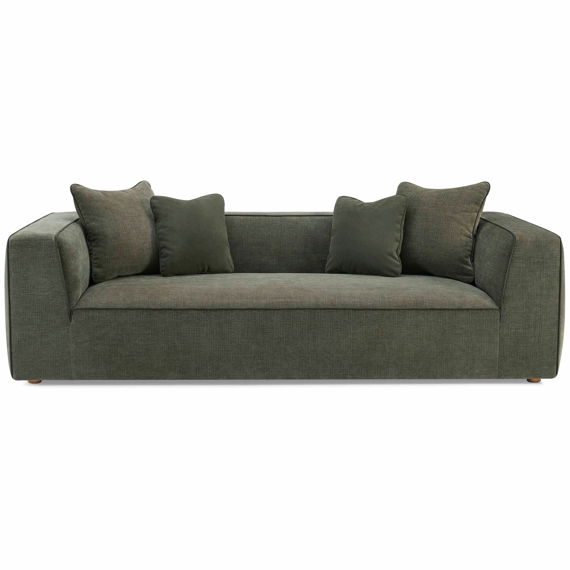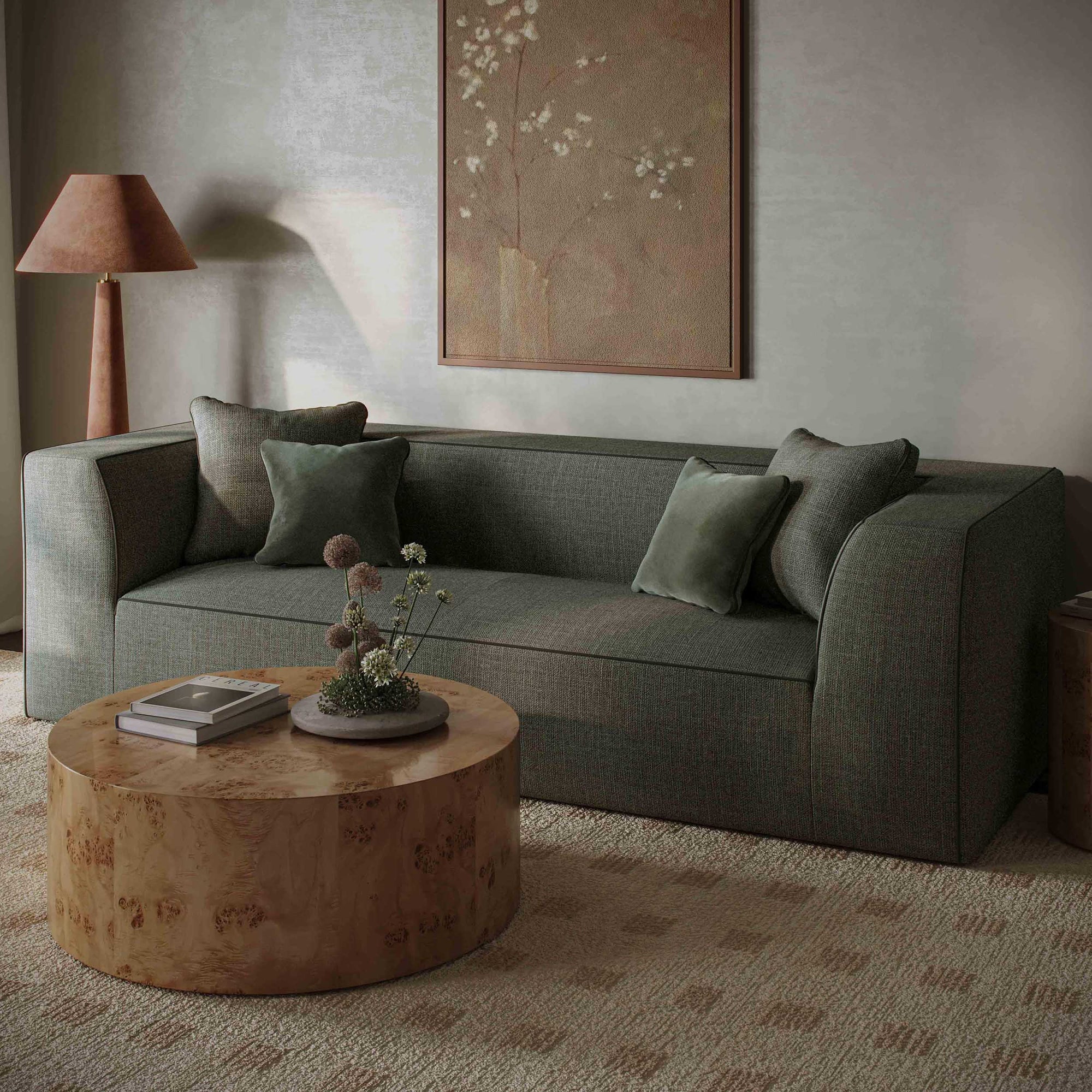 Bold and stylish, the Tristine Upcycled Basketweave Sofa in olive green is a sleek yet formidable addition to your living room. Deep and highly cushioned, this European silhouette is modified for US comfort and comes with heavy accent pillows of ethical synthetic down fibers. Lined with contrasted piping, the mixture of materials is on-trend and perfect as a centerpiece or against a corner. Every face is rounded, padded, and covered in high-density foam for lasting comfort.